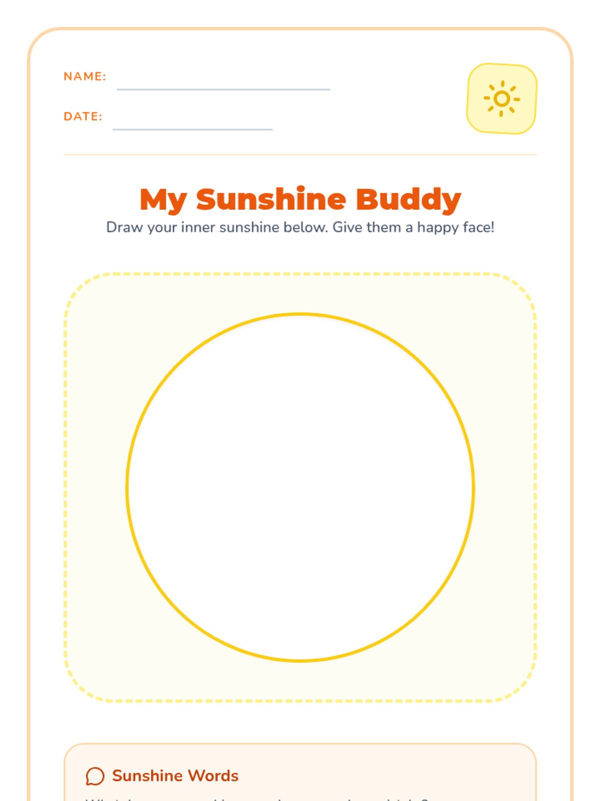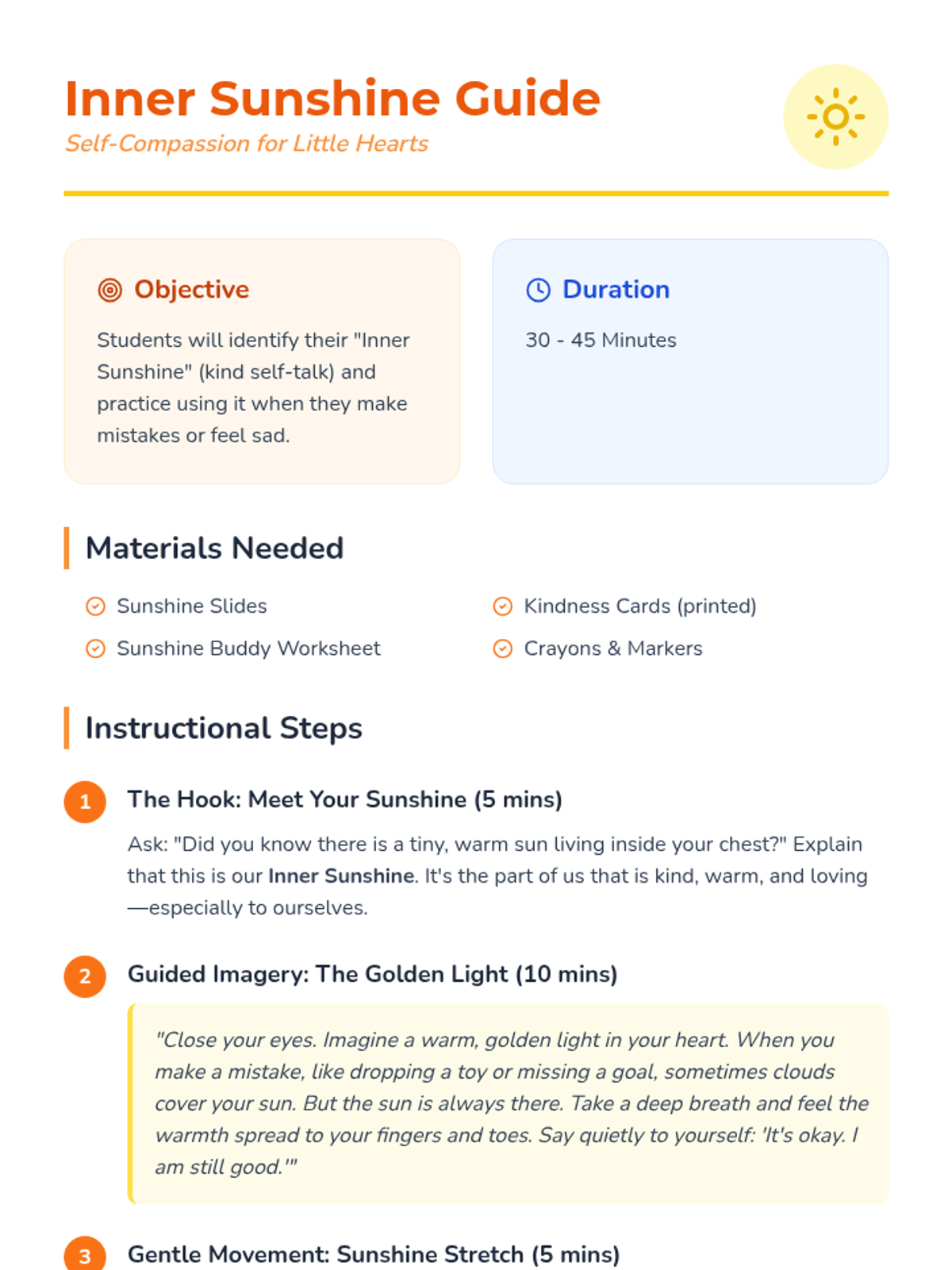 A gentle social-emotional learning lesson for Pre-K to 1st grade students to develop self-compassion and a positive inner voice. Students learn to nurture their 'inner sunshine' through guided imagery, affirmations, and movement.