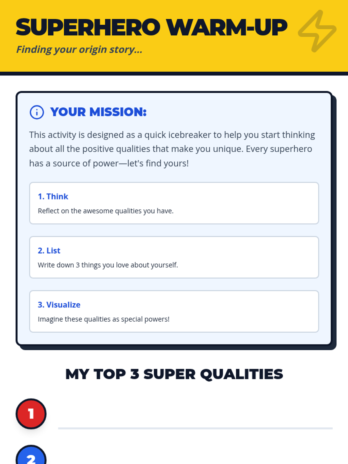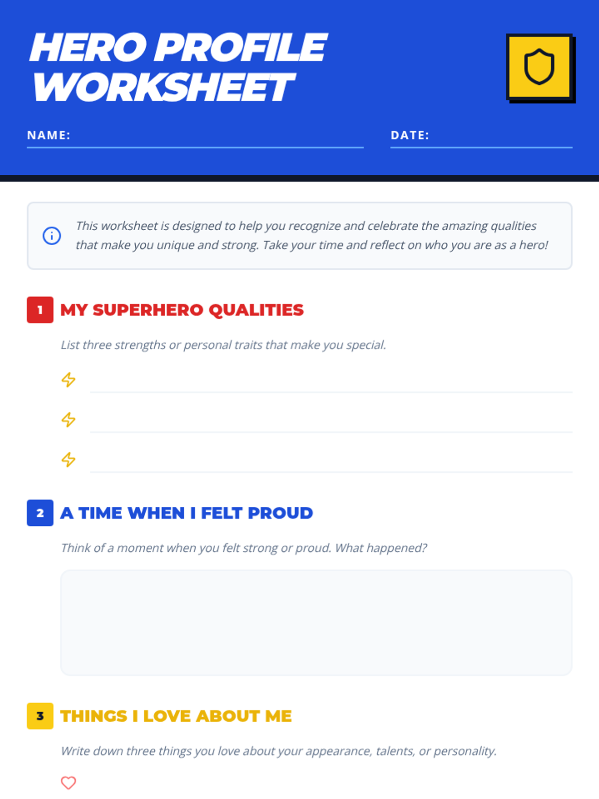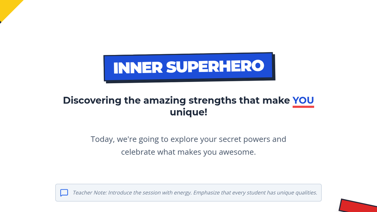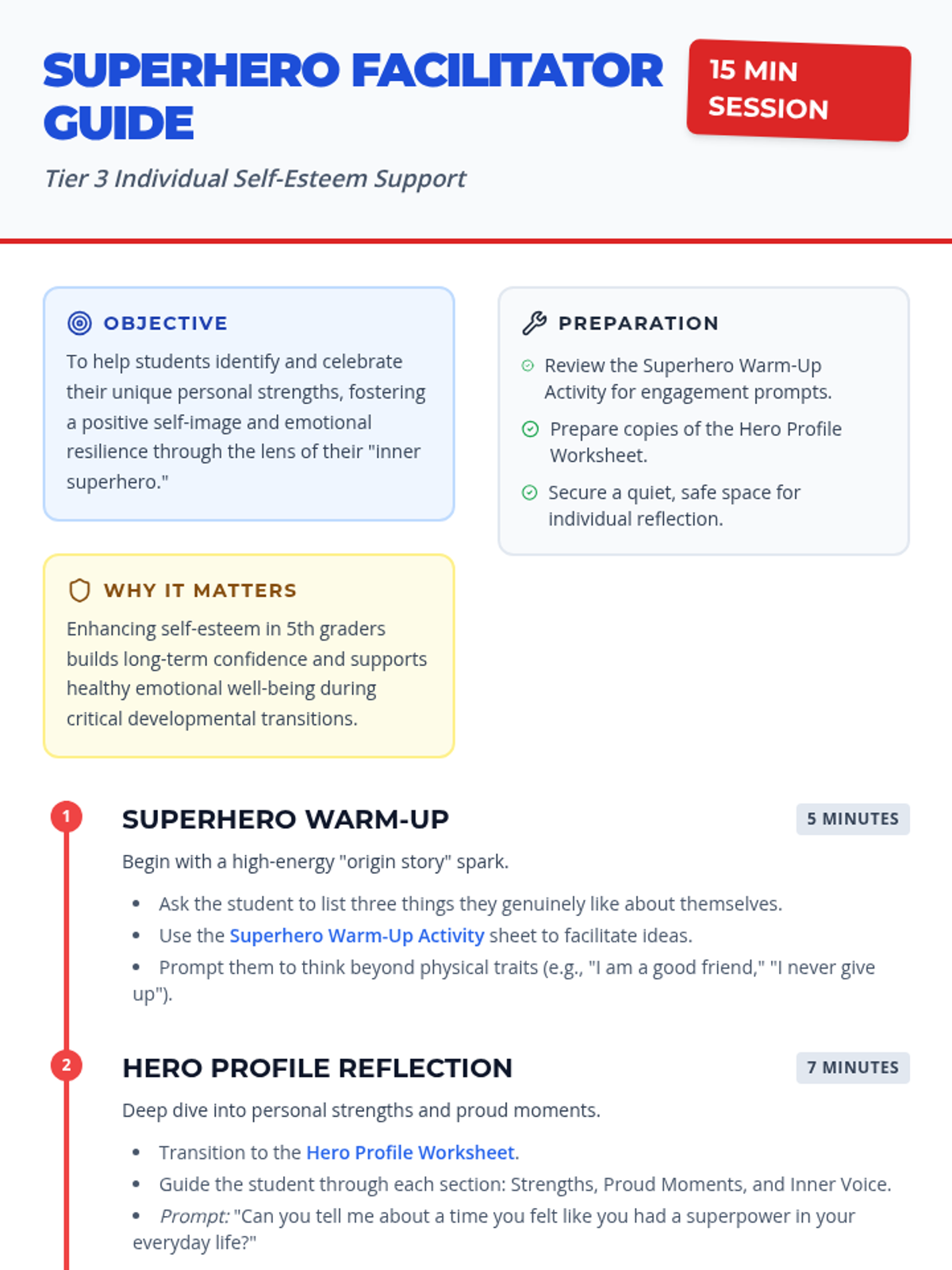 A Tier 3 individual support lesson for 5th graders focused on boosting self-esteem by identifying unique personal strengths and superhero-like qualities.