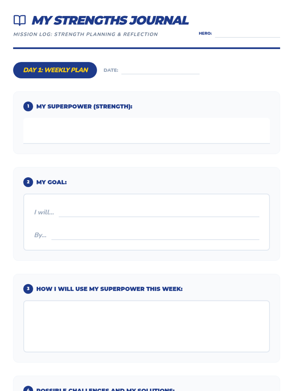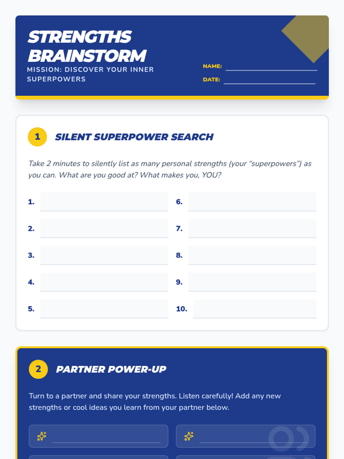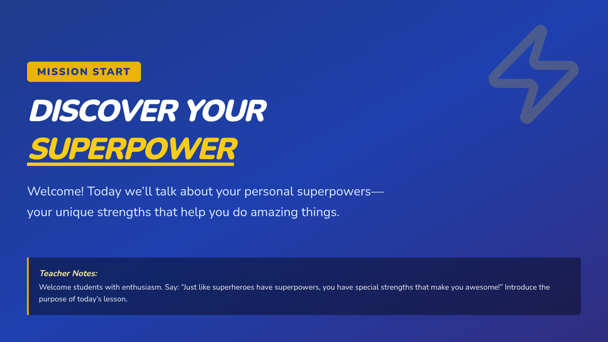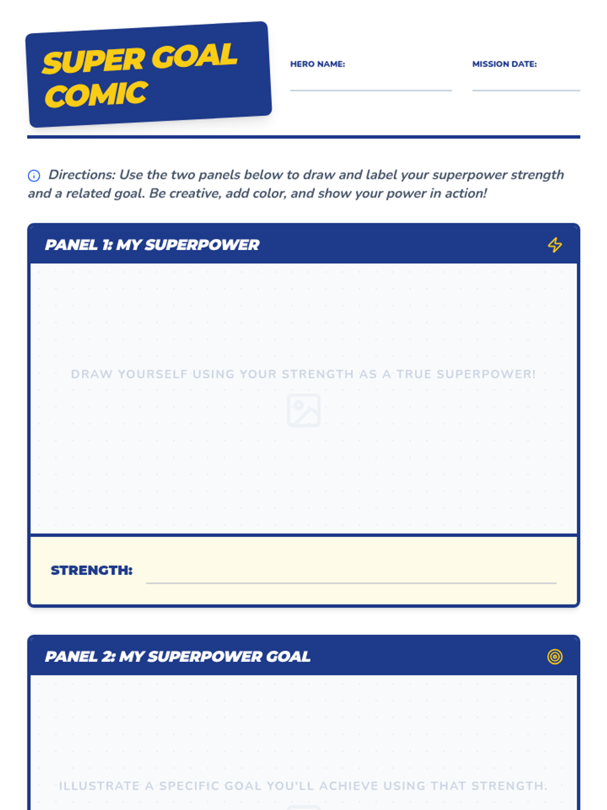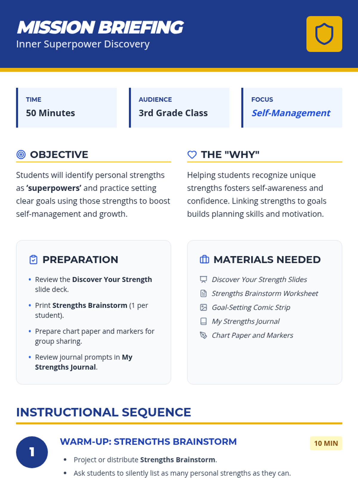 A 50-minute Tier 1 lesson for 3rd graders focused on identifying personal strengths as 'superpowers' and using them to set actionable goals for self-management.