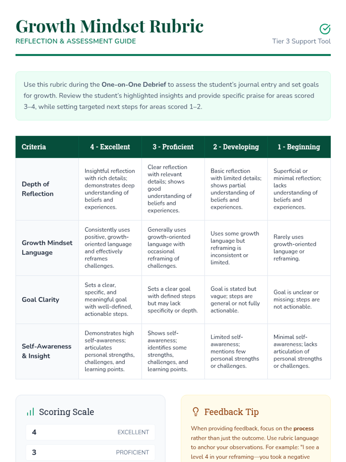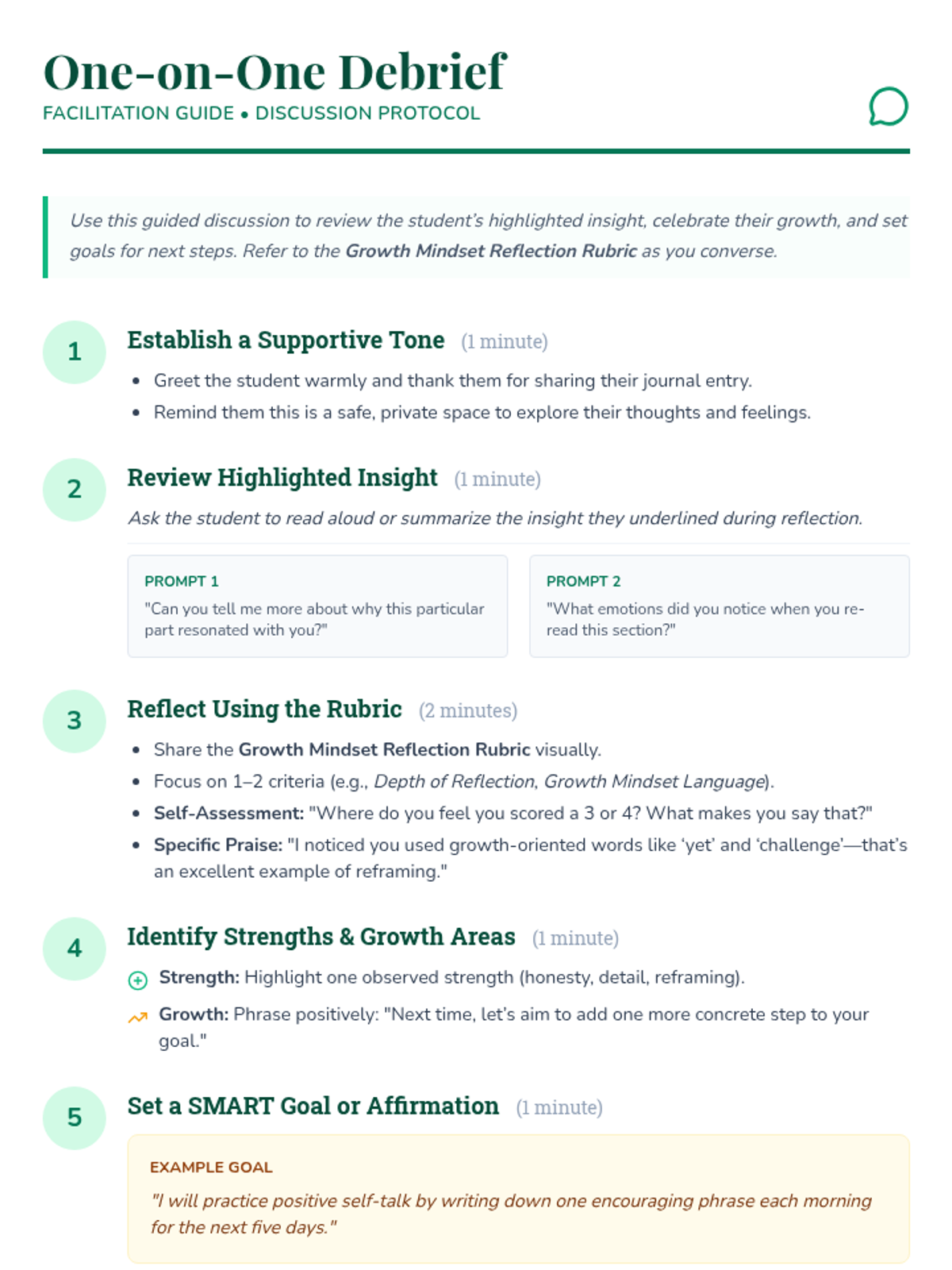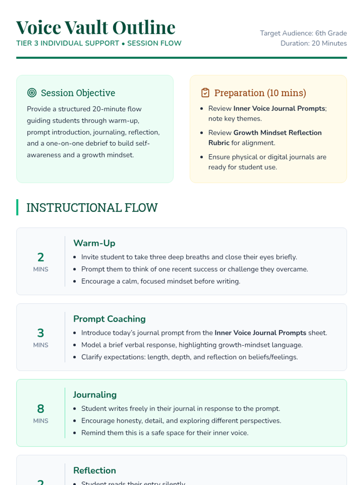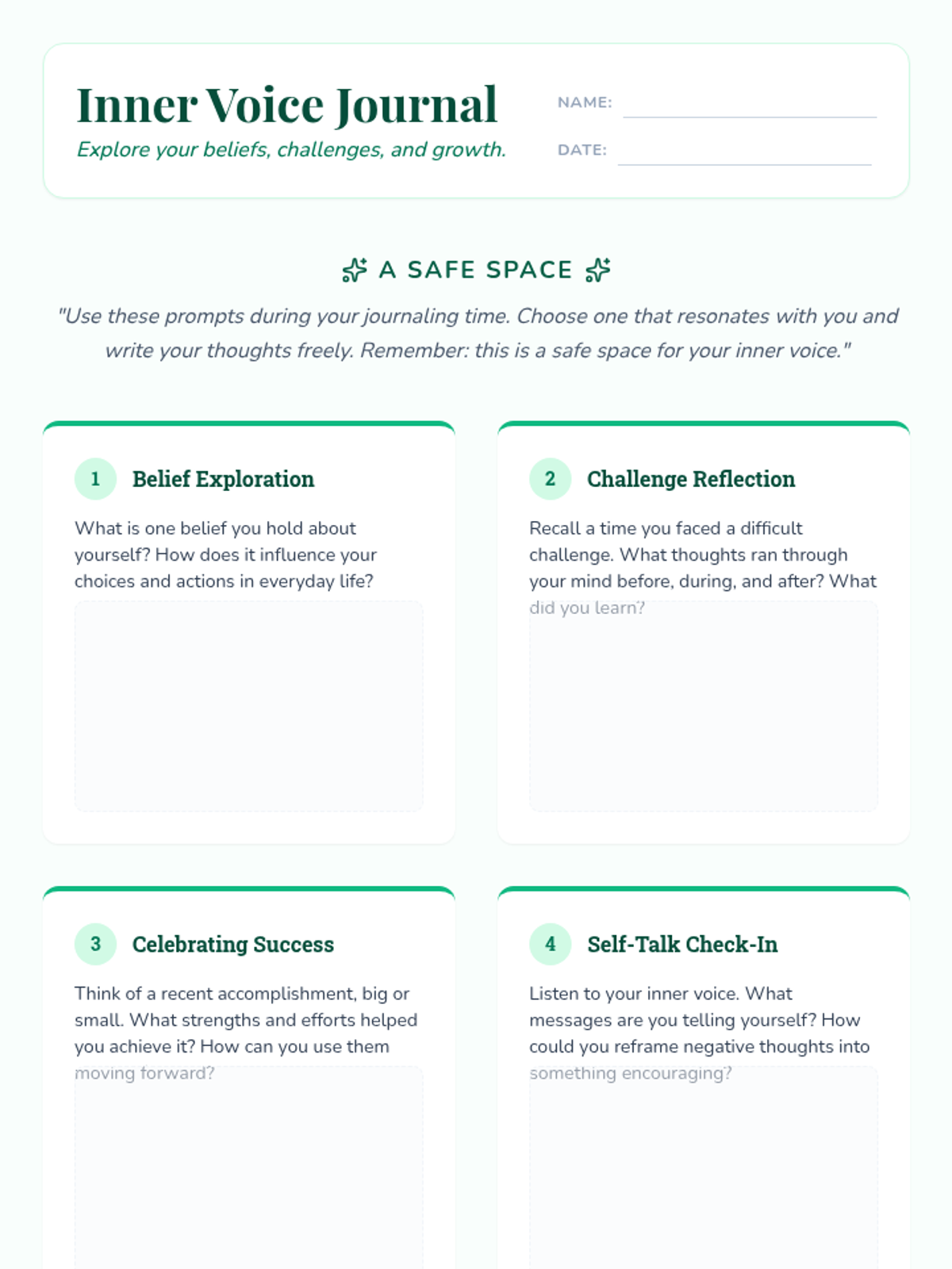 An individualized journal-based program guiding 6th grade students to explore their beliefs, mindsets, and growth through structured writing prompts and one-on-one debriefs.