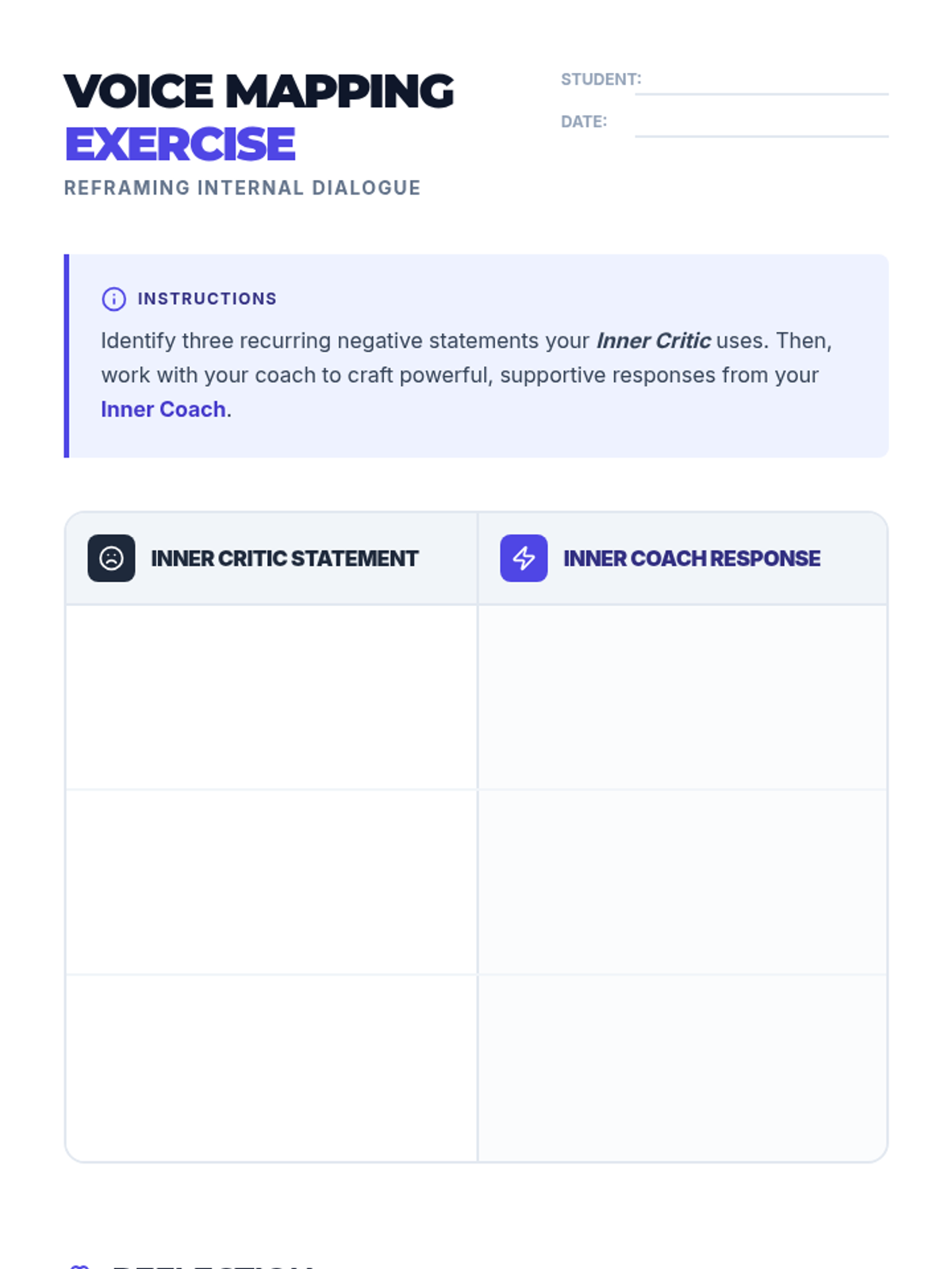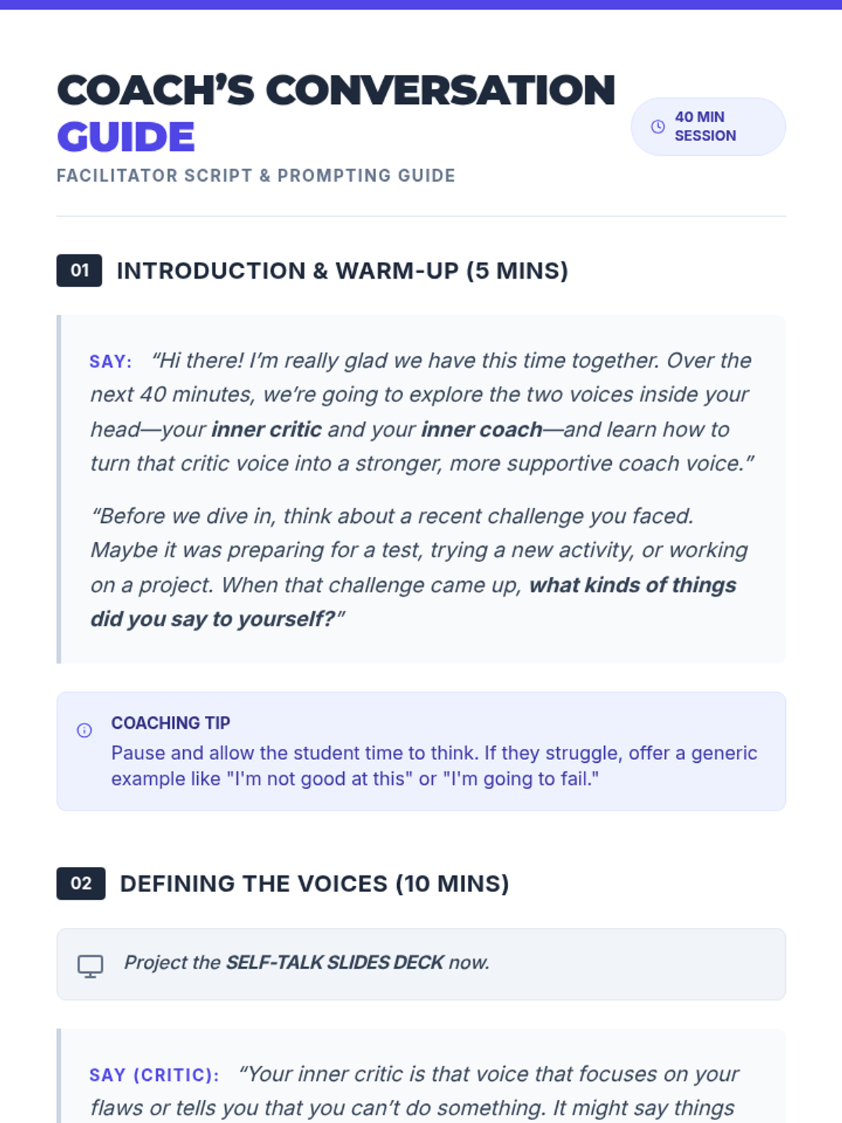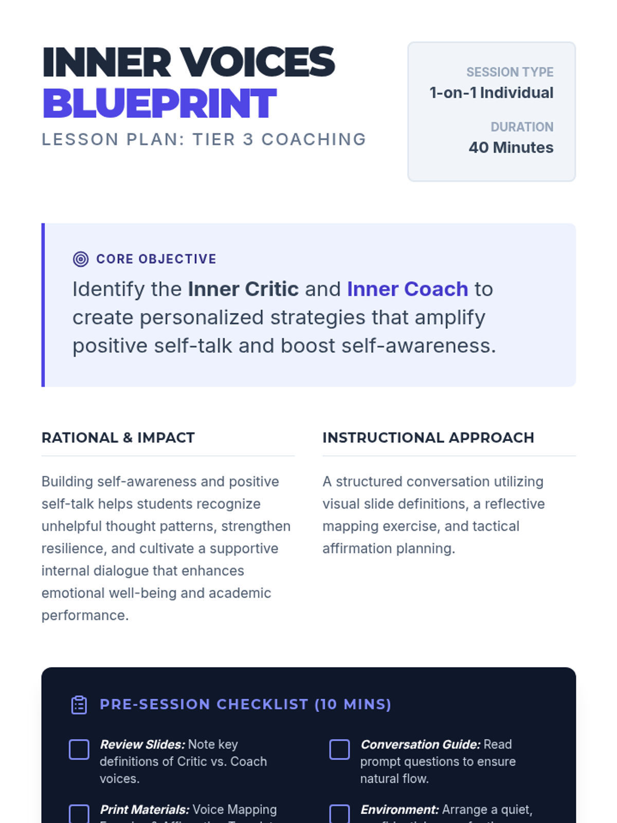 A personalized 40-minute Tier 3 coaching session for 10th-grade students to identify their inner critic, strengthen their inner coach, and develop self-awareness through mapping and journaling.