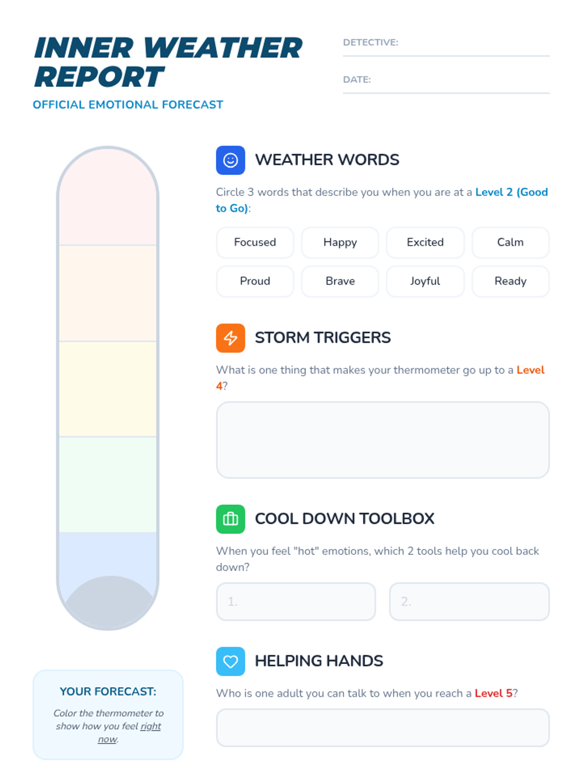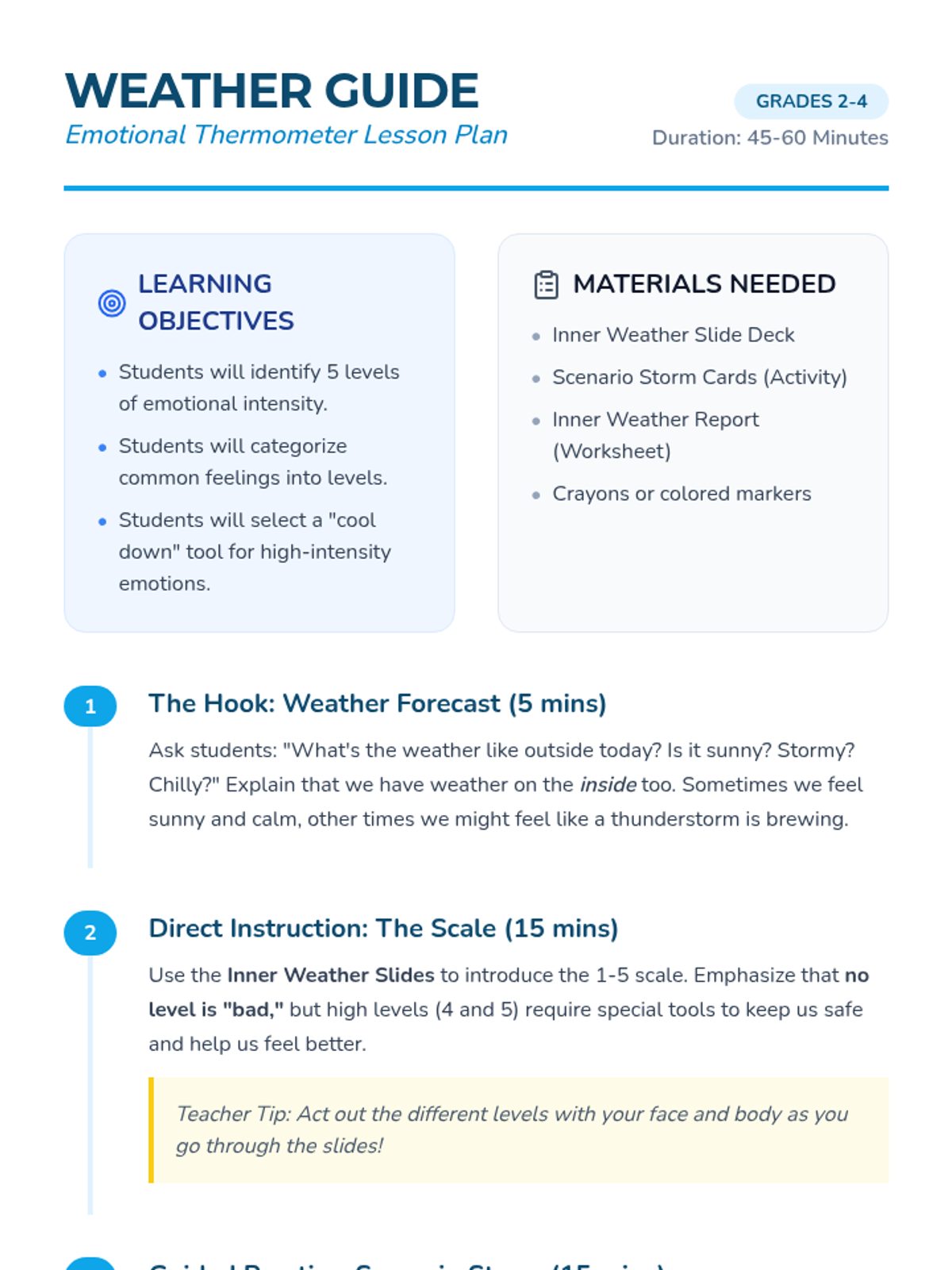 A lesson for 2nd-4th graders to explore emotional intensity using a thermometer metaphor, helping them identify, label, and communicate their 'inner weather' across different scenarios.