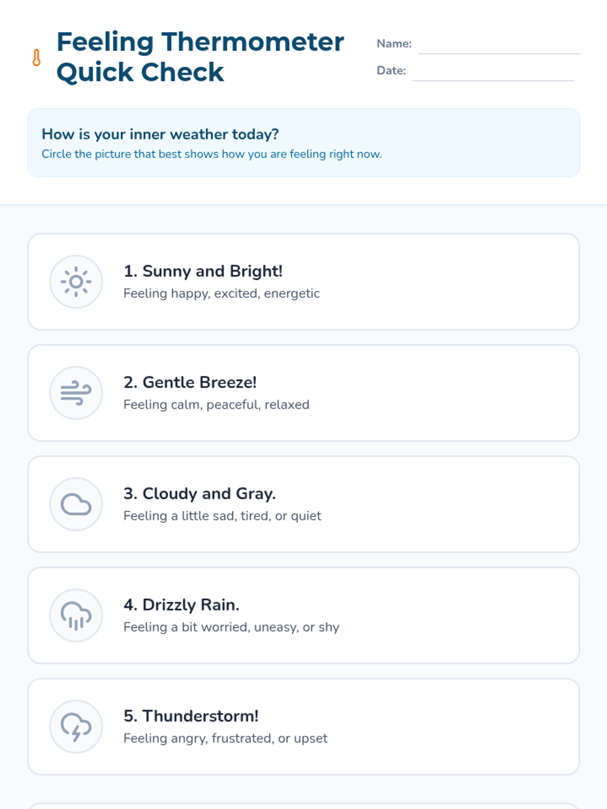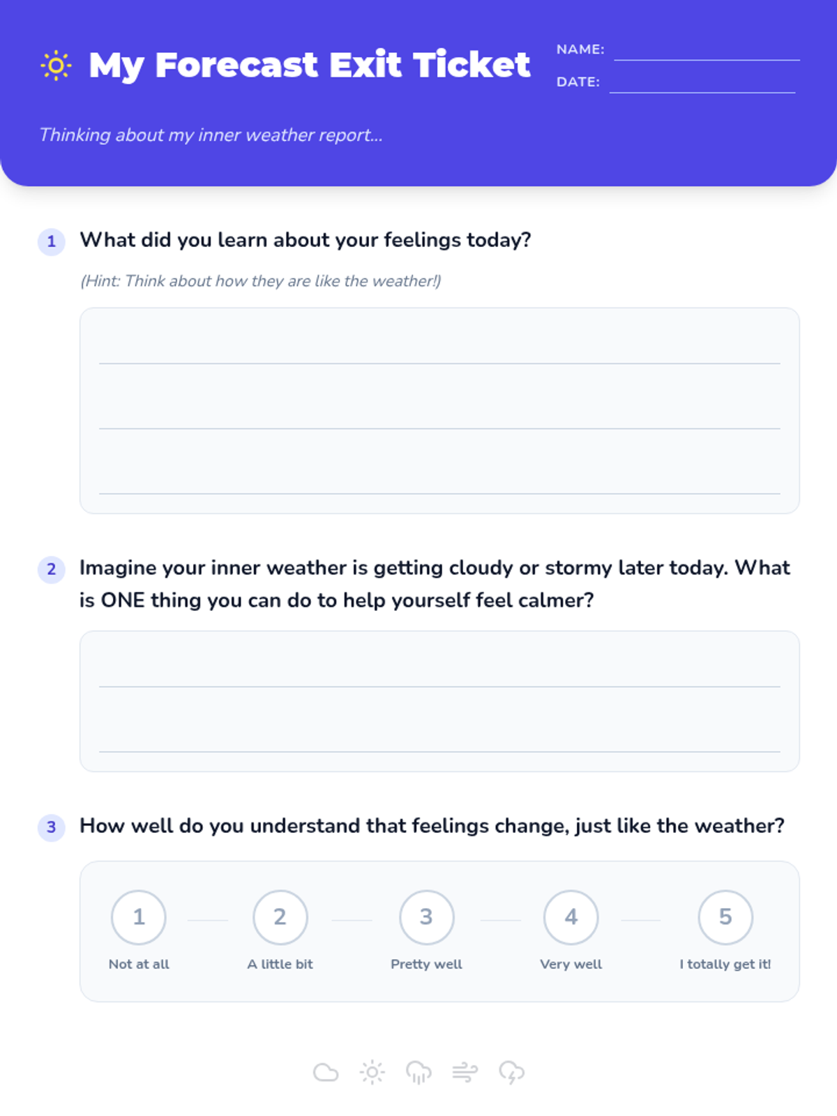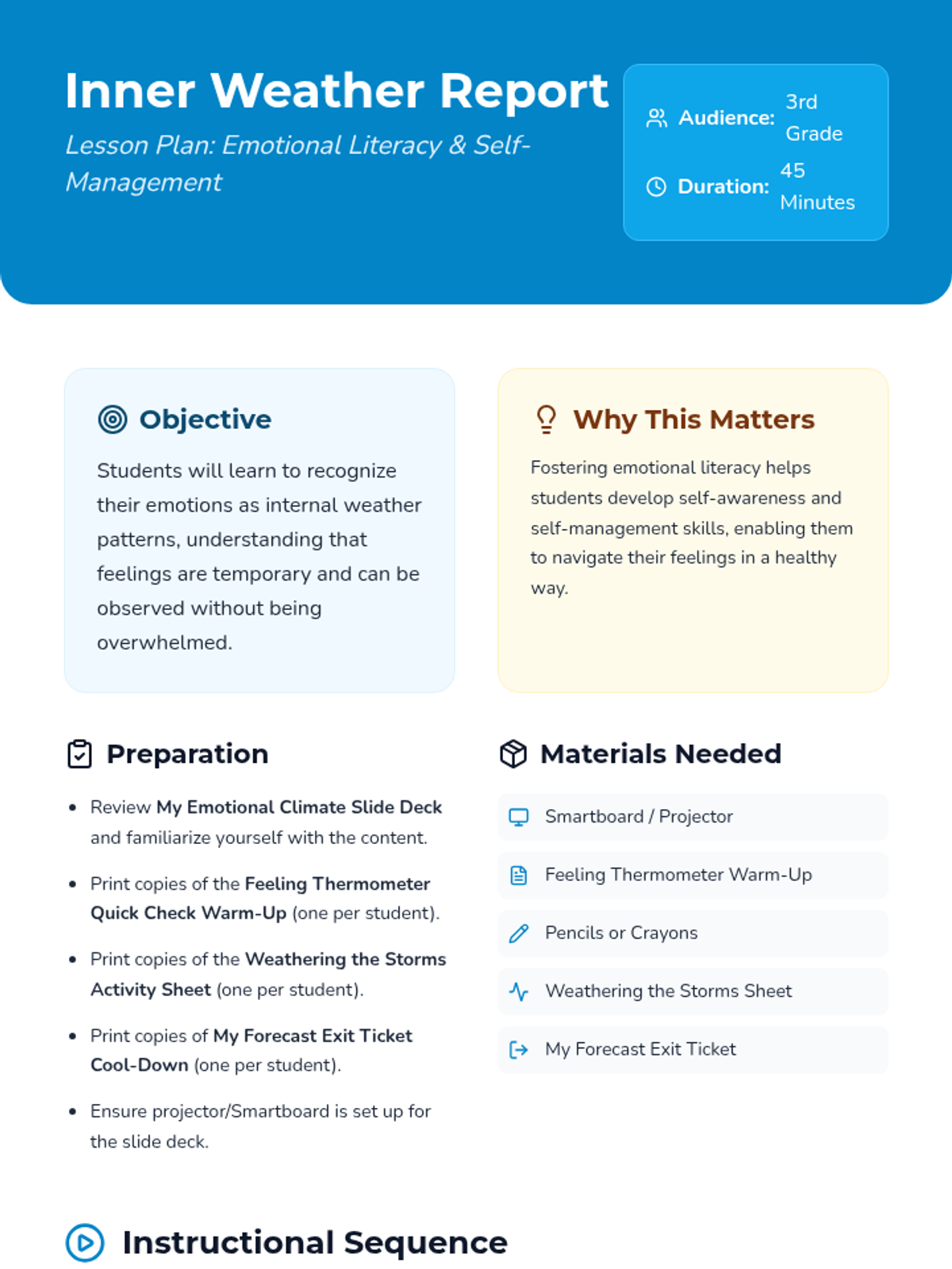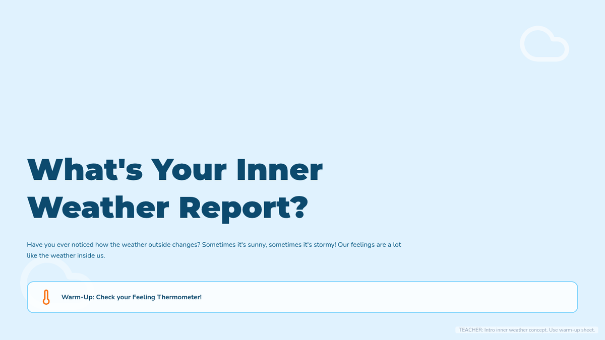 This lesson introduces 3rd-grade students to emotional literacy using a weather analogy. Students learn that feelings, like weather, are temporary patterns that can be observed and managed using simple calming strategies.