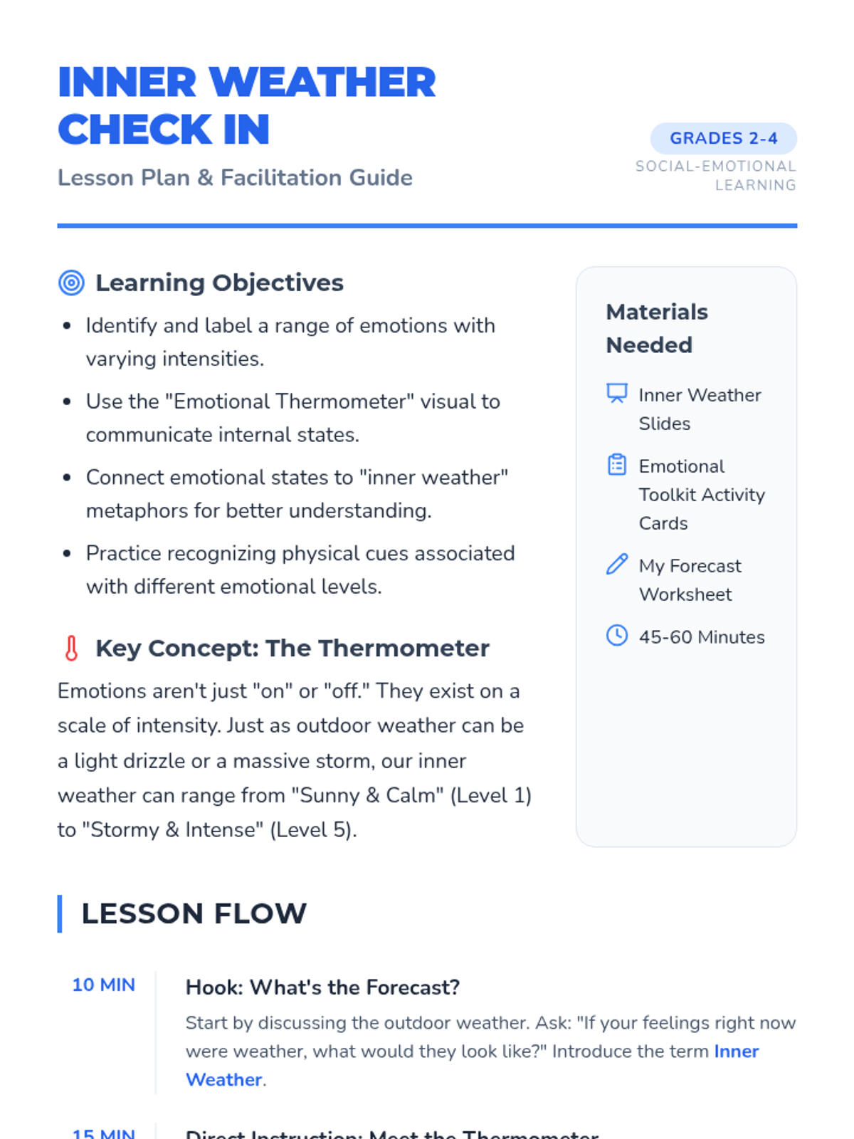 This lesson helps 2nd-4th grade students identify and label emotions using a thermometer visual. Students explore the intensity of feelings through 'inner weather' metaphors, practicing emotional regulation and communication.