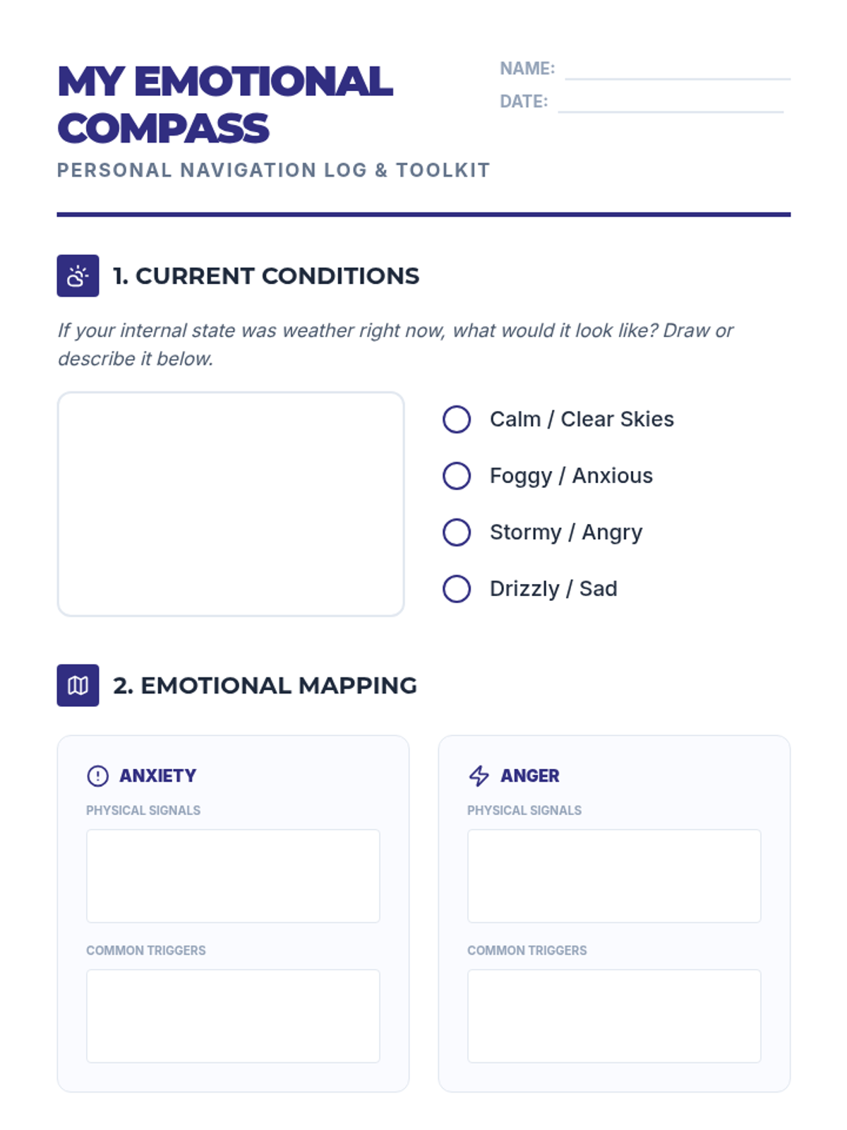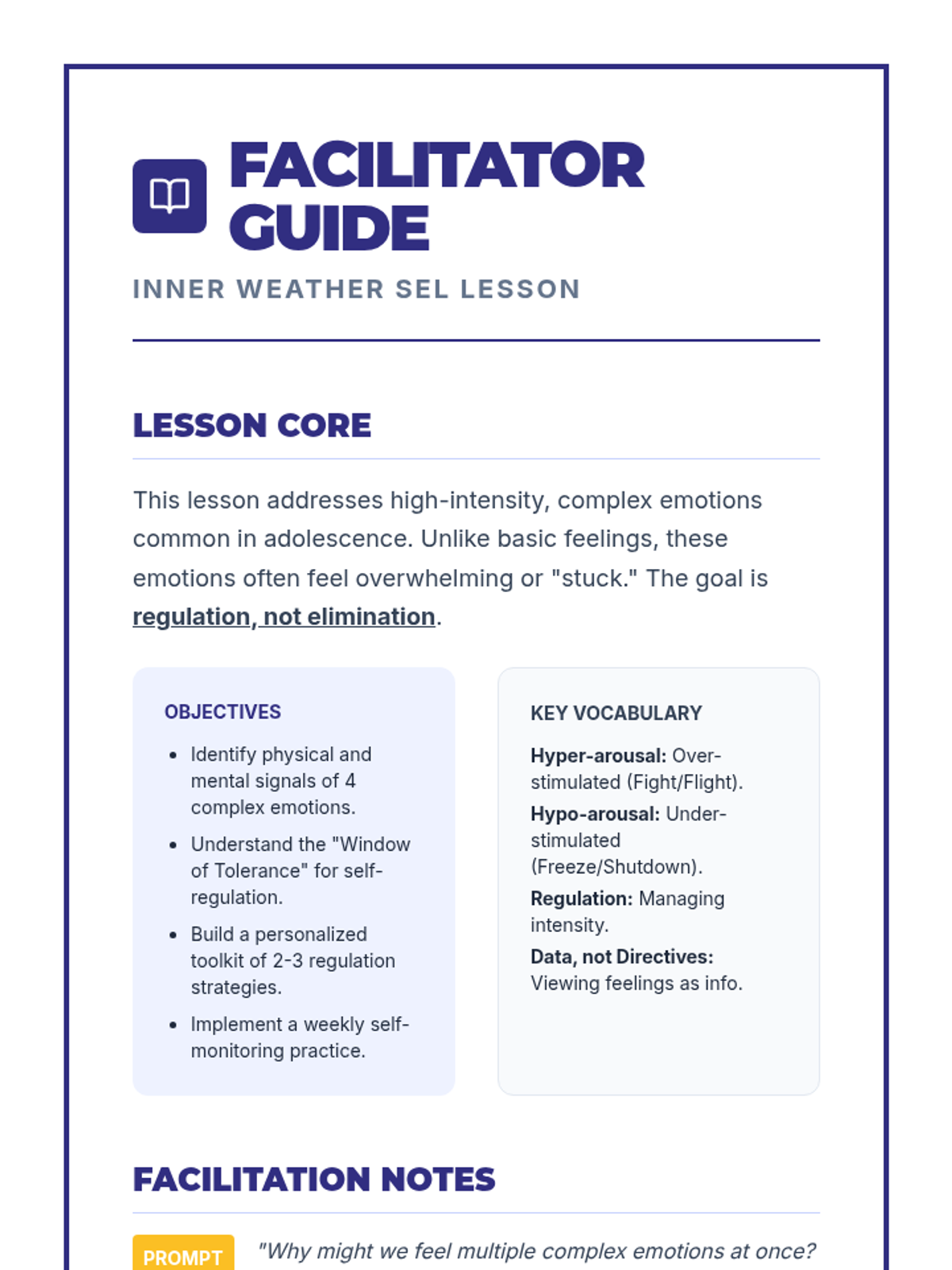 A high school social-emotional lesson focused on identifying and managing complex emotions like anxiety, grief, anger, and overwhelm through self-monitoring and a personalized coping toolkit.