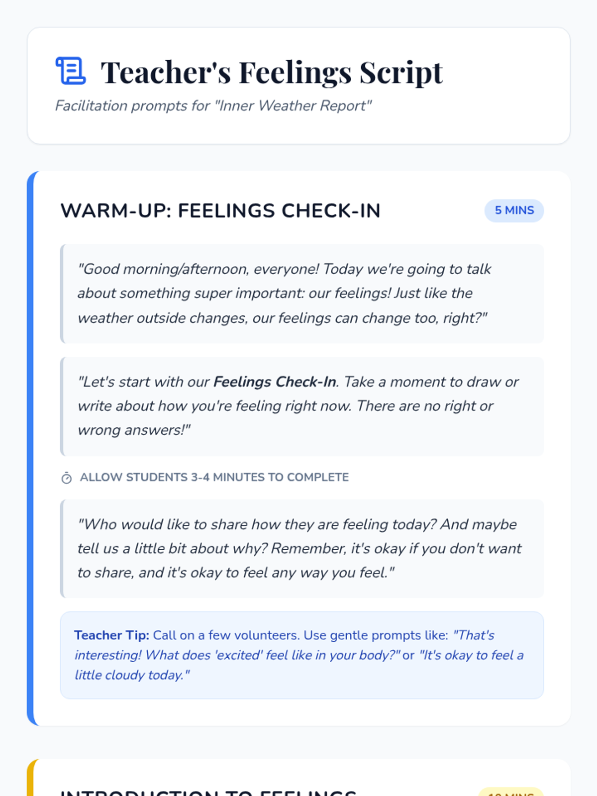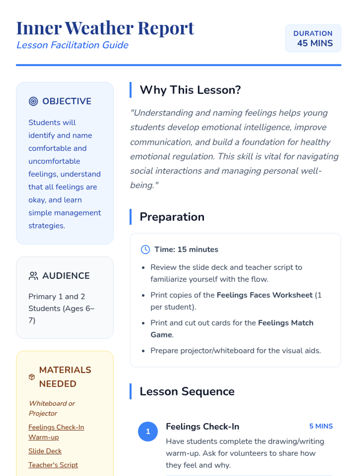 This lesson helps Primary 1 and 2 students identify and understand a range of comfortable and uncomfortable feelings using the metaphor of an 'inner weather report'. Students learn that all feelings are okay and practice simple management strategies.