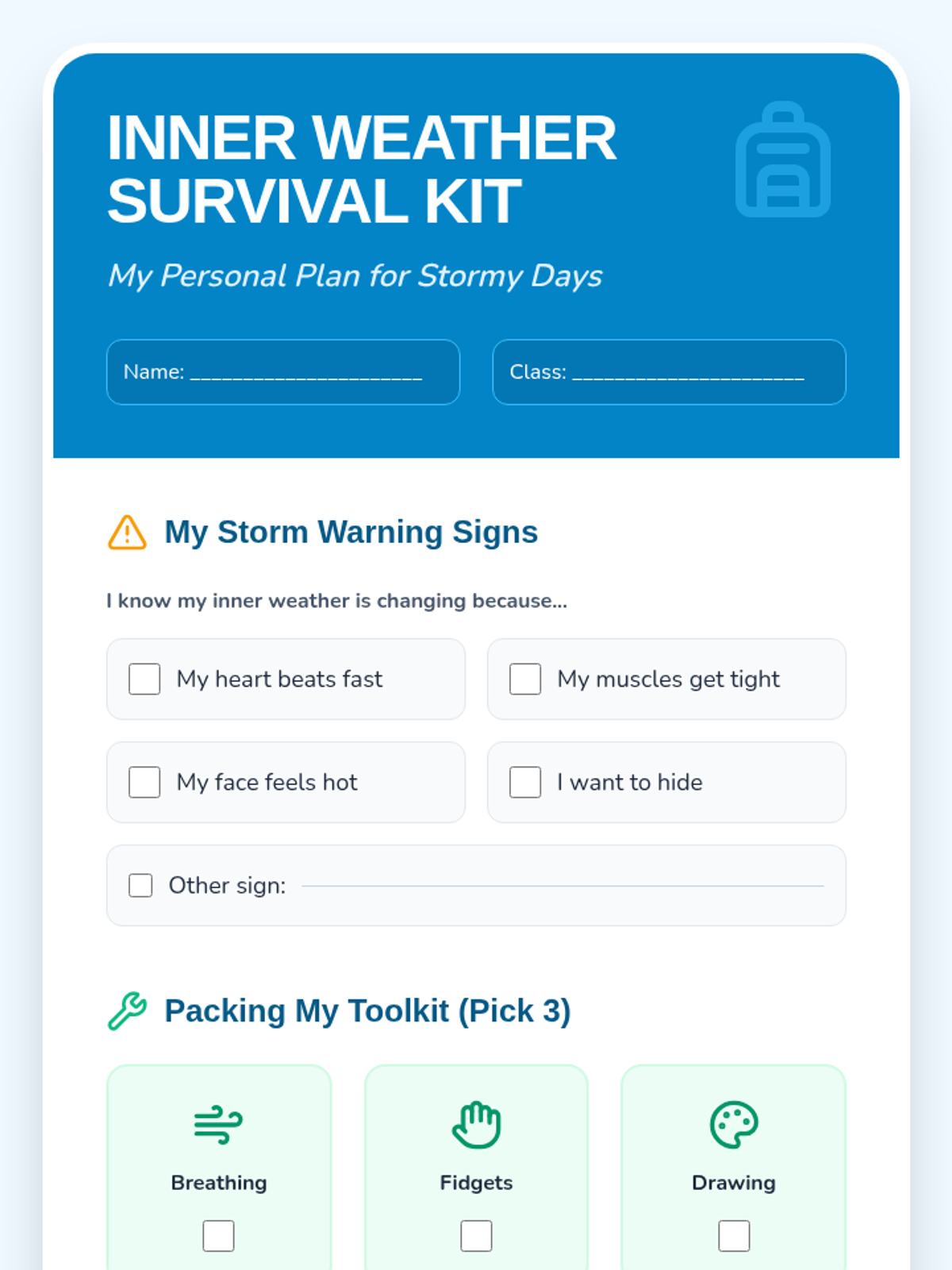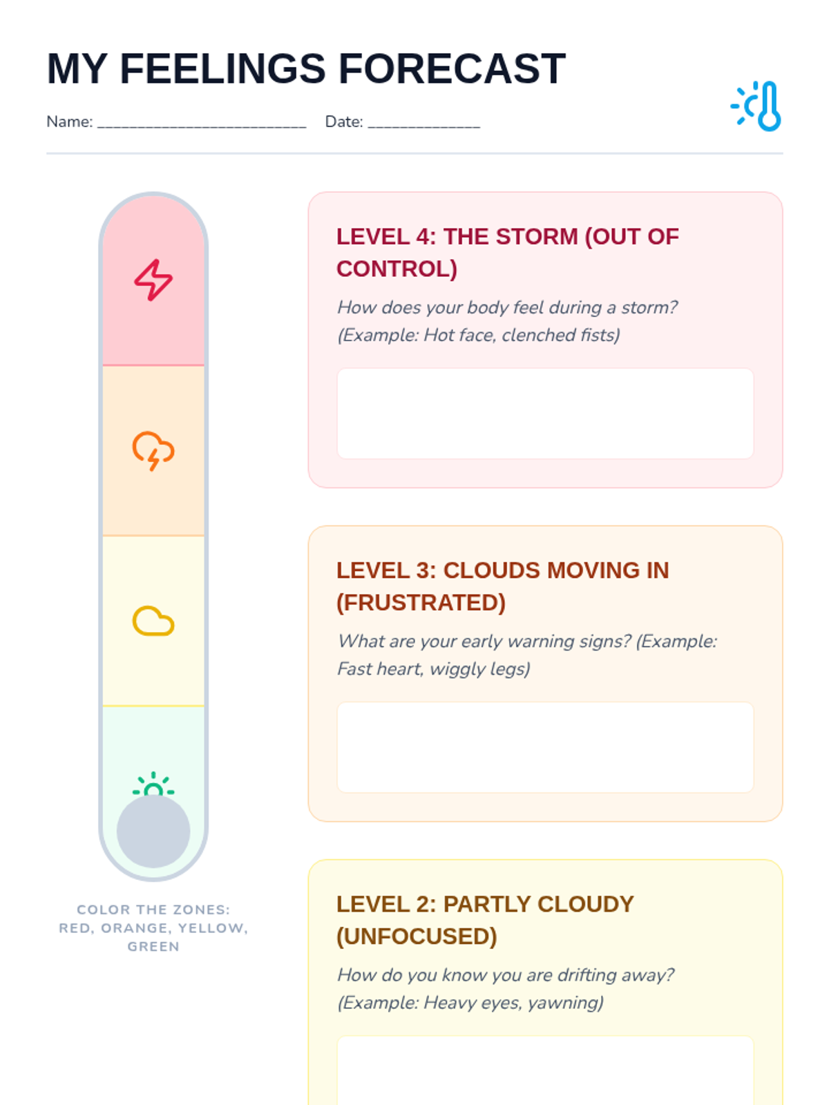 An SEL lesson for grades 3-5 focusing on identifying emotions using a weather-themed thermometer and building a personal toolkit of calming strategies for self-regulation.