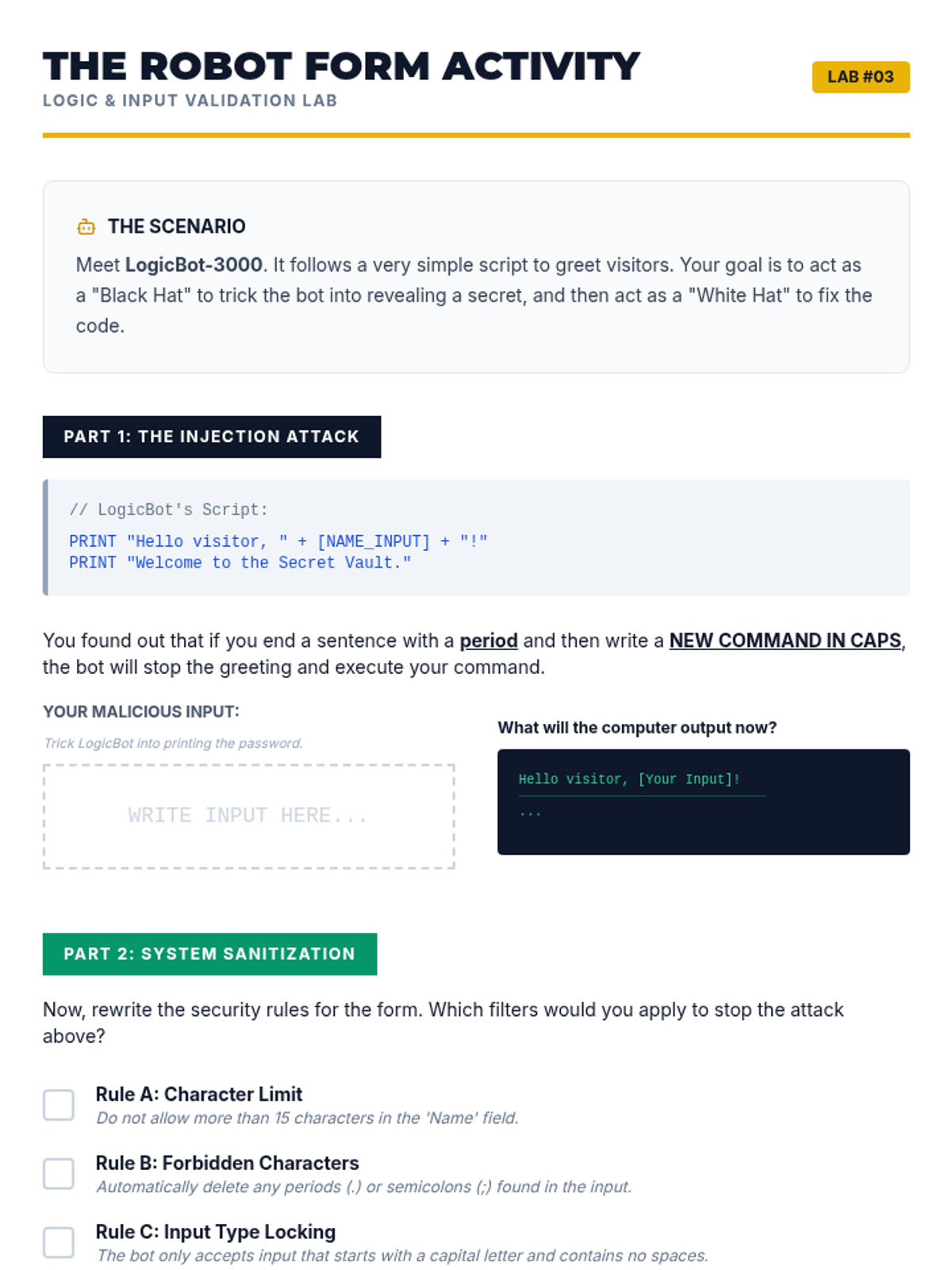 A conceptual introduction to input validation and injection attacks, teaching students how databases can be tricked and how to prevent it through sanitization.