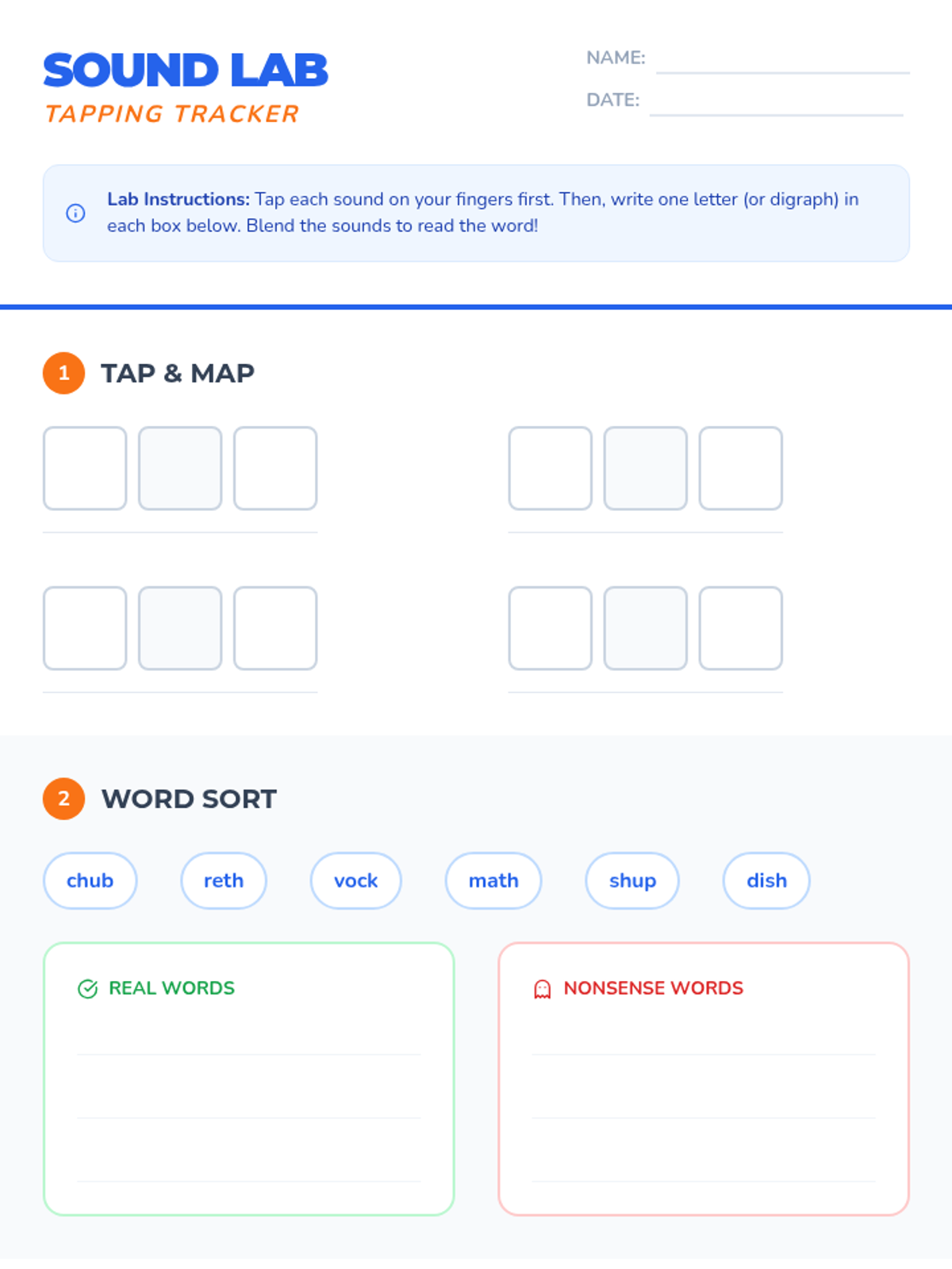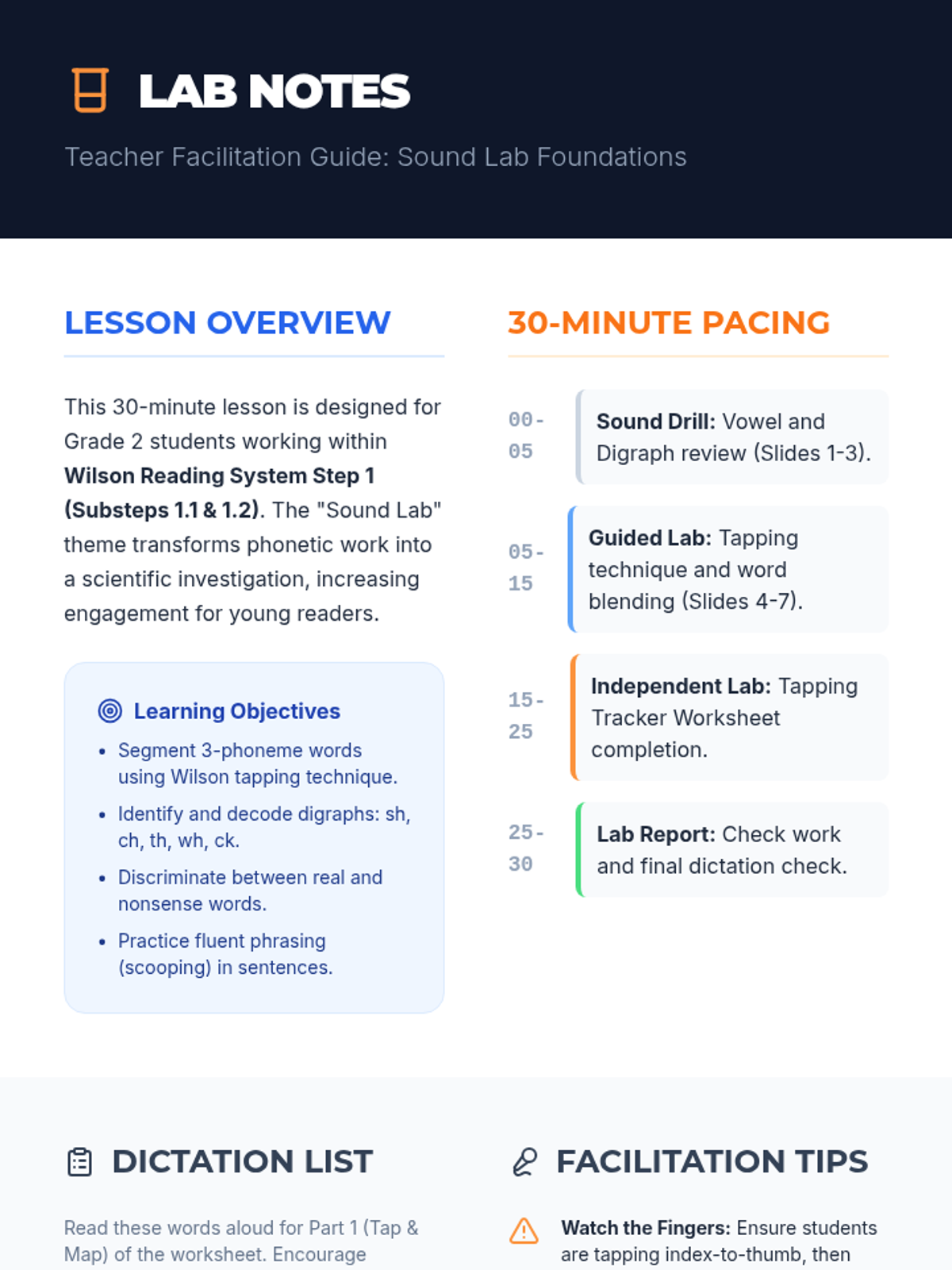 A foundational reading lesson focusing on Wilson Reading System Step 1 (CVC words and digraphs) through the 'Sound Lab' theme. Students practice phoneme segmentation (tapping), blending, and distinguishing between real and nonsense words.