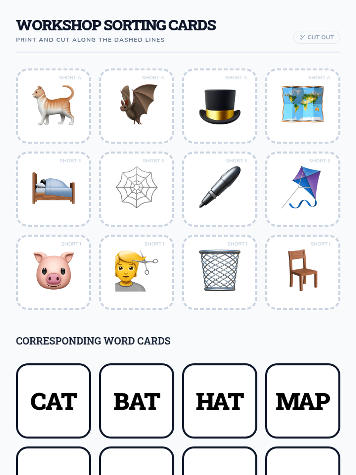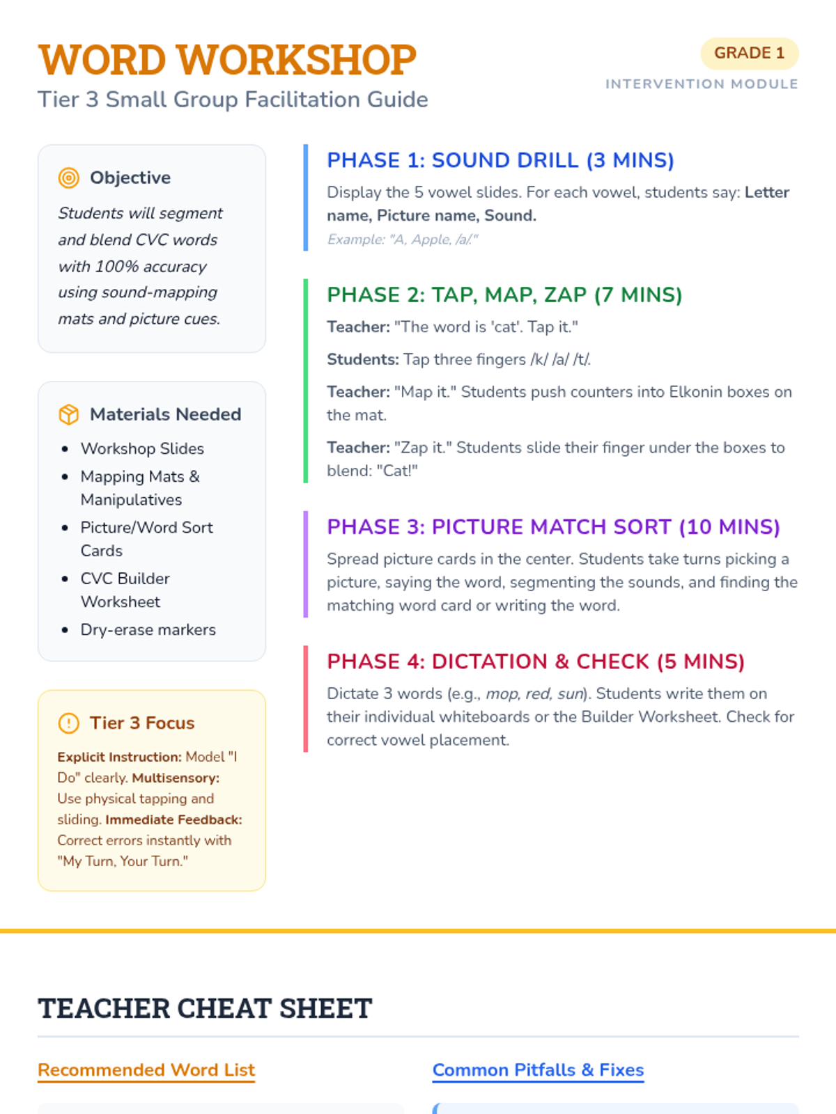 An intensive CVC intervention lesson for small groups, focusing on phonemic awareness, segmenting, and blending across all five short vowels through hands-on mapping and sorting.