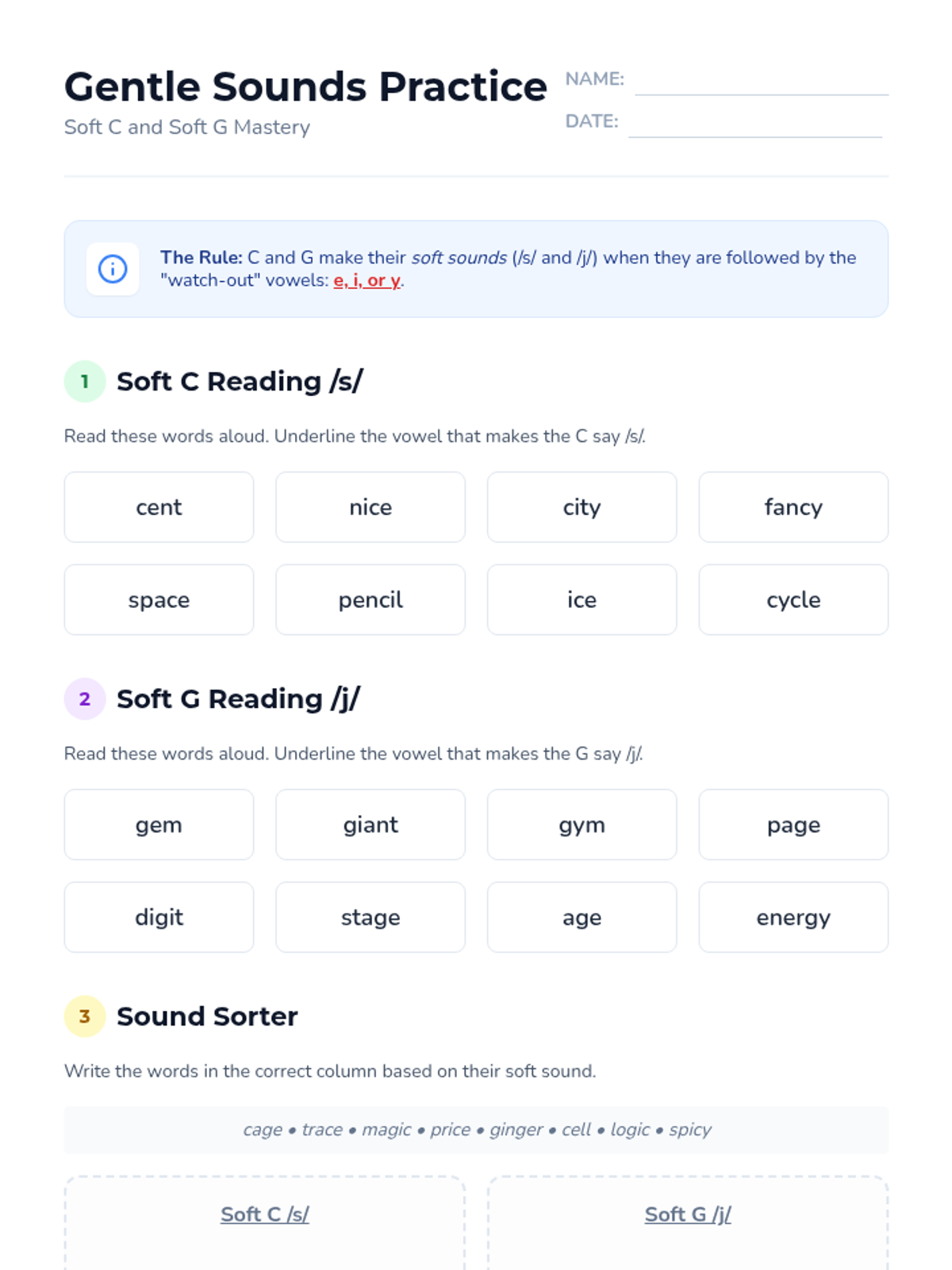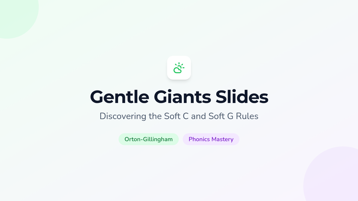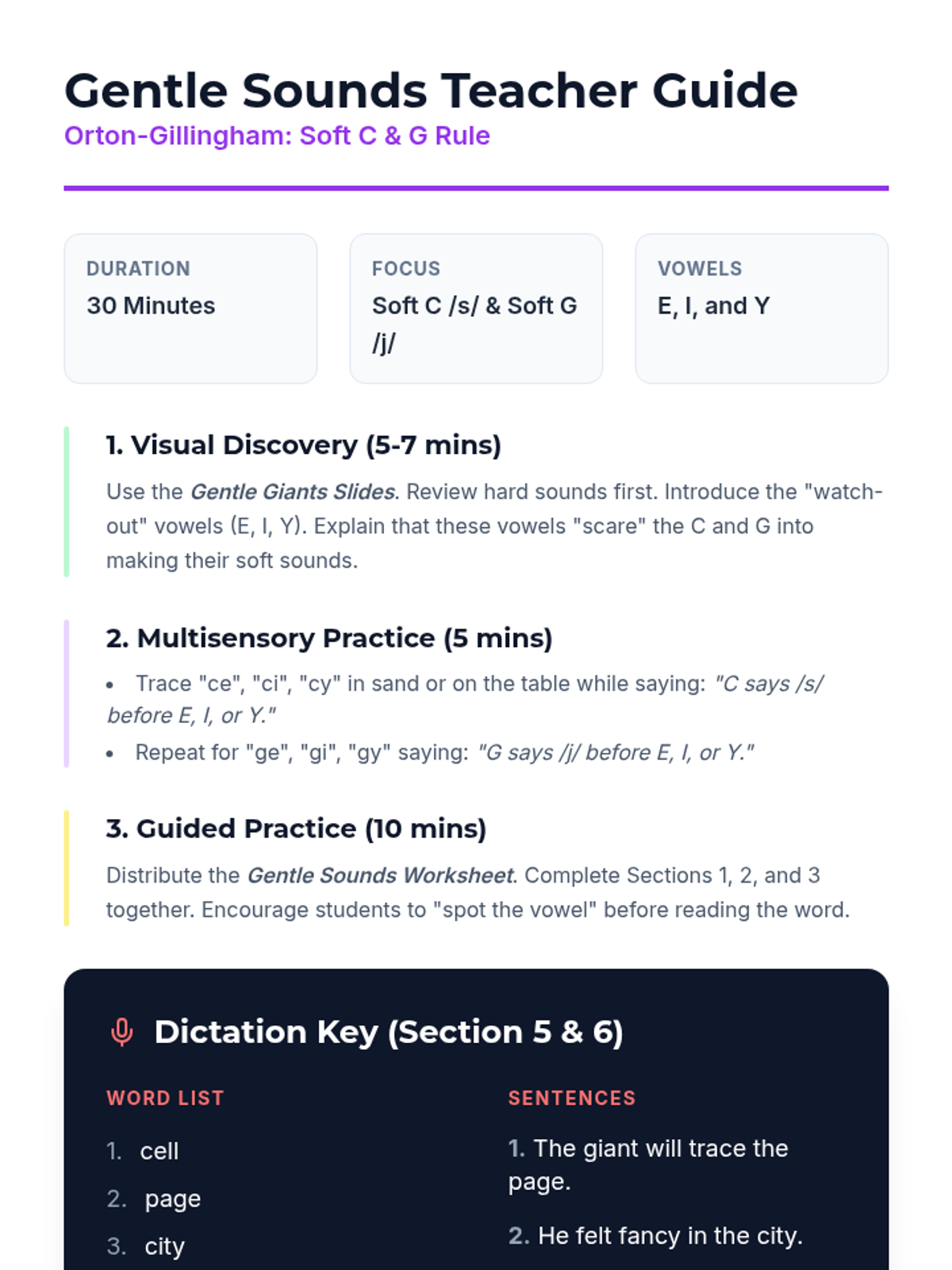 A structured Orton-Gillingham lesson focusing on the 'soft' sounds of C and G when followed by the vowels E, I, or Y. Includes visual aids, reading practice, and spelling dictation.
