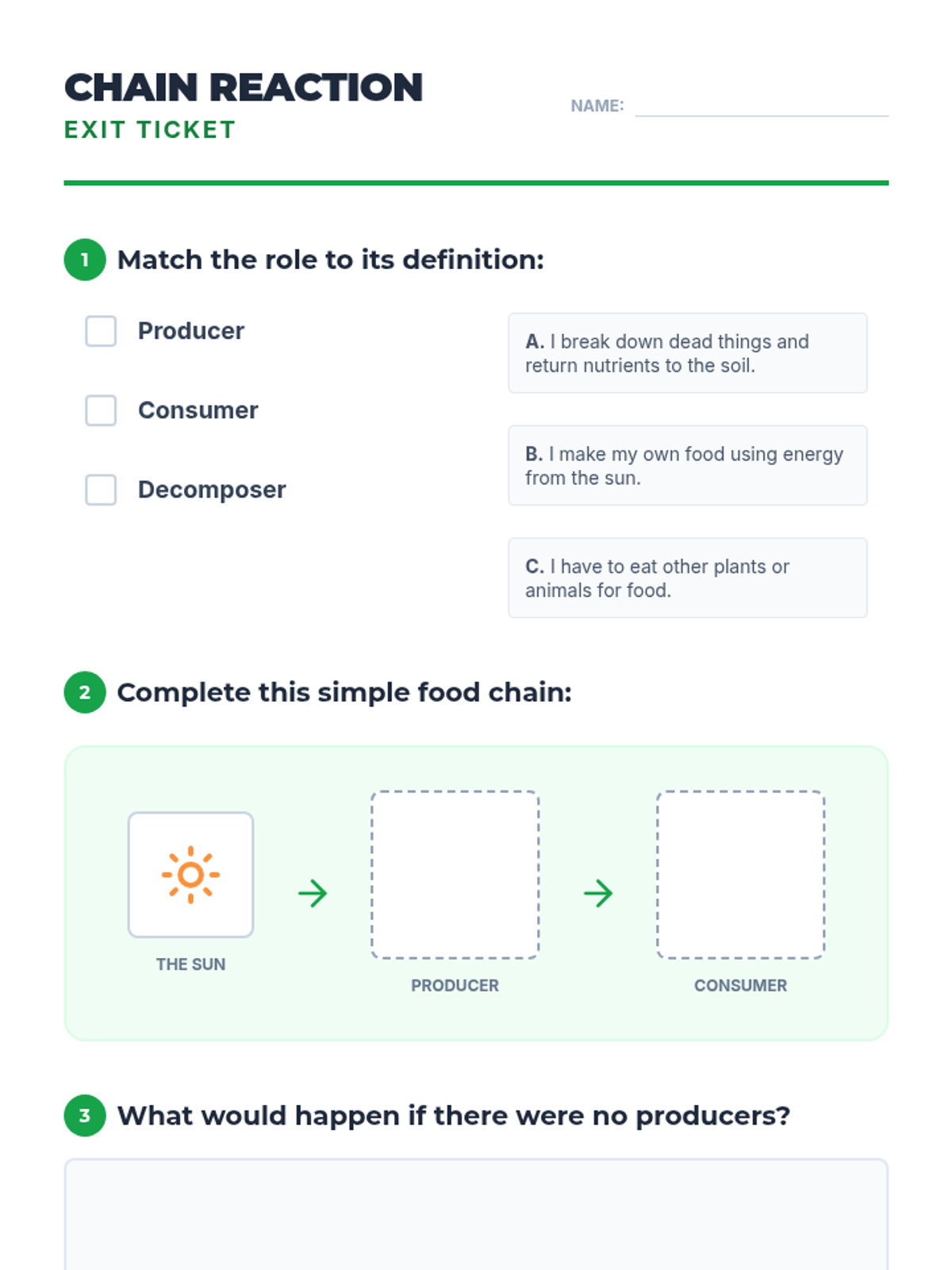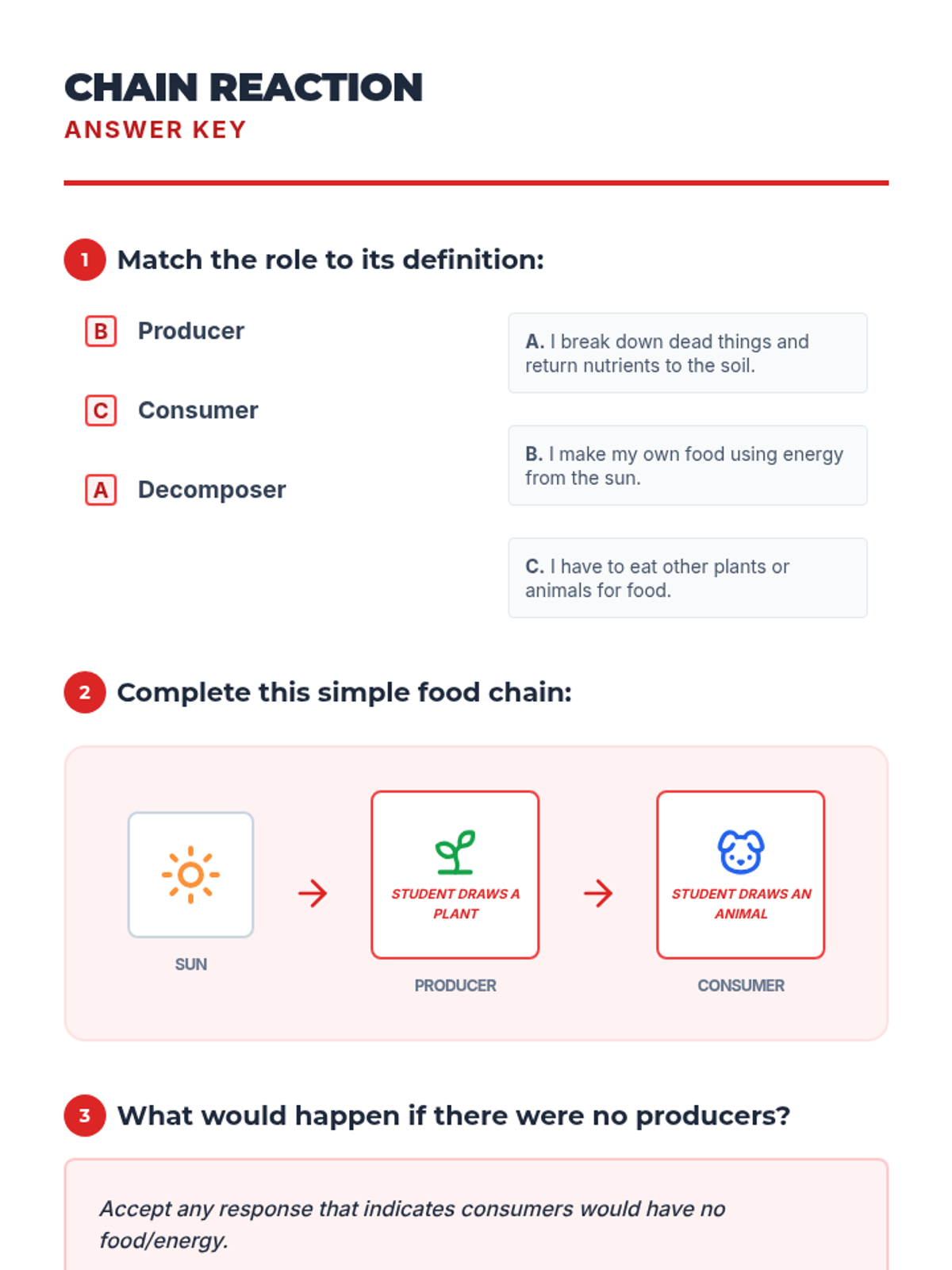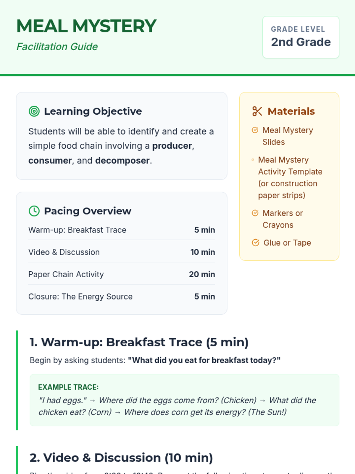 Students explore the basics of food chains by identifying producers, consumers, and decomposers through a video and hands-on paper chain activity.