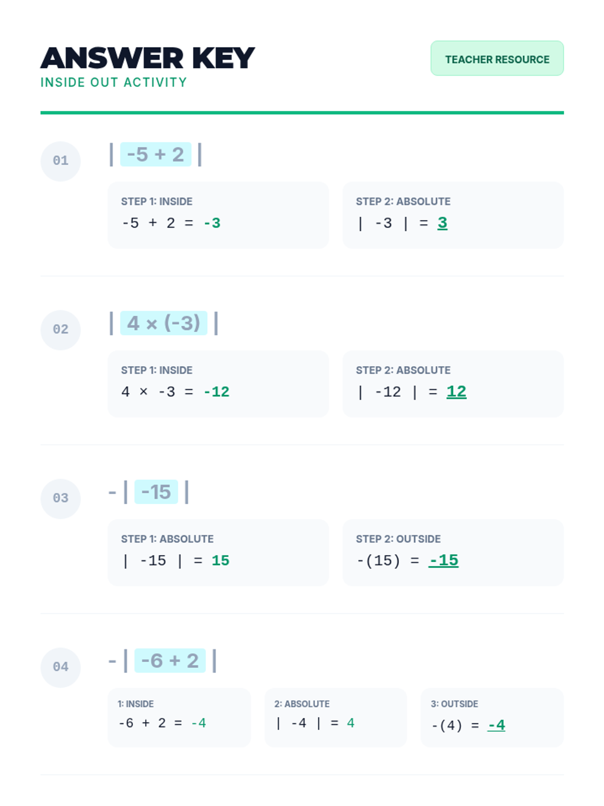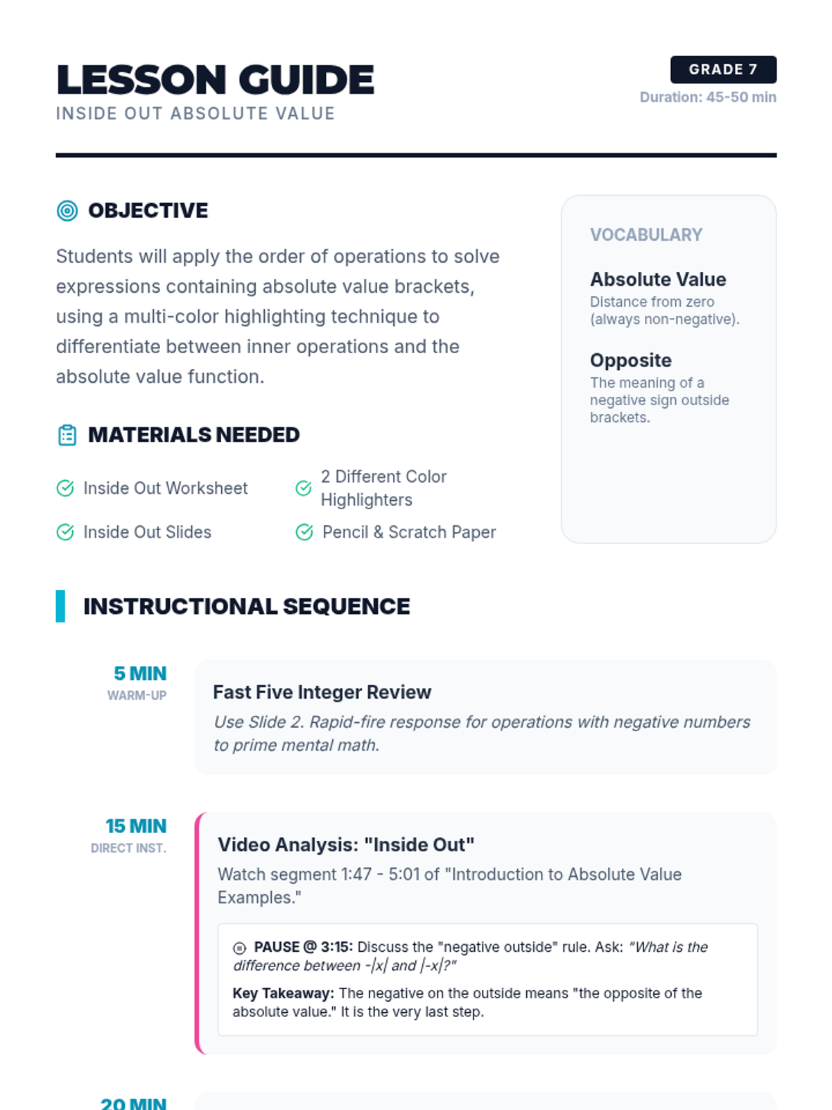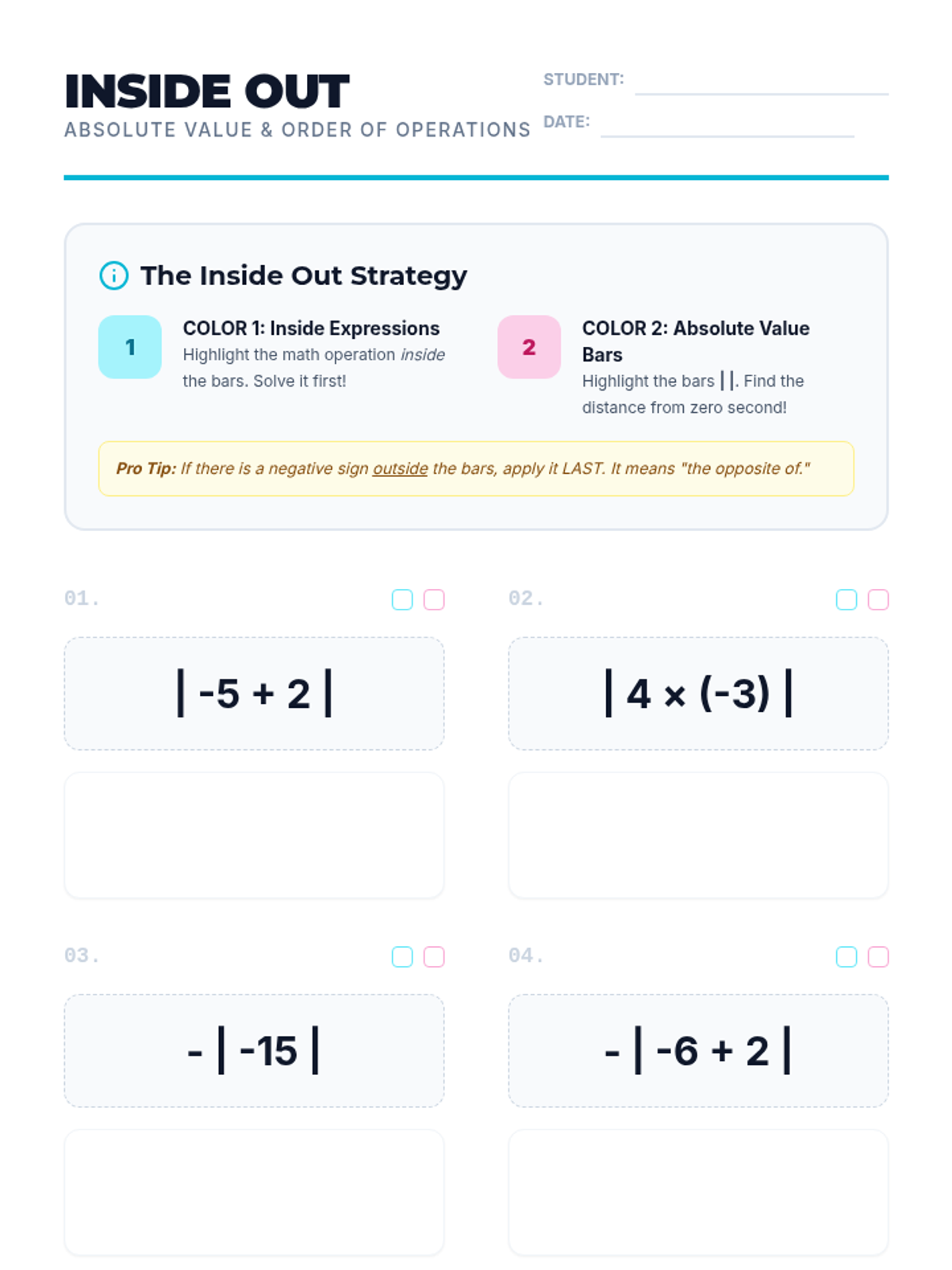 A 7th-grade math lesson focused on solving expressions with absolute value using the order of operations. Students use a highlighting technique to distinguish between operations inside the brackets and the absolute value operation itself.
