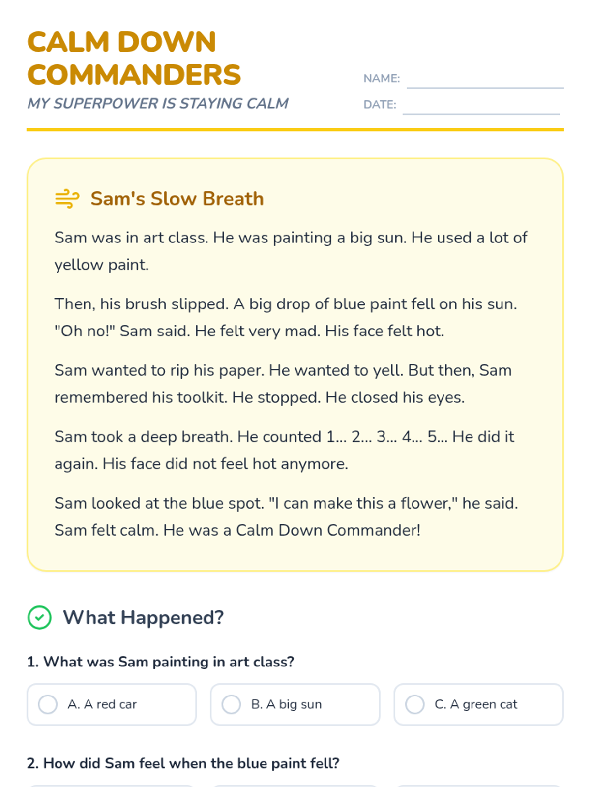 Introduces a variety of physical and mental calming strategies, allowing students to practice and select the ones that work best for them.