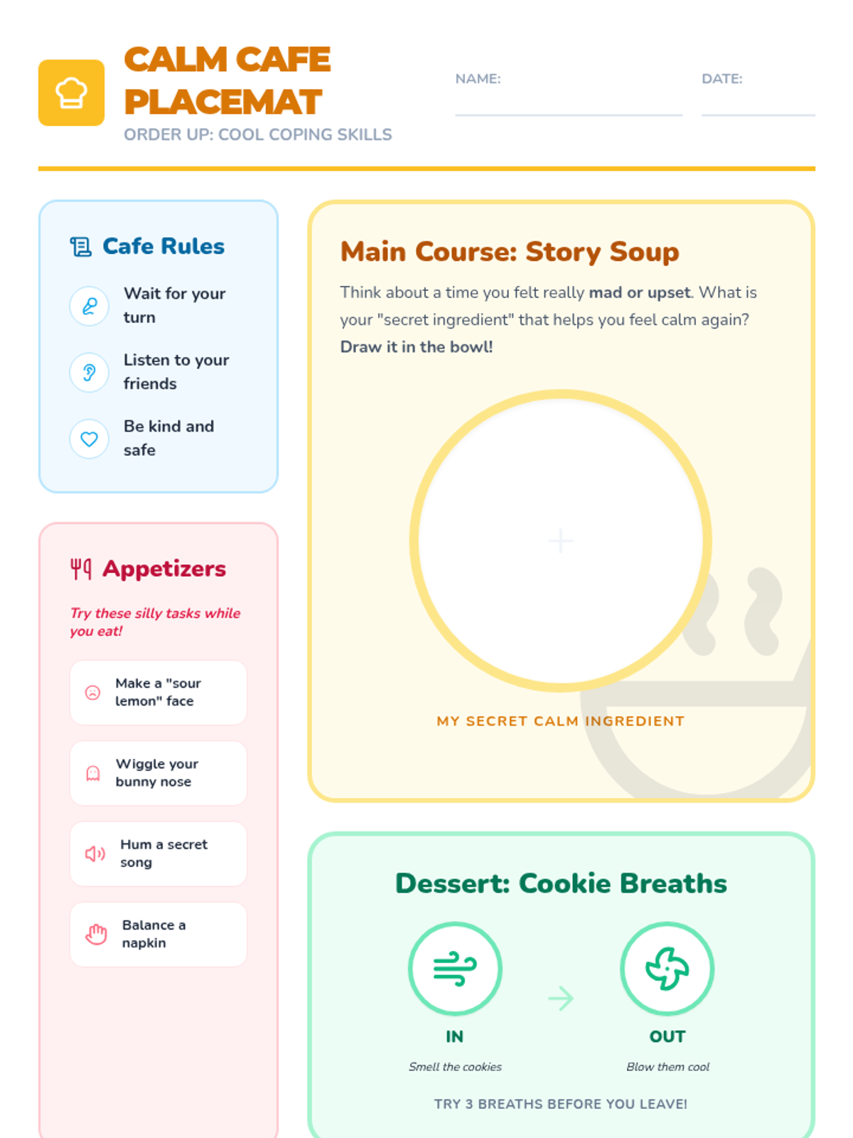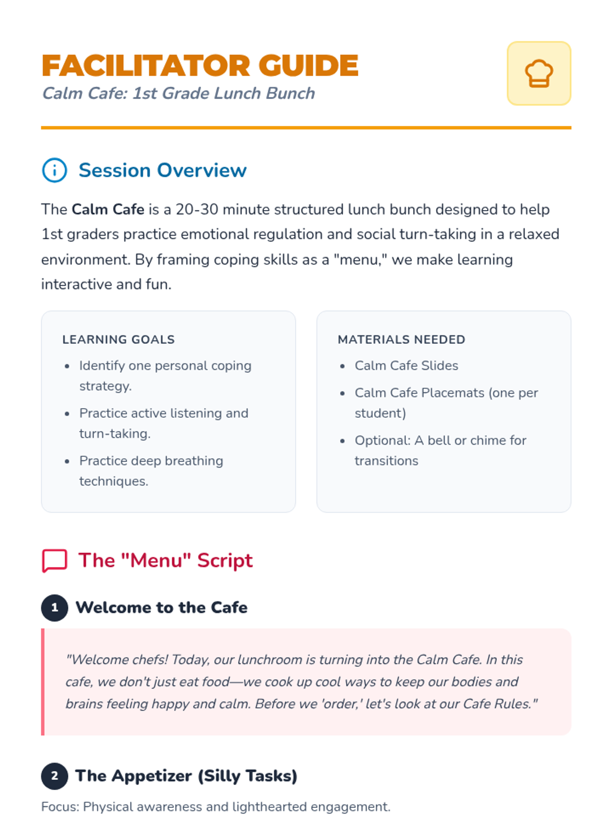 A structured lunch bunch session for 1st graders to practice coping skills through silly prompts, turn-taking games, and 'dish' themed sharing activities. This lesson focuses on emotional regulation in a social, informal setting.