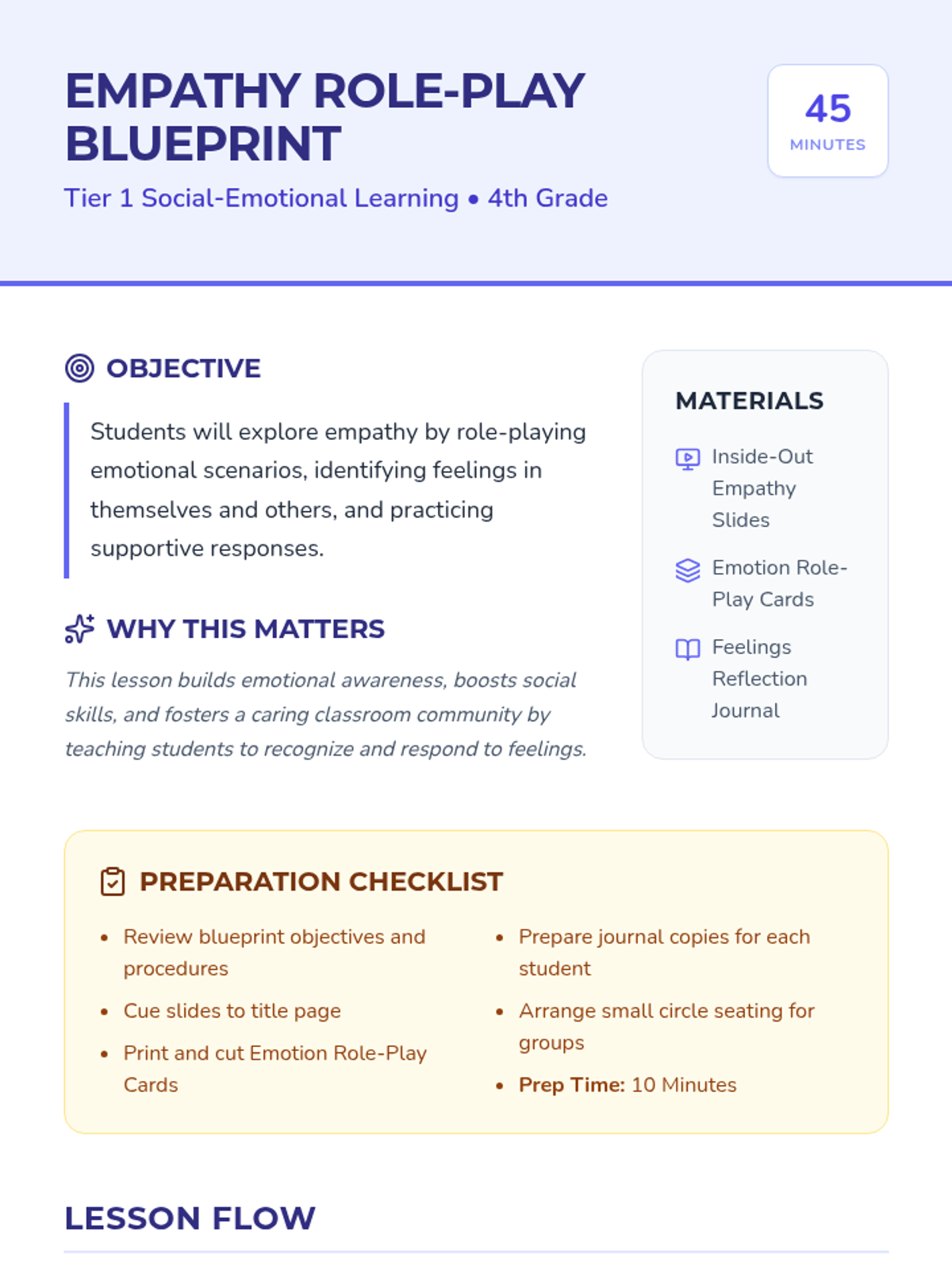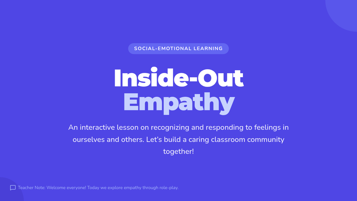 An interactive 45-minute lesson for 4th graders exploring empathy through role-play, identifying feelings, and practicing supportive responses. Students engage in hands-on activities to build a more caring and connected classroom community.