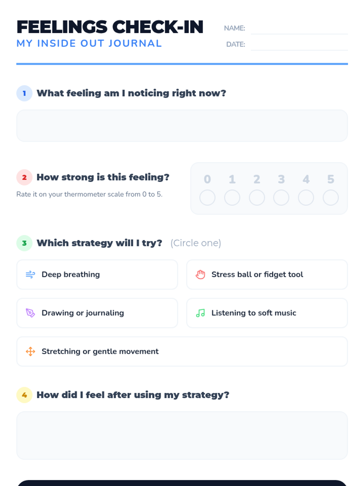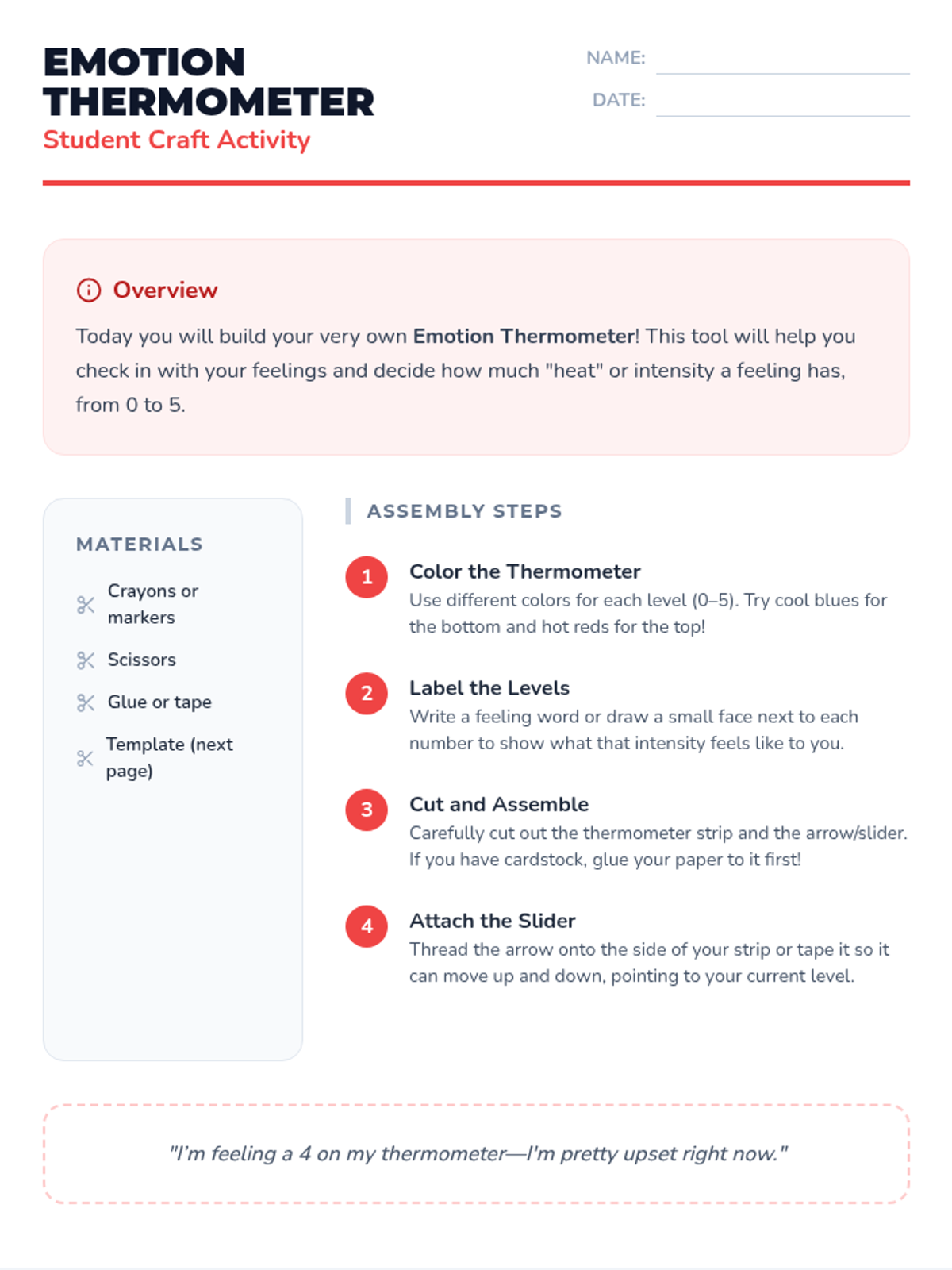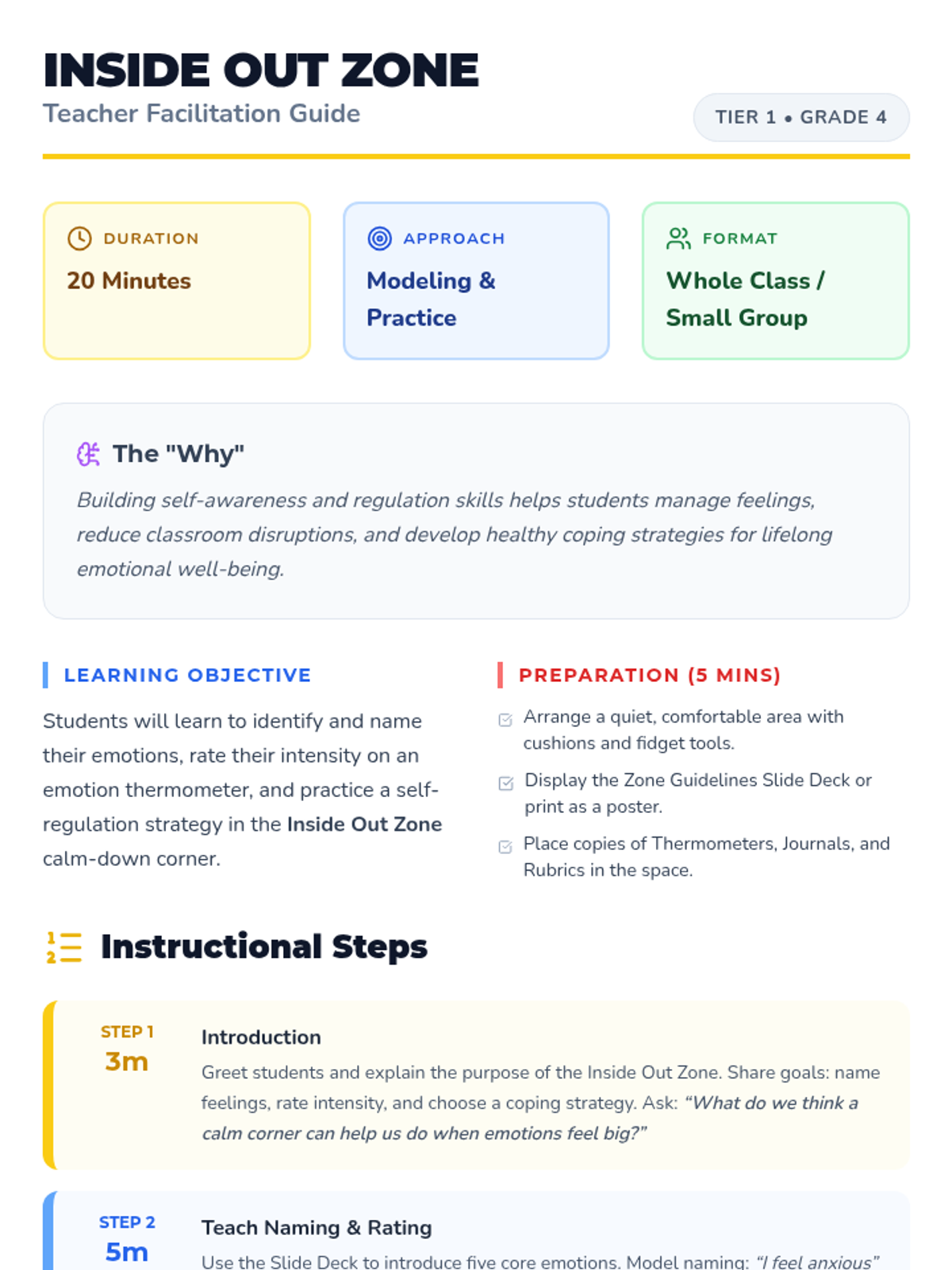A 20-minute Tier 1 mini-lesson for 4th graders to name, rate, and regulate emotions using a dedicated calm-down corner. Students create personal emotion thermometers and learn strategies for self-awareness and regulation.