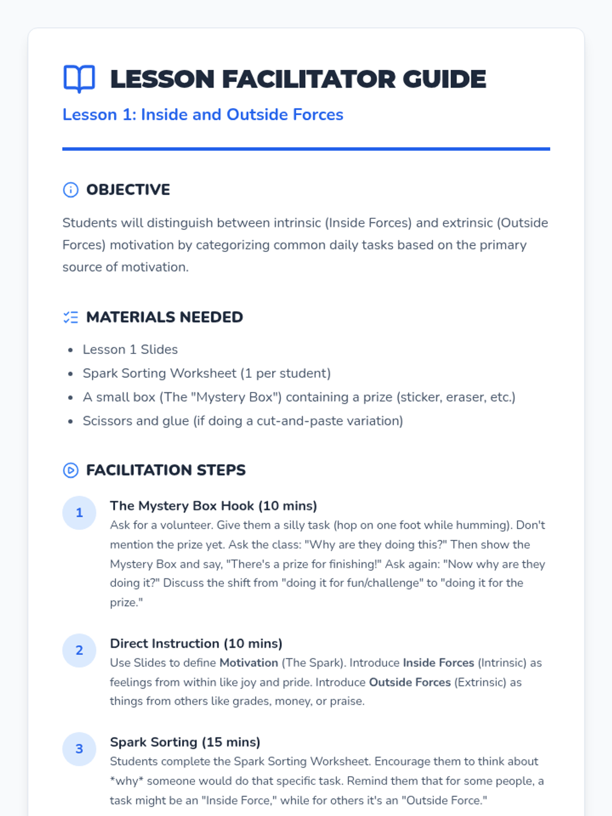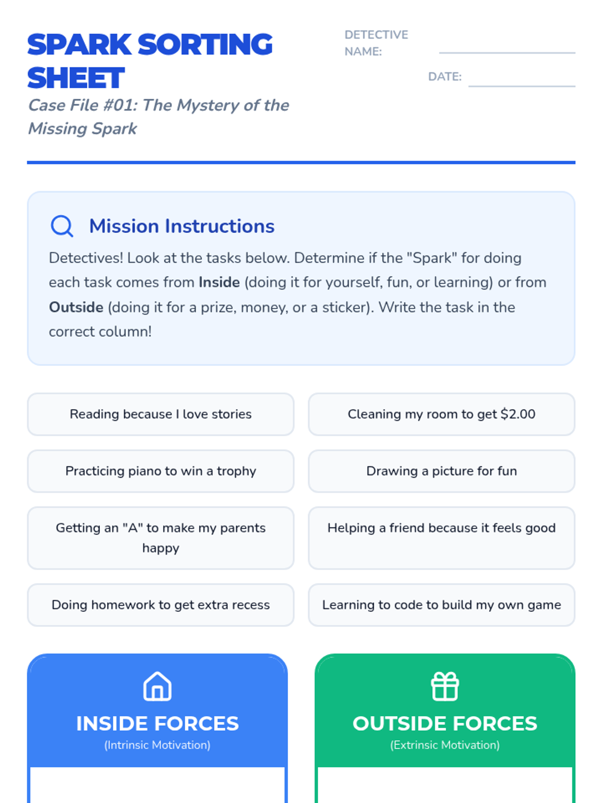 Students investigate the difference between internal and external rewards using a sorting activity to categorize 'Inside Forces' and 'Outside Forces'.
