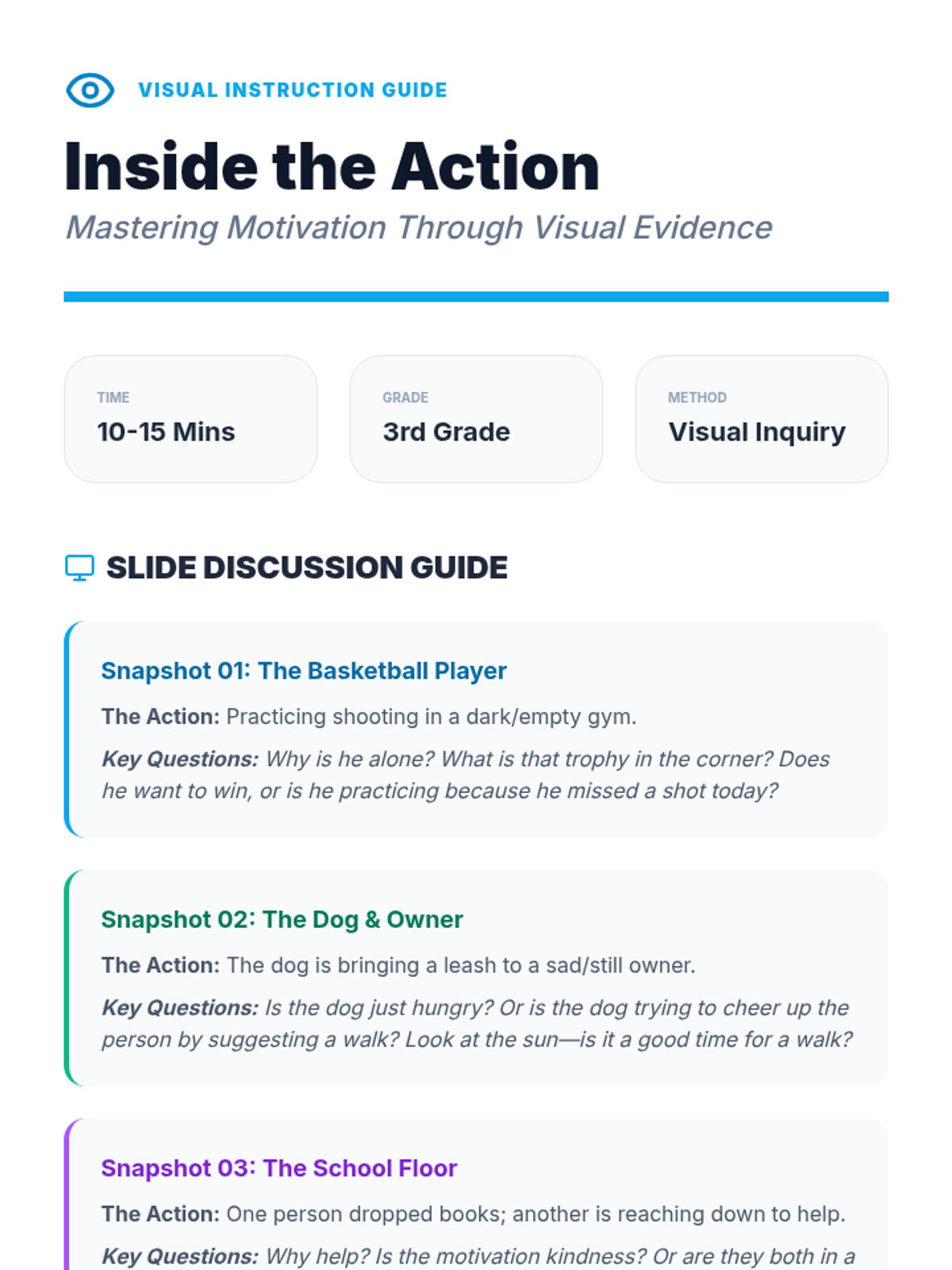 A 10-15 minute mini-lesson focused on identifying character motivations using visual scenarios like sports, school, and animals. Students will learn to distinguish between what a character does (action) and why they do it (motivation).
