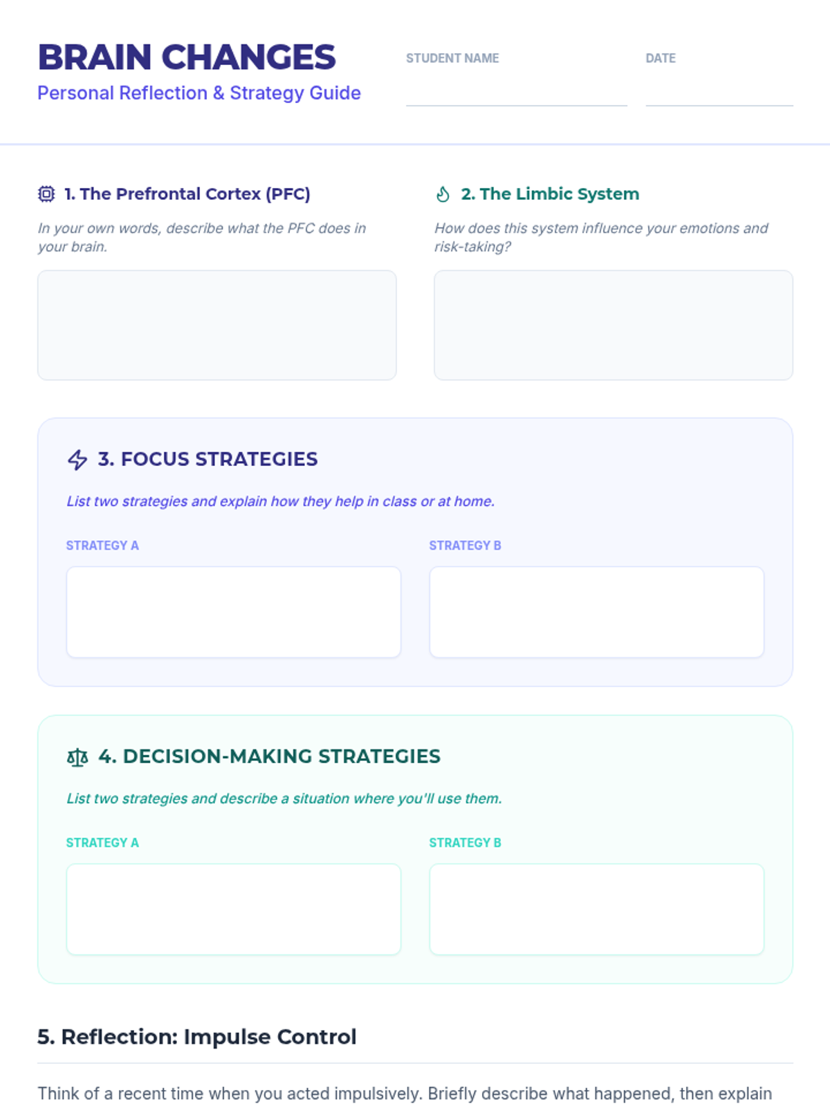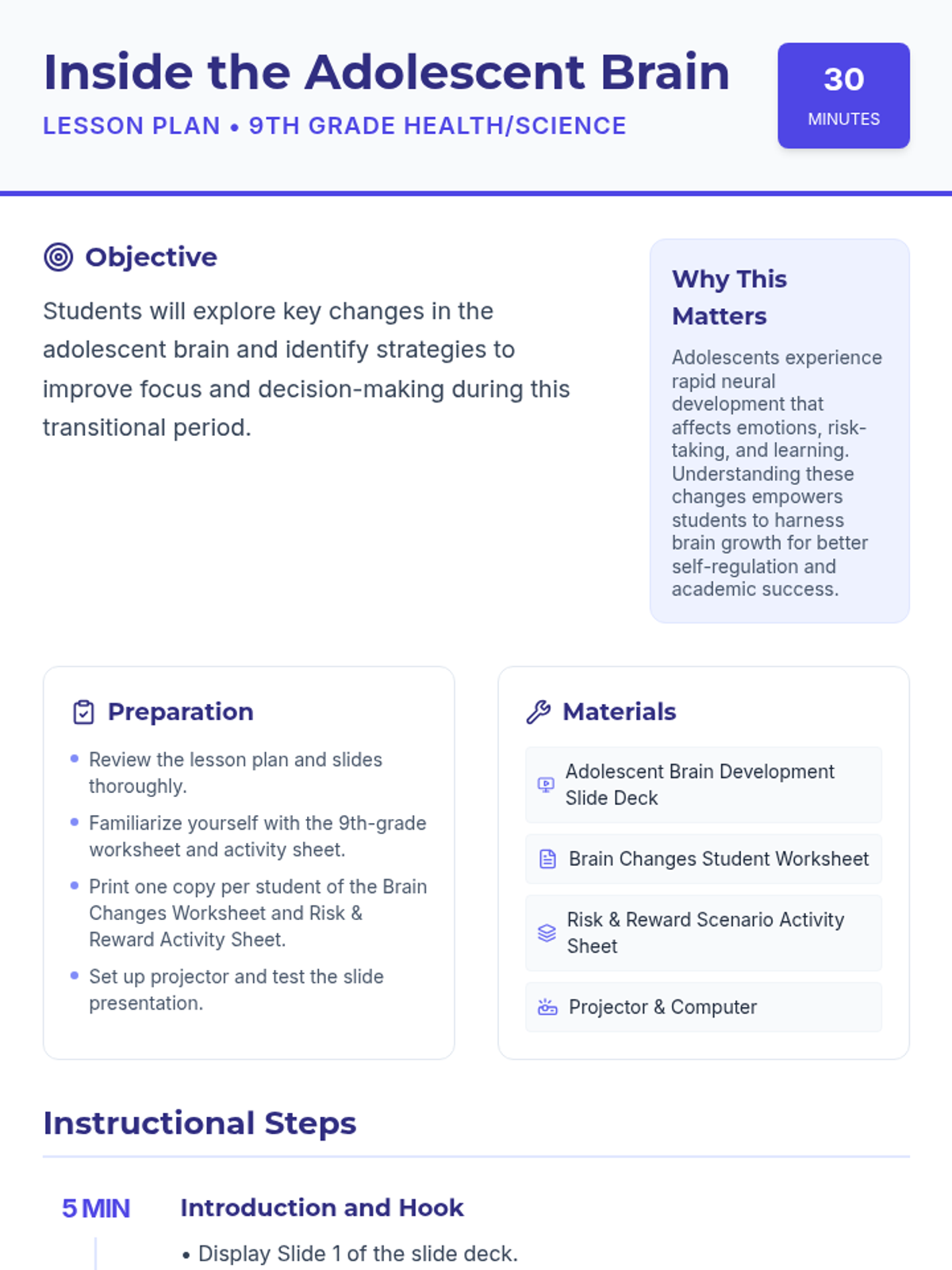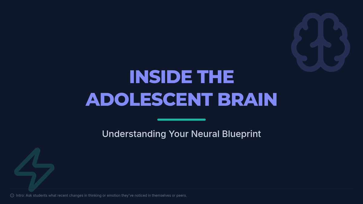 A 30-minute lesson for 9th graders exploring the neural changes in the adolescent brain, focusing on the prefrontal cortex and limbic system to improve self-regulation and decision-making.