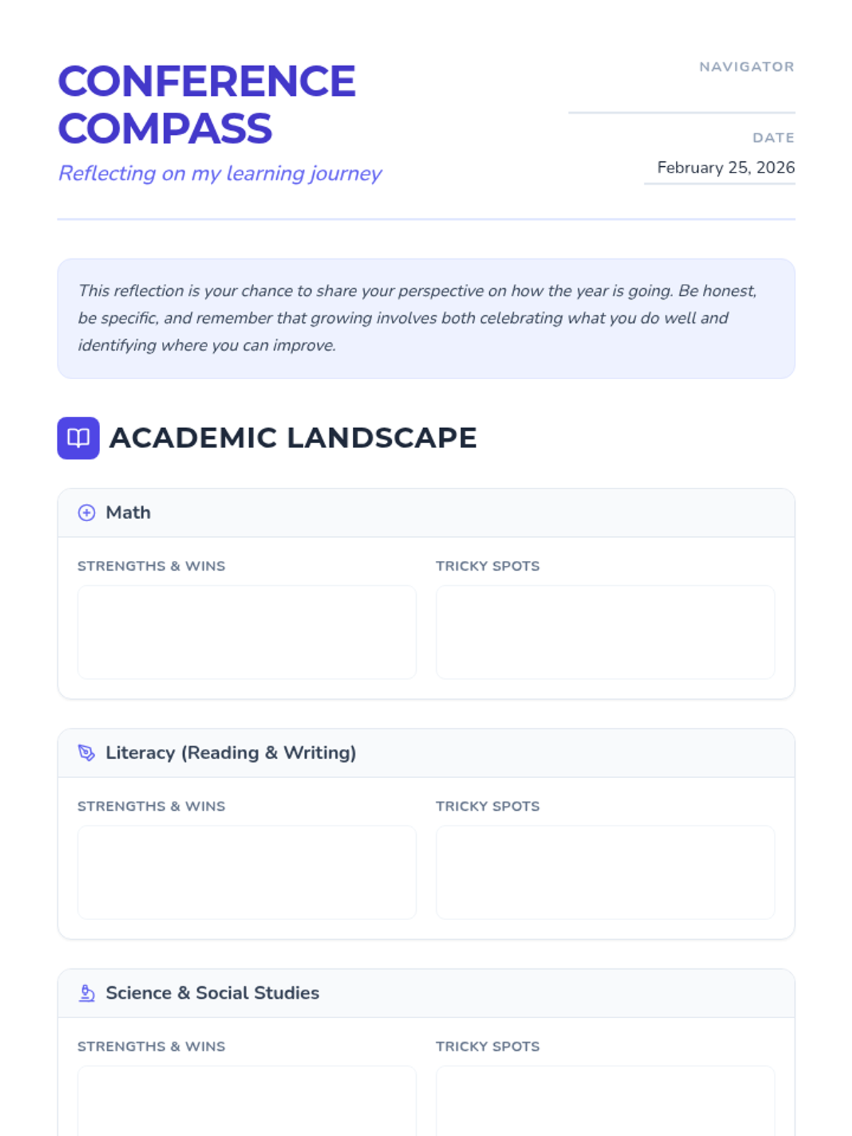 A lesson designed to help students reflect on their academic and social progress in preparation for parent-teacher conferences, fostering self-awareness and goal-setting.