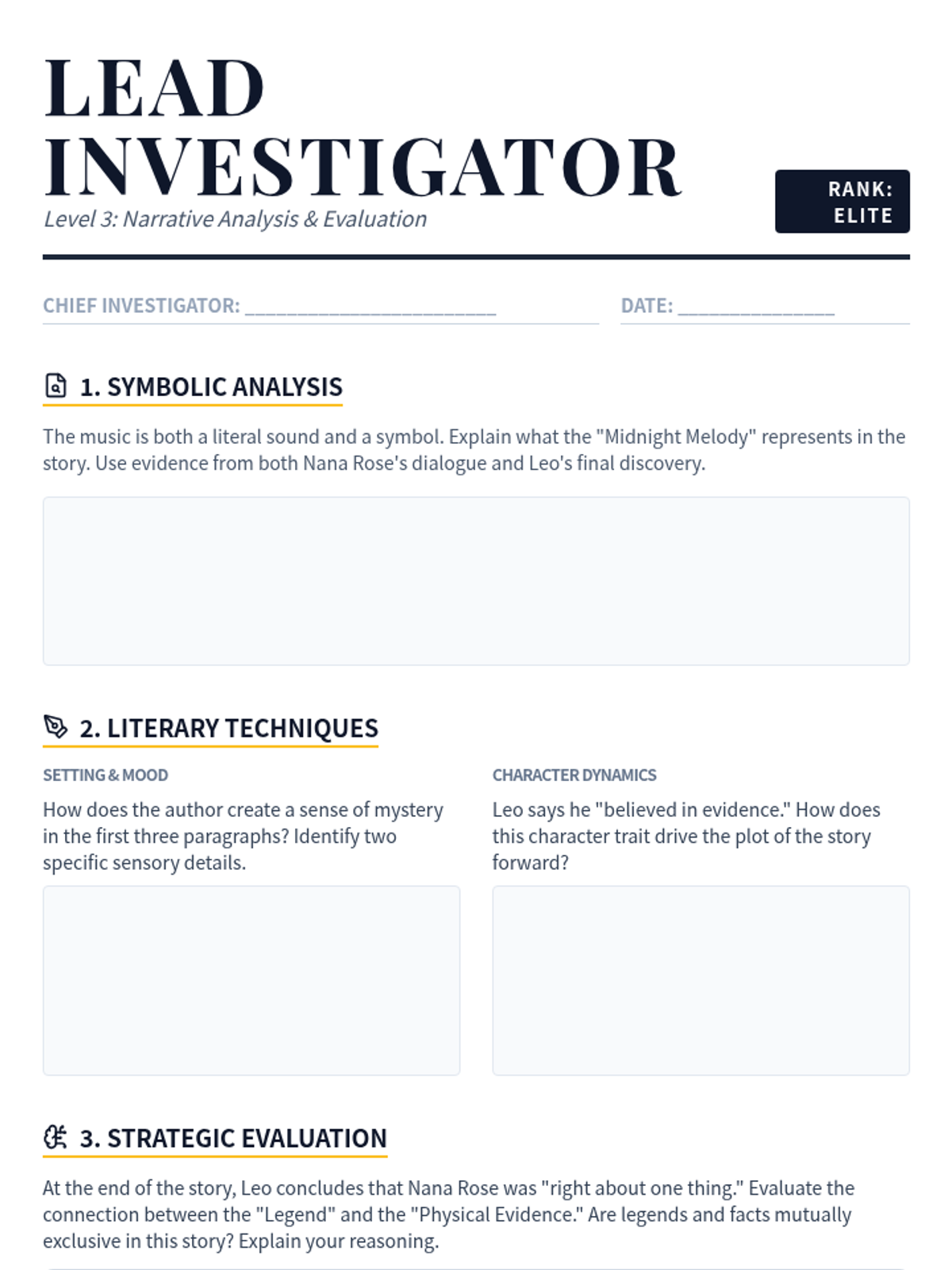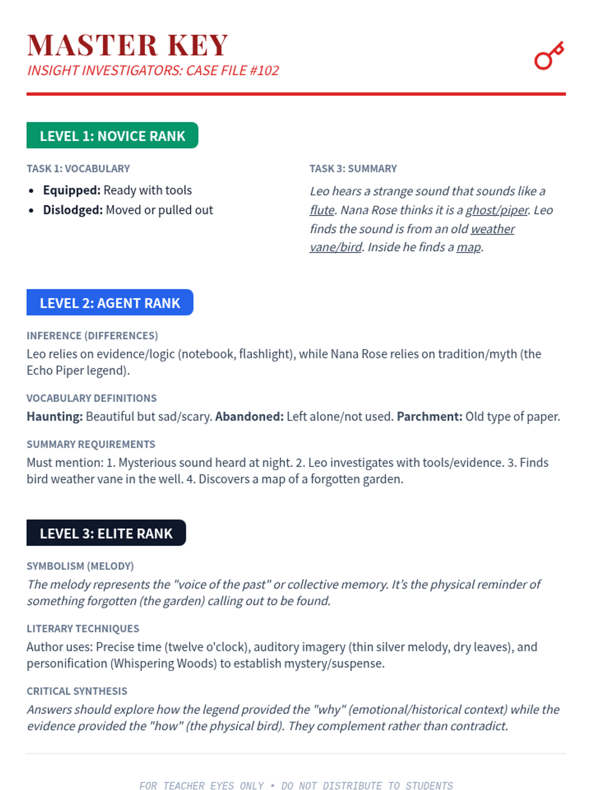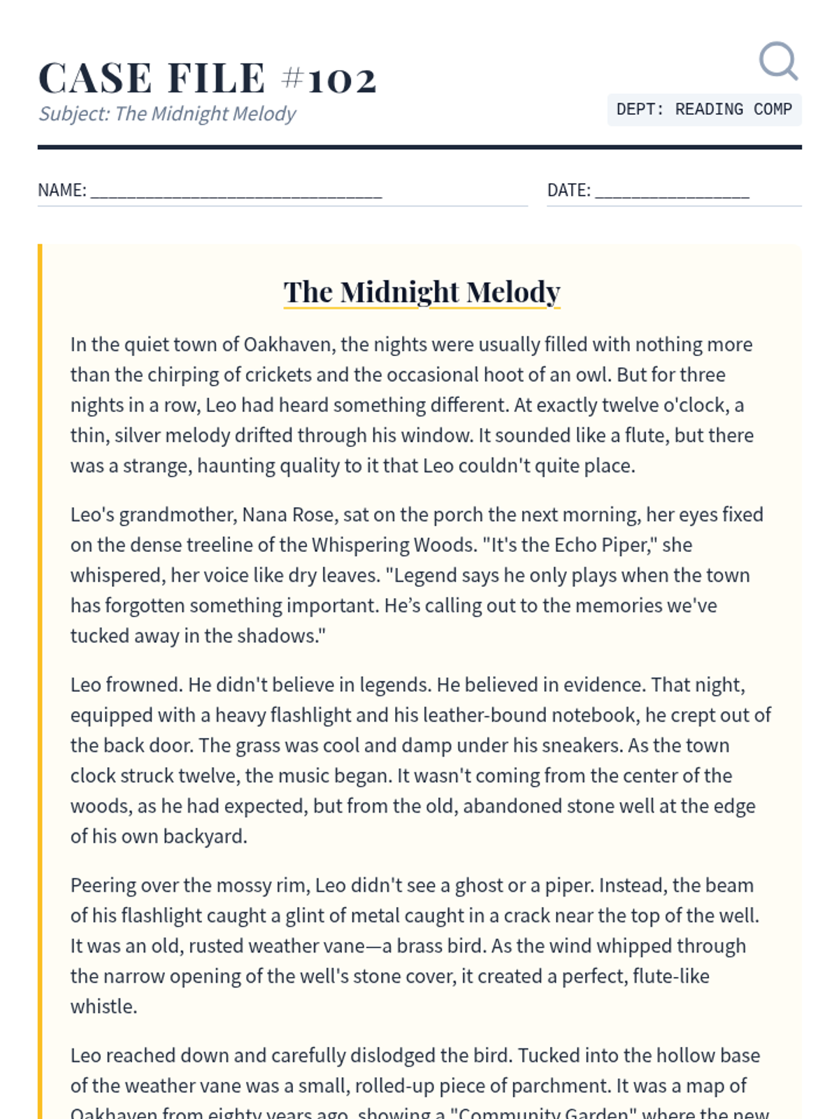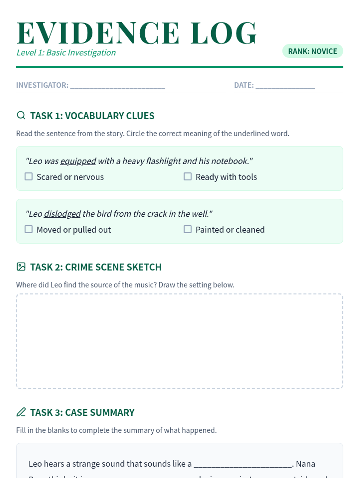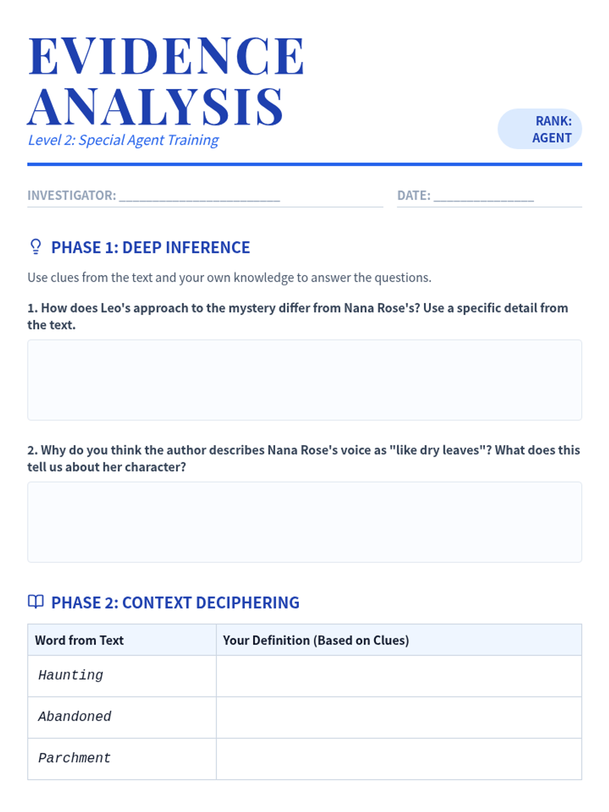 A set of differentiated reading comprehension homework materials themed around a detective agency. Students act as 'Insight Investigators' to decode a mystery passage using various strategies.