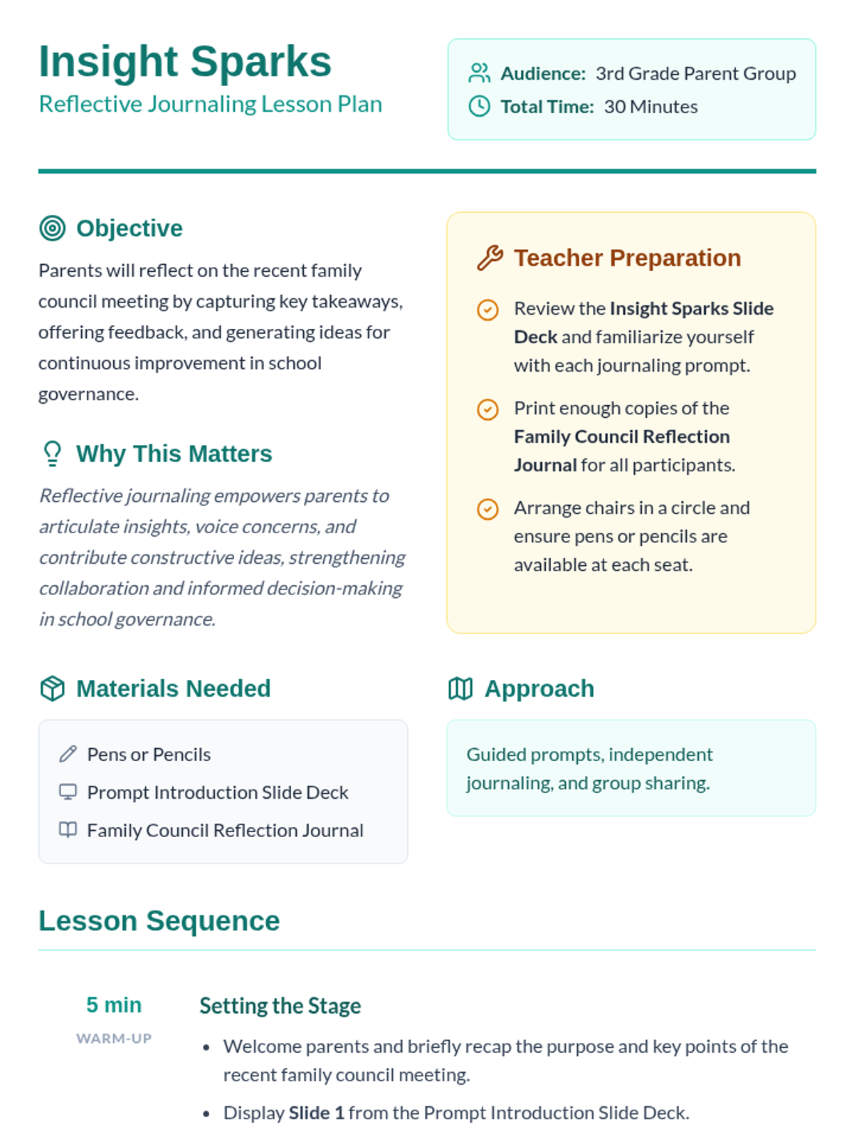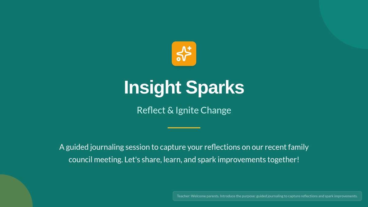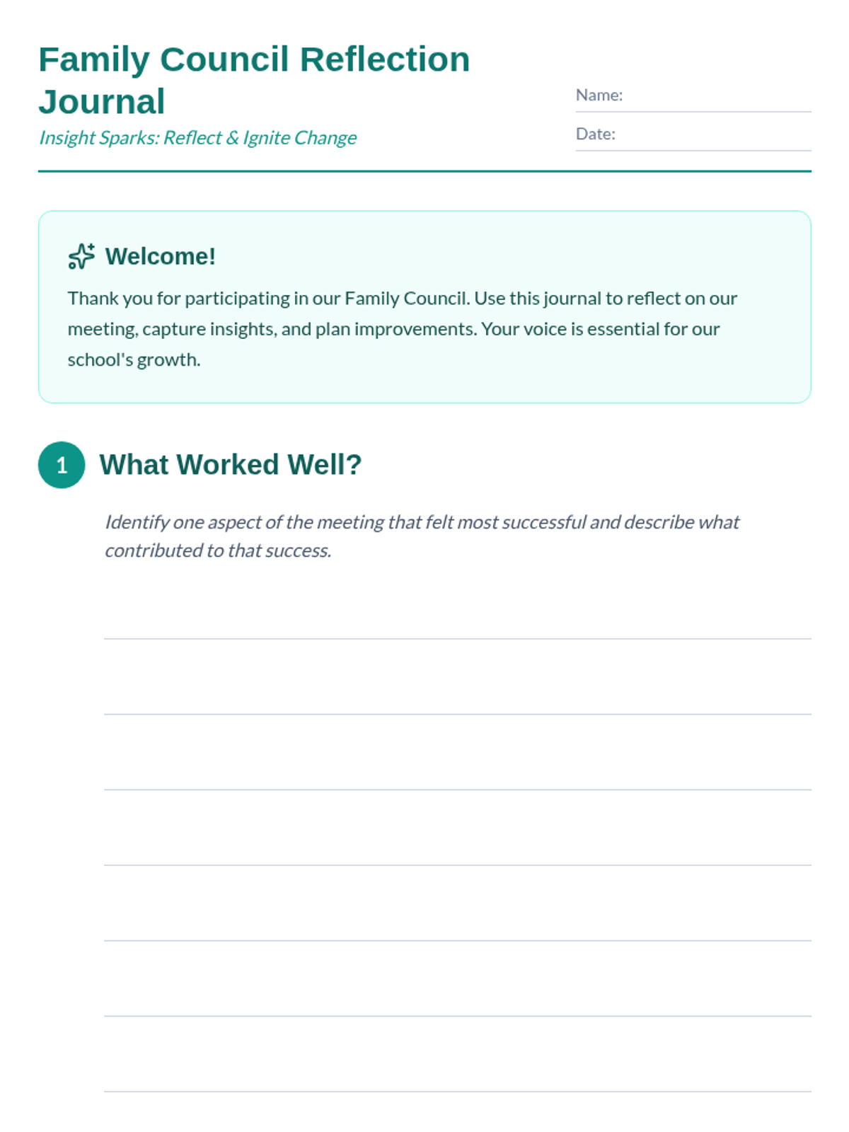 A reflective journaling session series designed for 3rd grade parent groups after family council meetings to capture learnings and improve school governance.