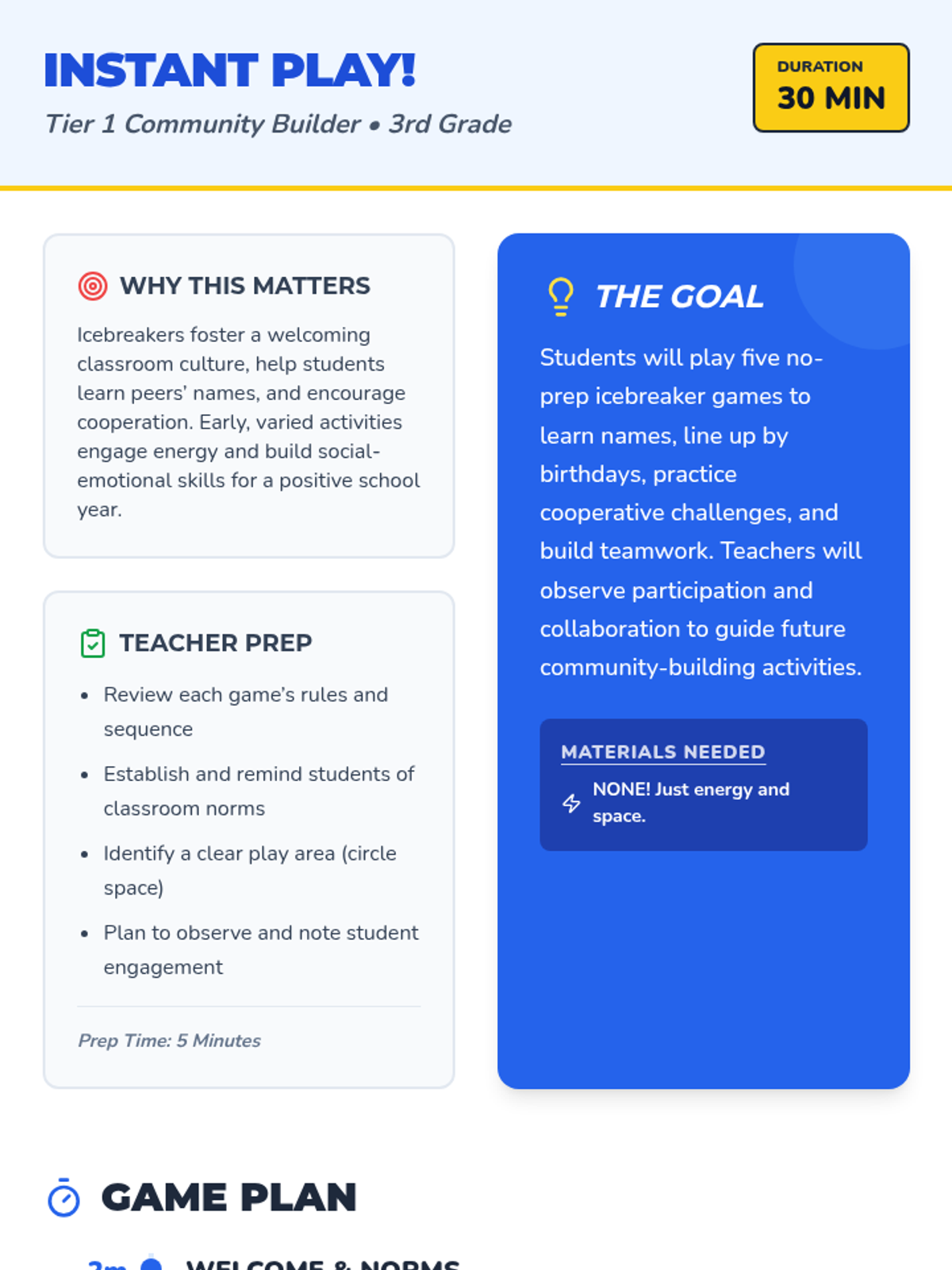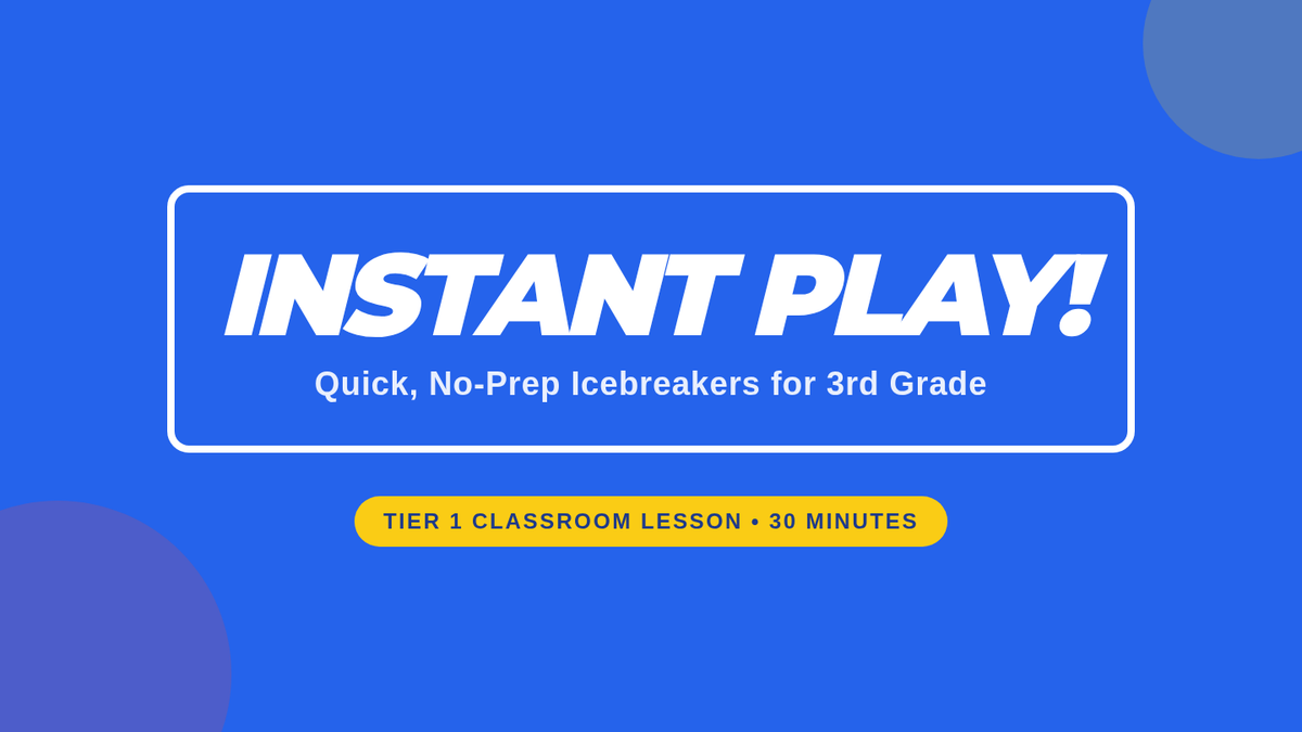 A high-energy, no-prep 30-minute lesson for 3rd graders featuring five interactive icebreaker games designed to build classroom community and cooperation.