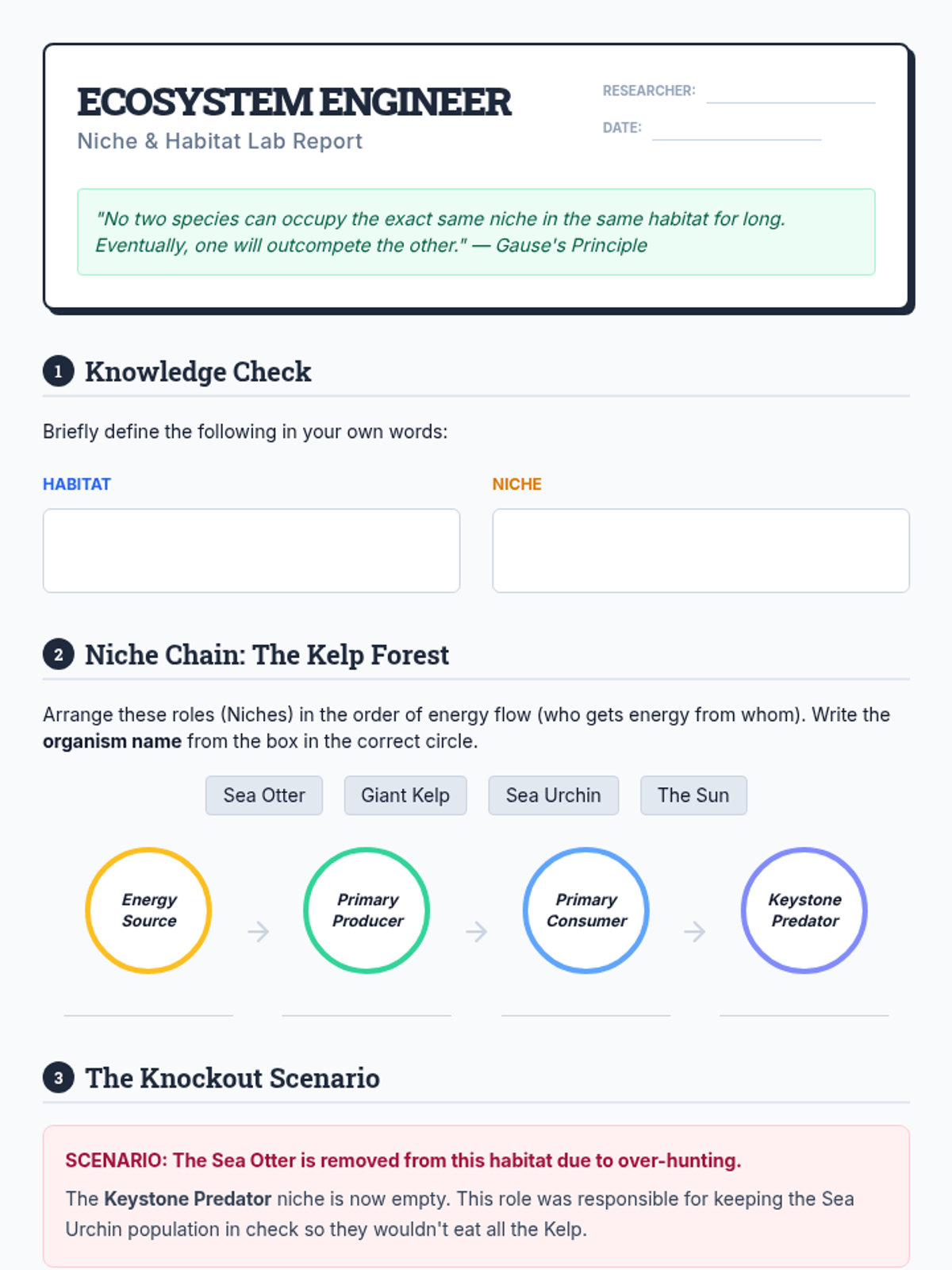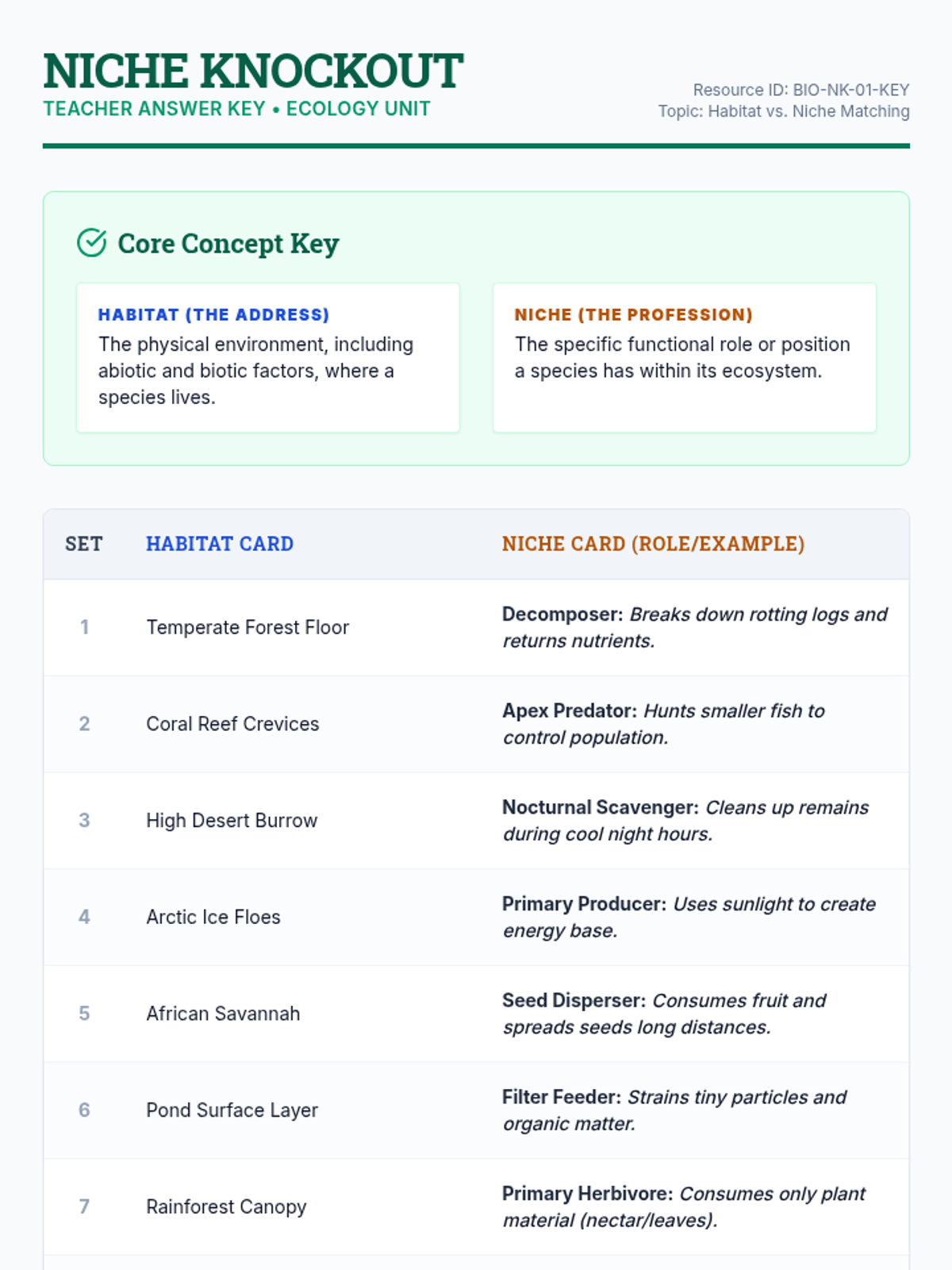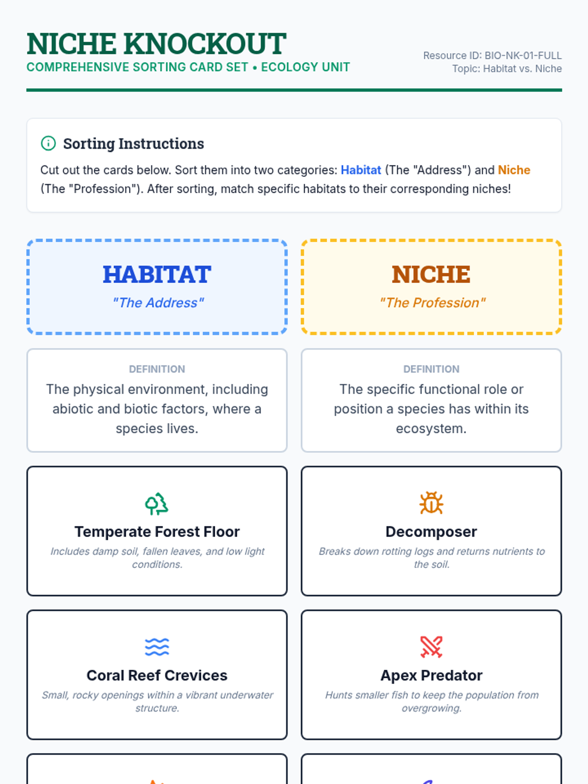 An interactive lesson for 7th graders to distinguish between habitat and niche, explore specific roles within ecosystems, and predict outcomes of ecological disruptions.