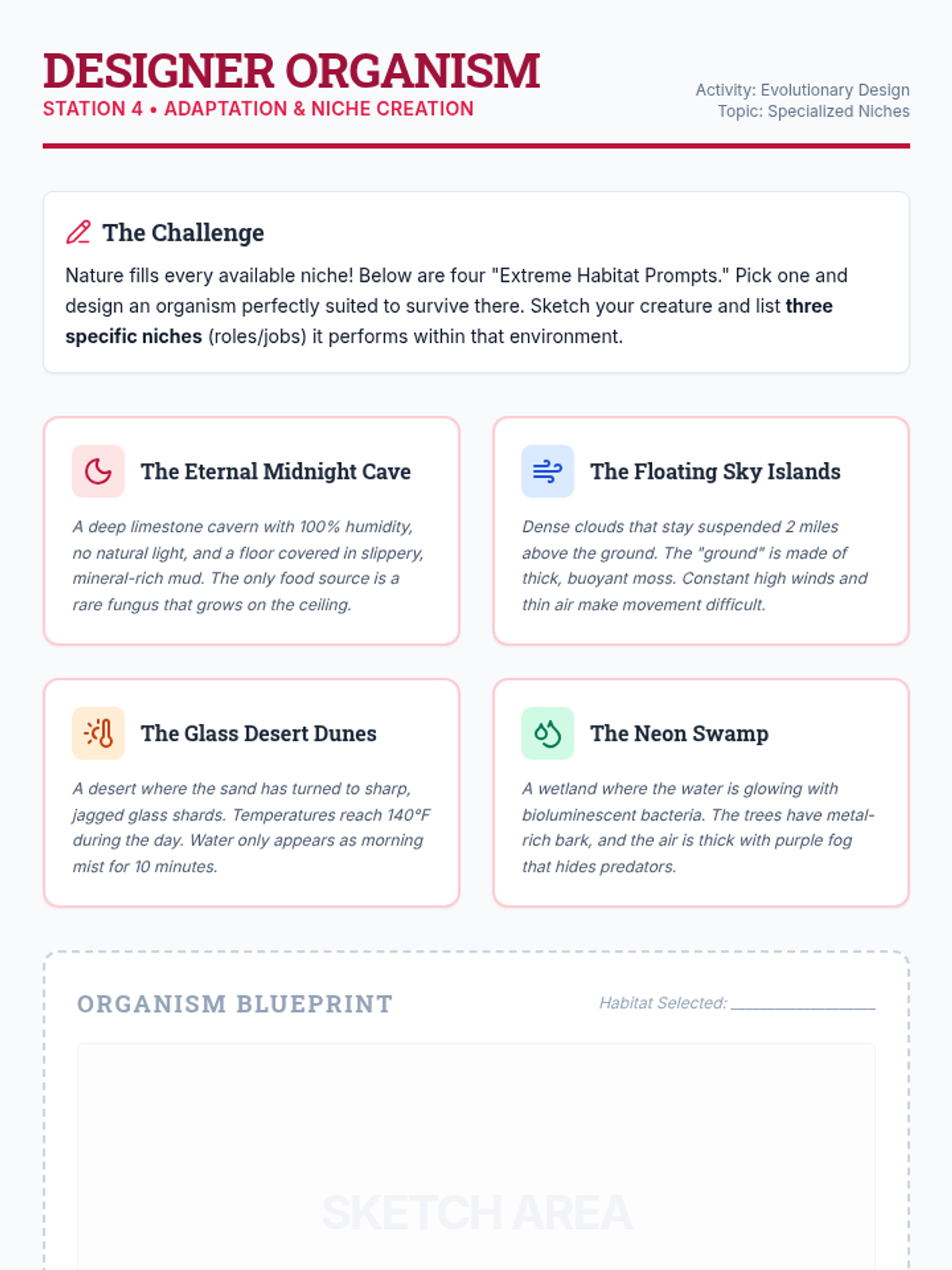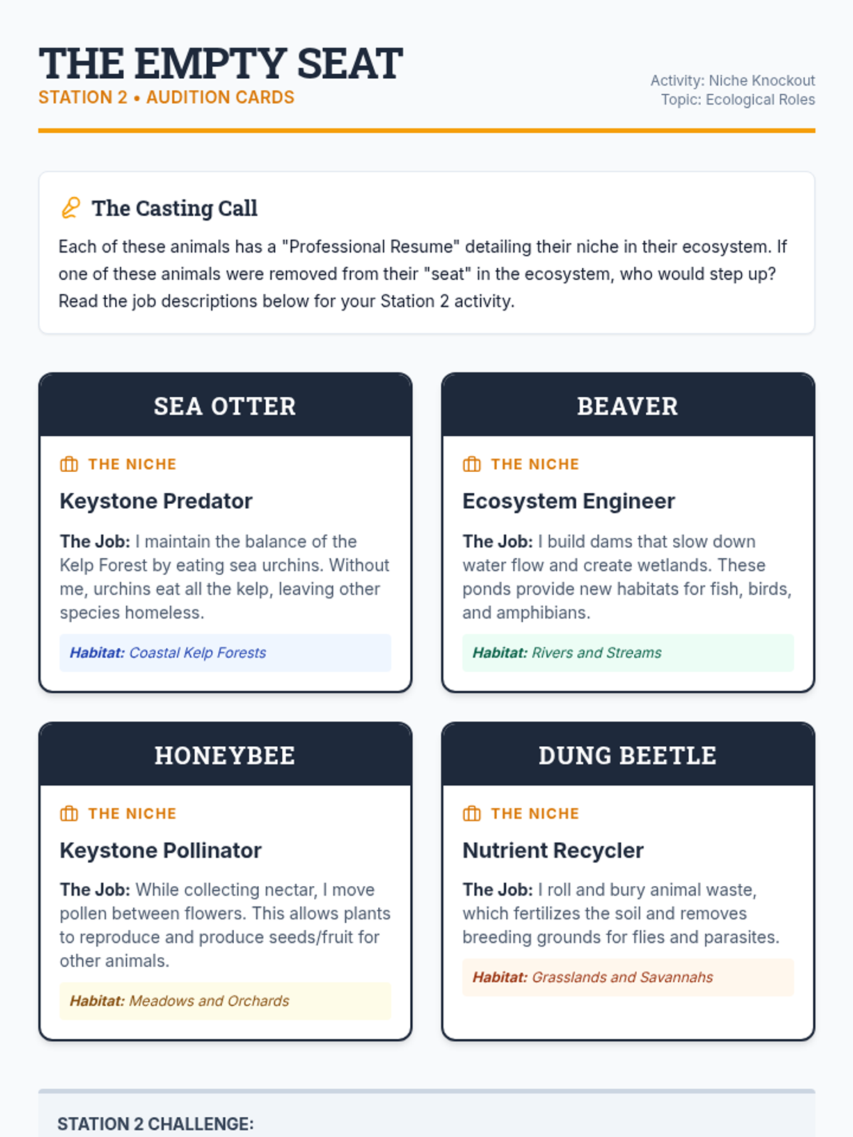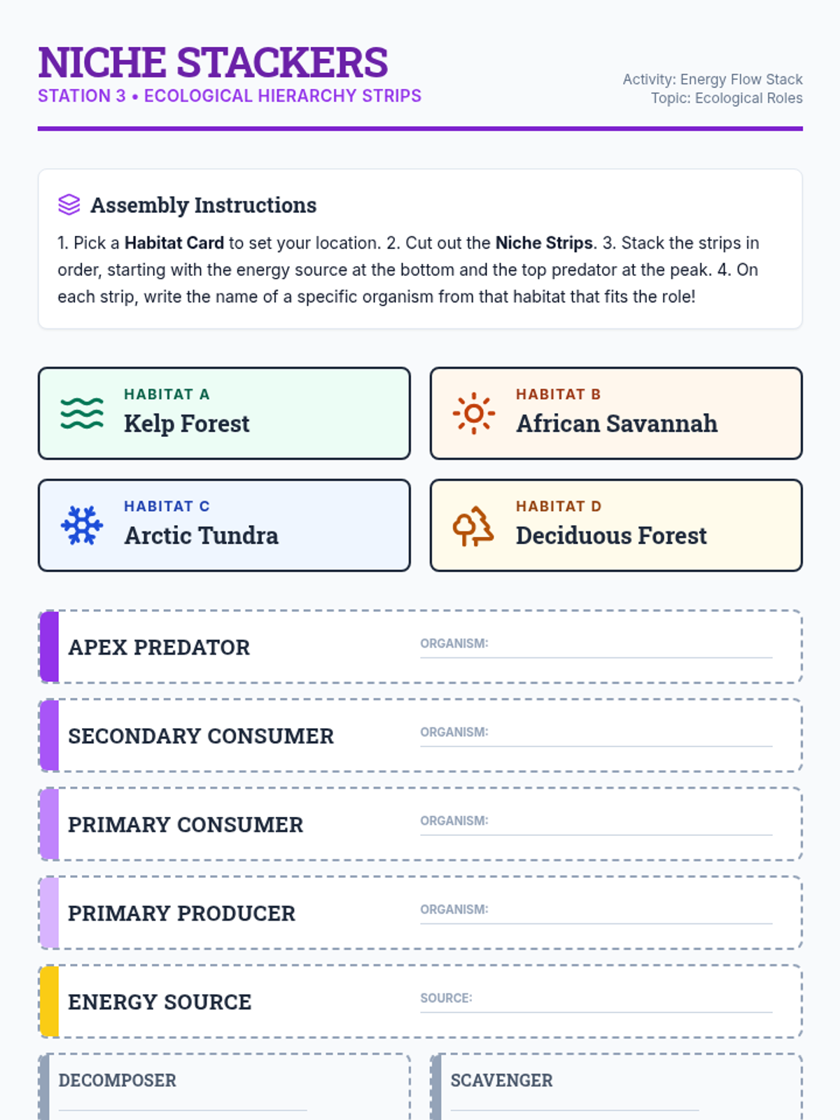 An interactive lesson for 7th graders to distinguish between habitat and niche, explore specific roles within ecosystems, and predict outcomes of ecological disruptions.