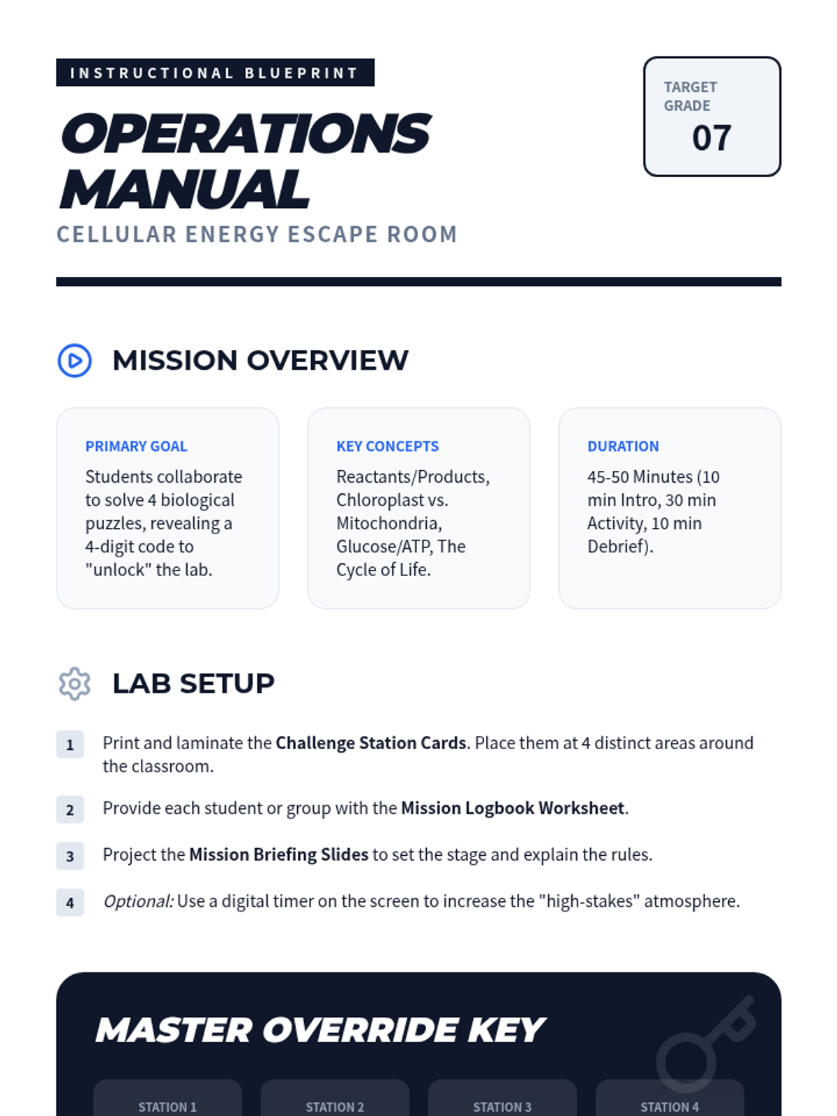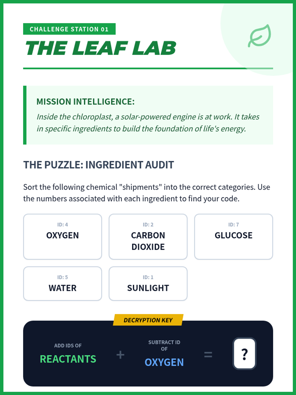 A high-energy, collaborative escape room experience where 7th graders decode the chemical secrets of photosynthesis and cellular respiration to 'unlock' a simulated lab. students will model reactions and track energy flow through a series of hands-on puzzles.