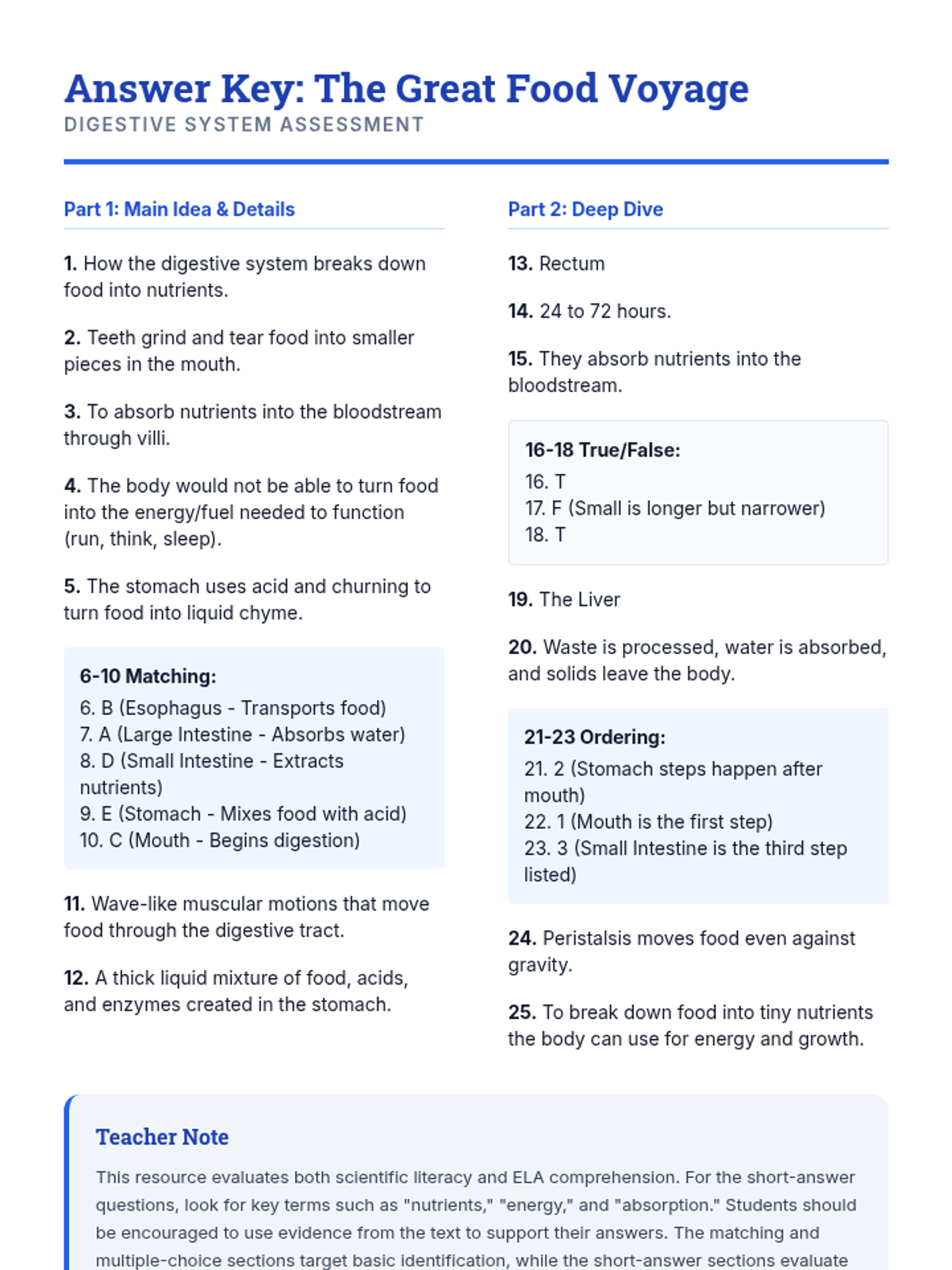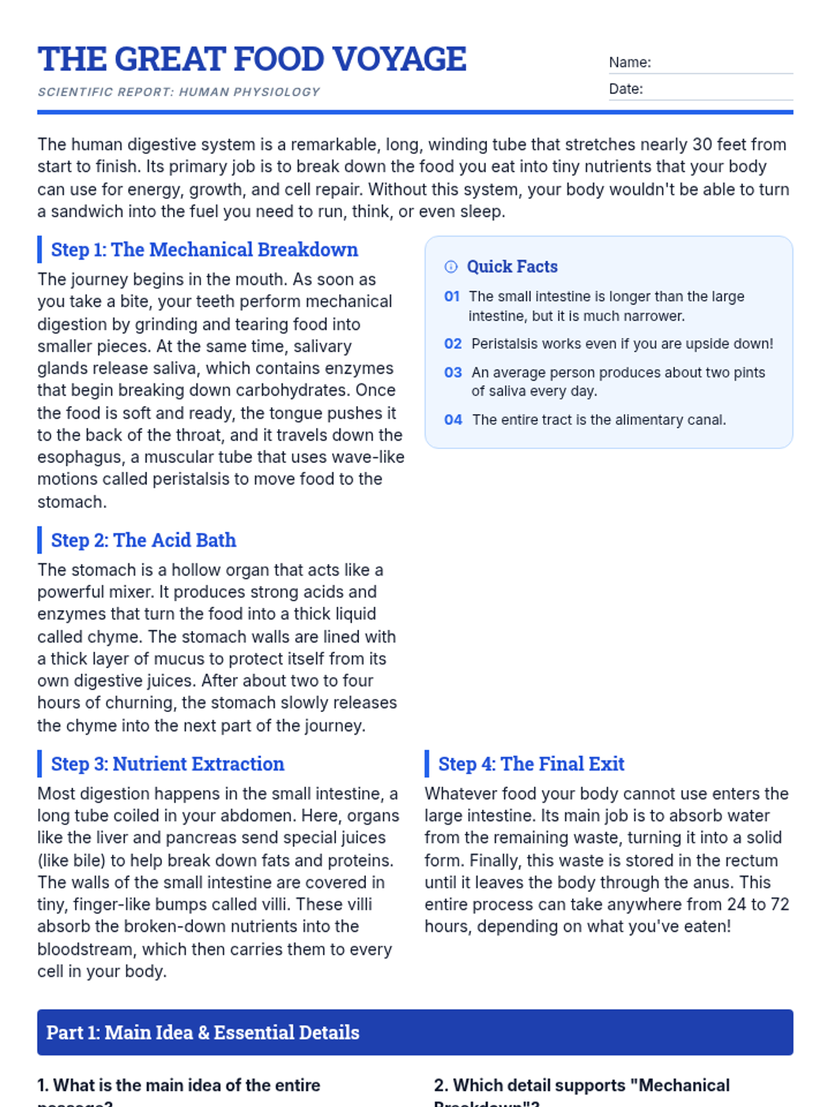 A comprehensive exploration of the human digestive system, focusing on the journey of food and the specific functions of each organ while building ELA skills in identifying main ideas and supporting details.