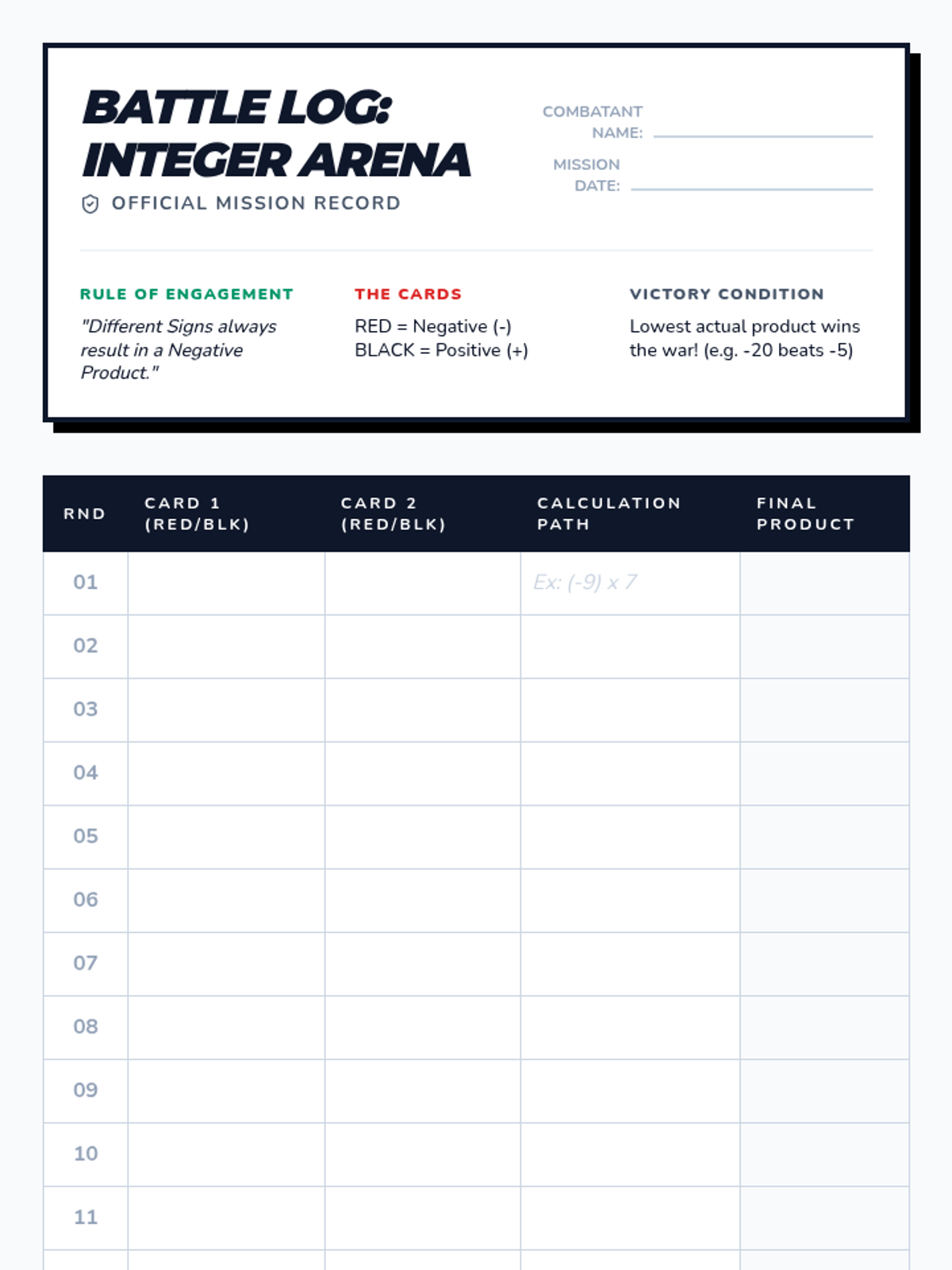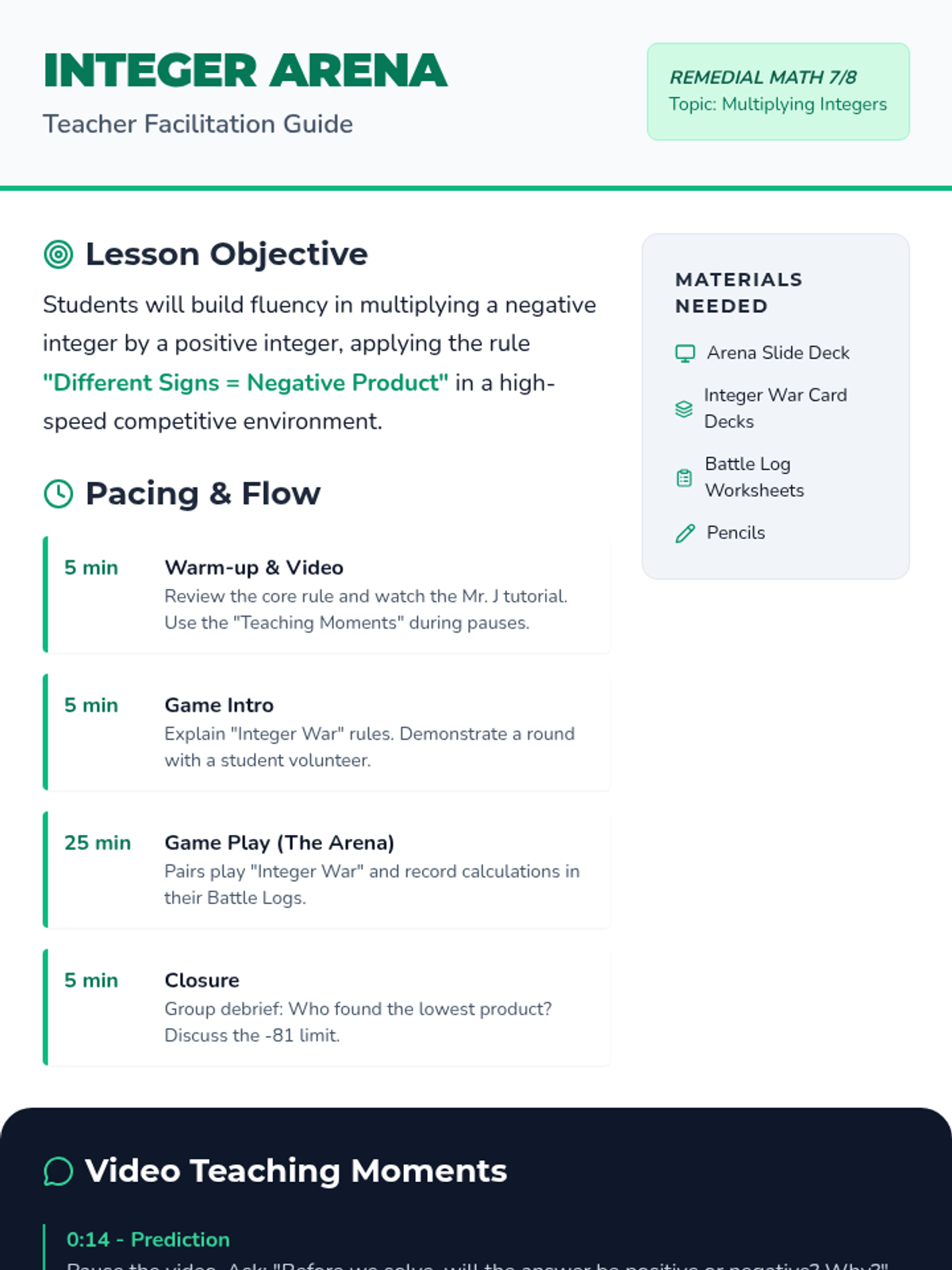 A fast-paced, competitive lesson where students master multiplying negative and positive integers through a card game called Integer War. Includes a video tutorial and a structured recording sheet for fluency practice.