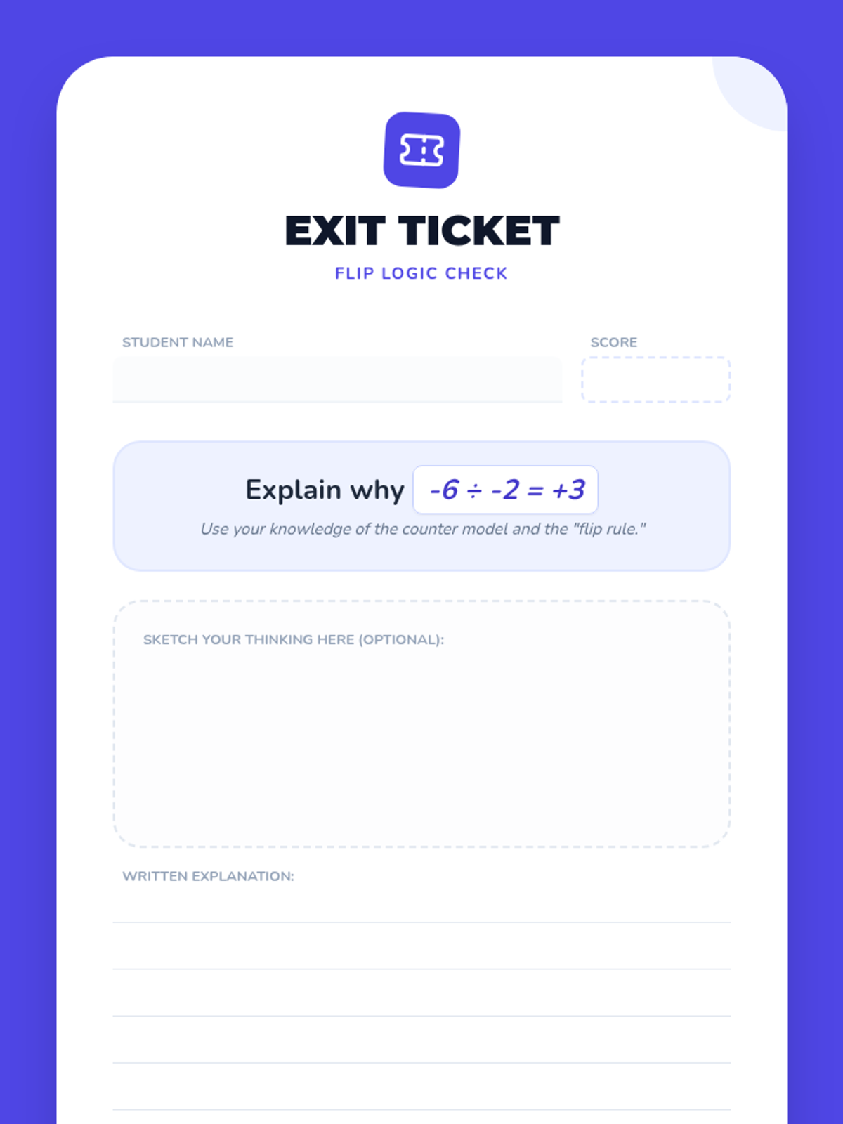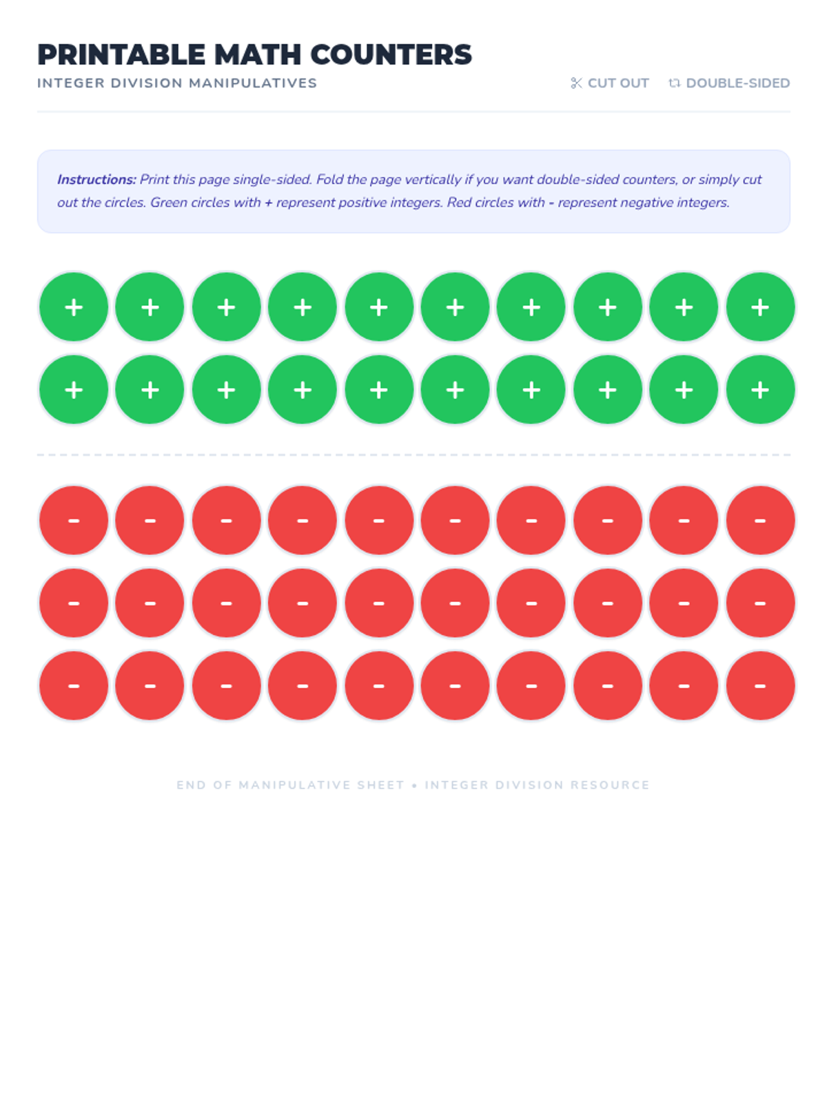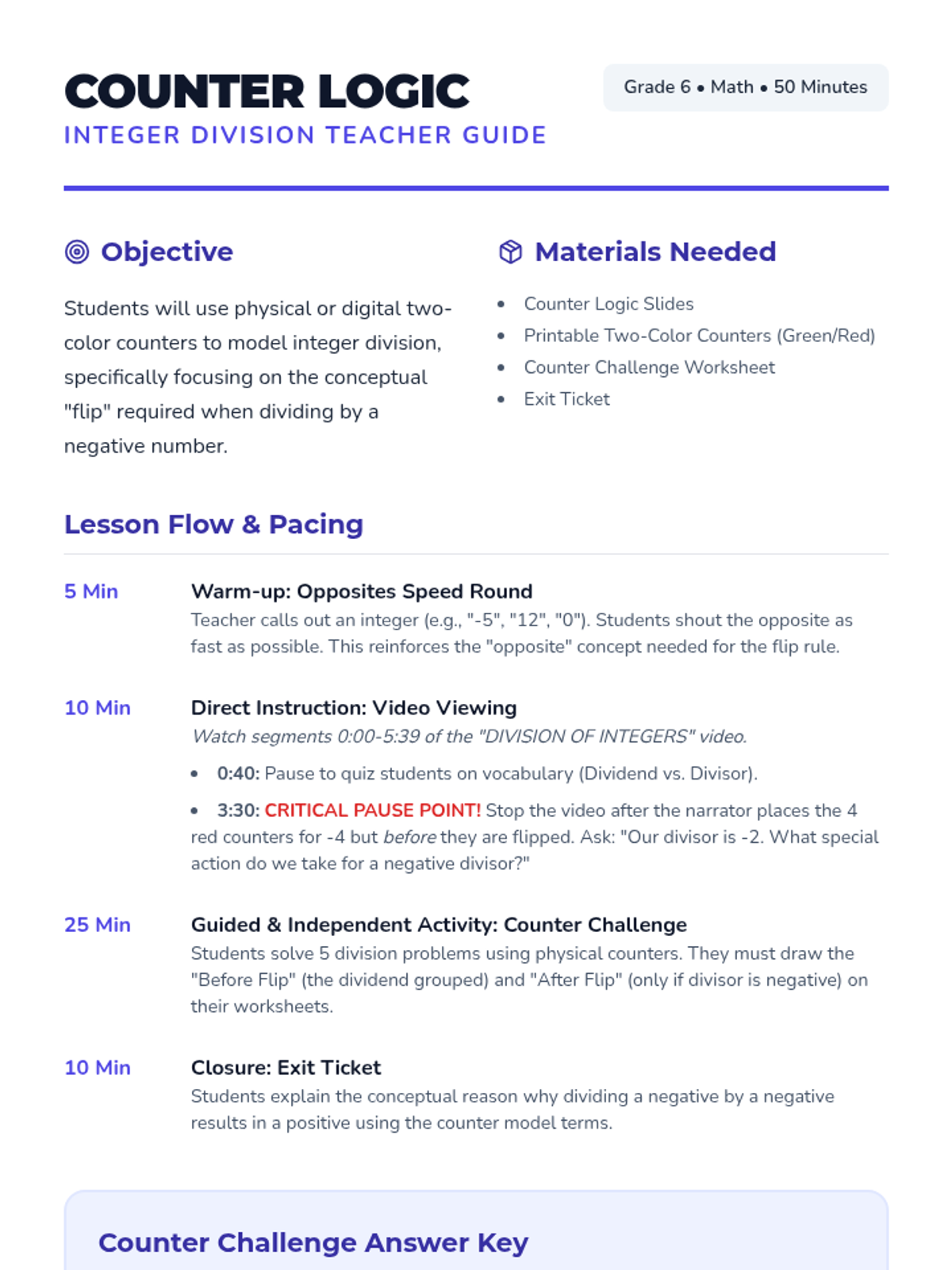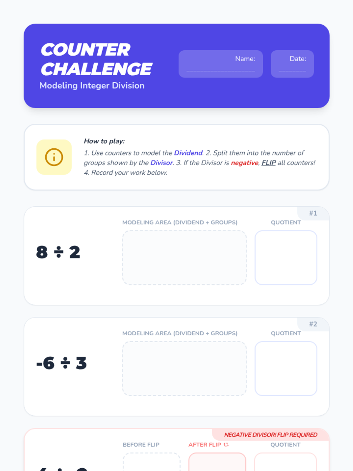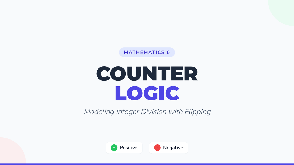 A hands-on introduction to dividing integers using two-color counters. Students explore the concept of 'flipping' counters when dividing by a negative number to understand why sign rules work.