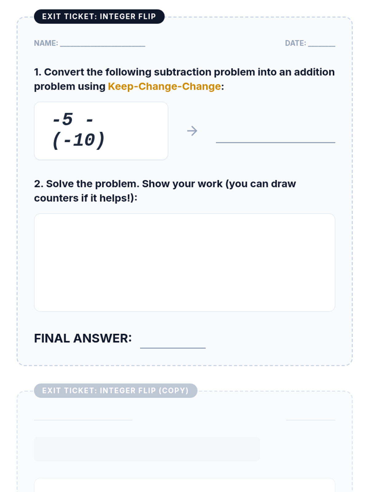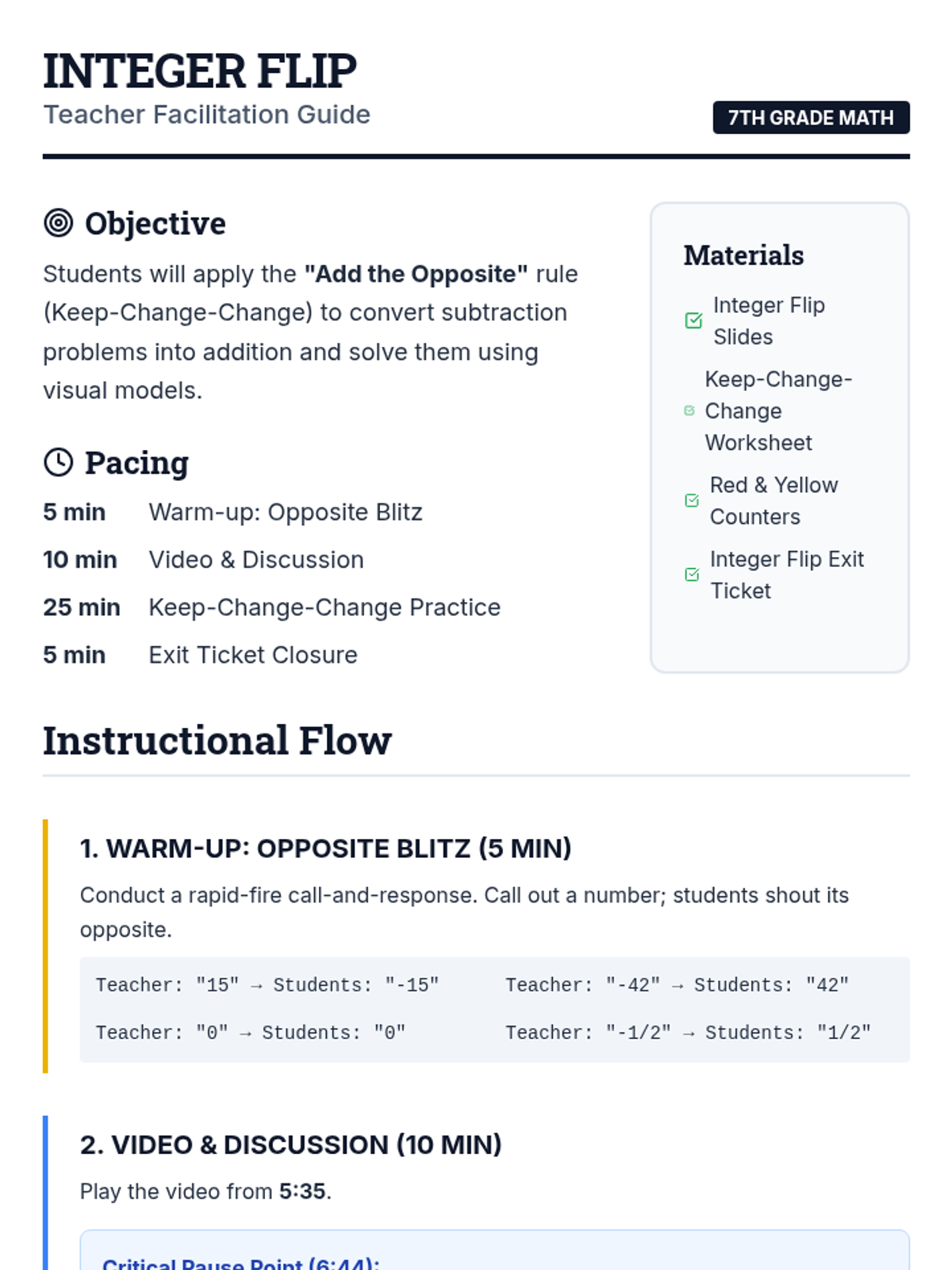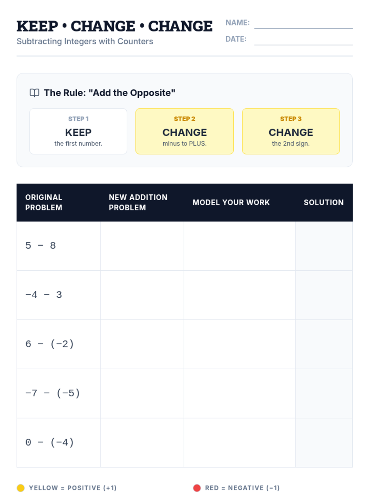 A lesson where students master integer subtraction by transforming problems into addition using the 'Add the Opposite' (Keep-Change-Change) strategy and modeling with two-color counters.