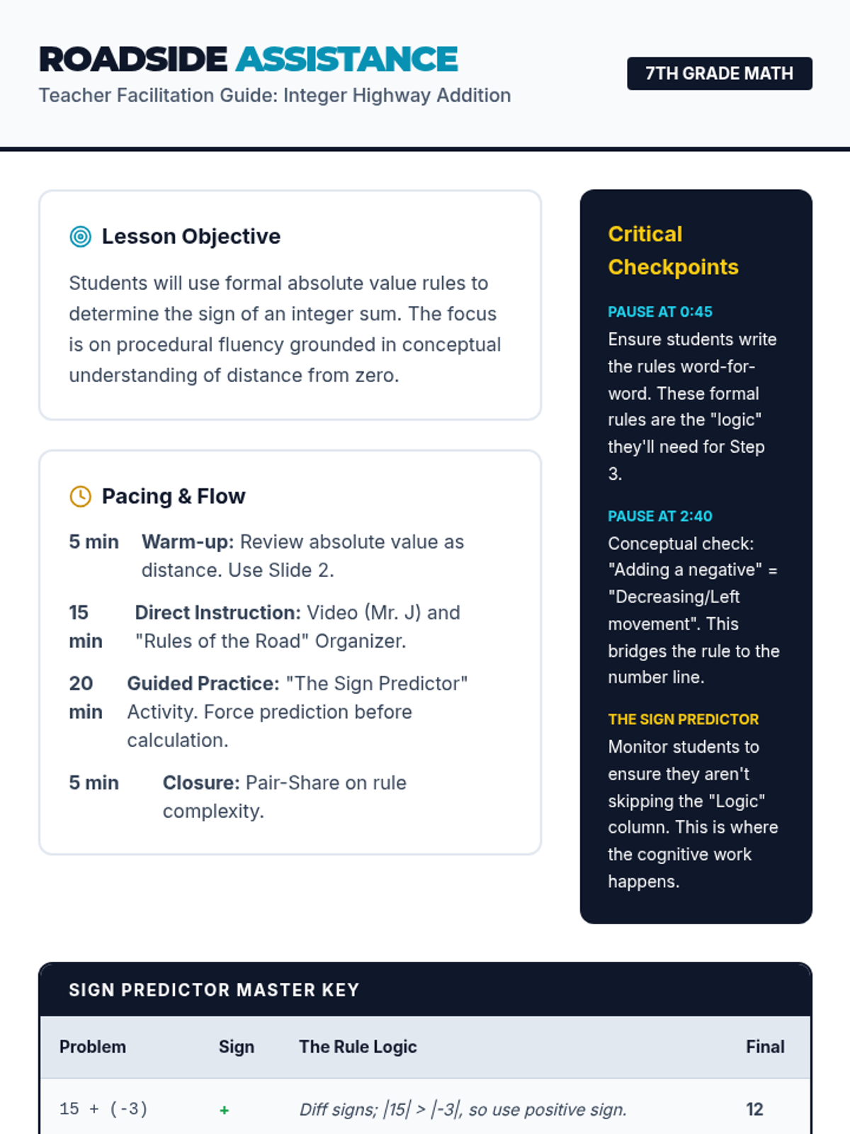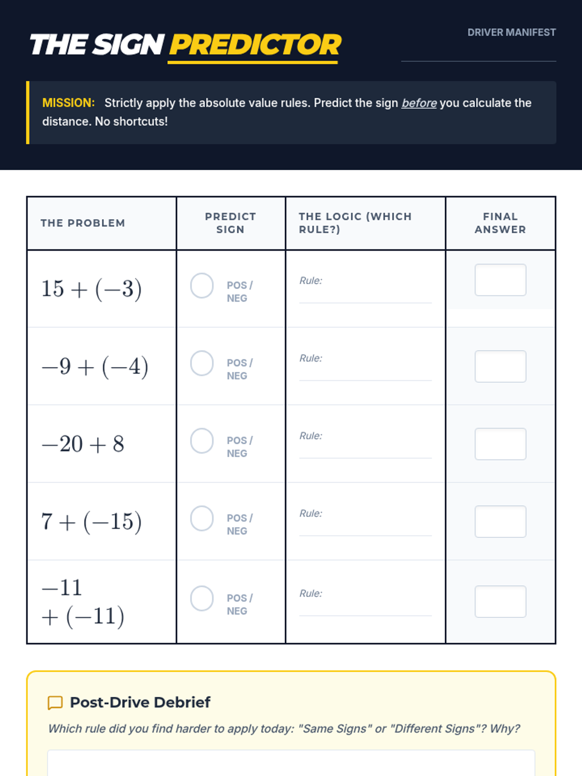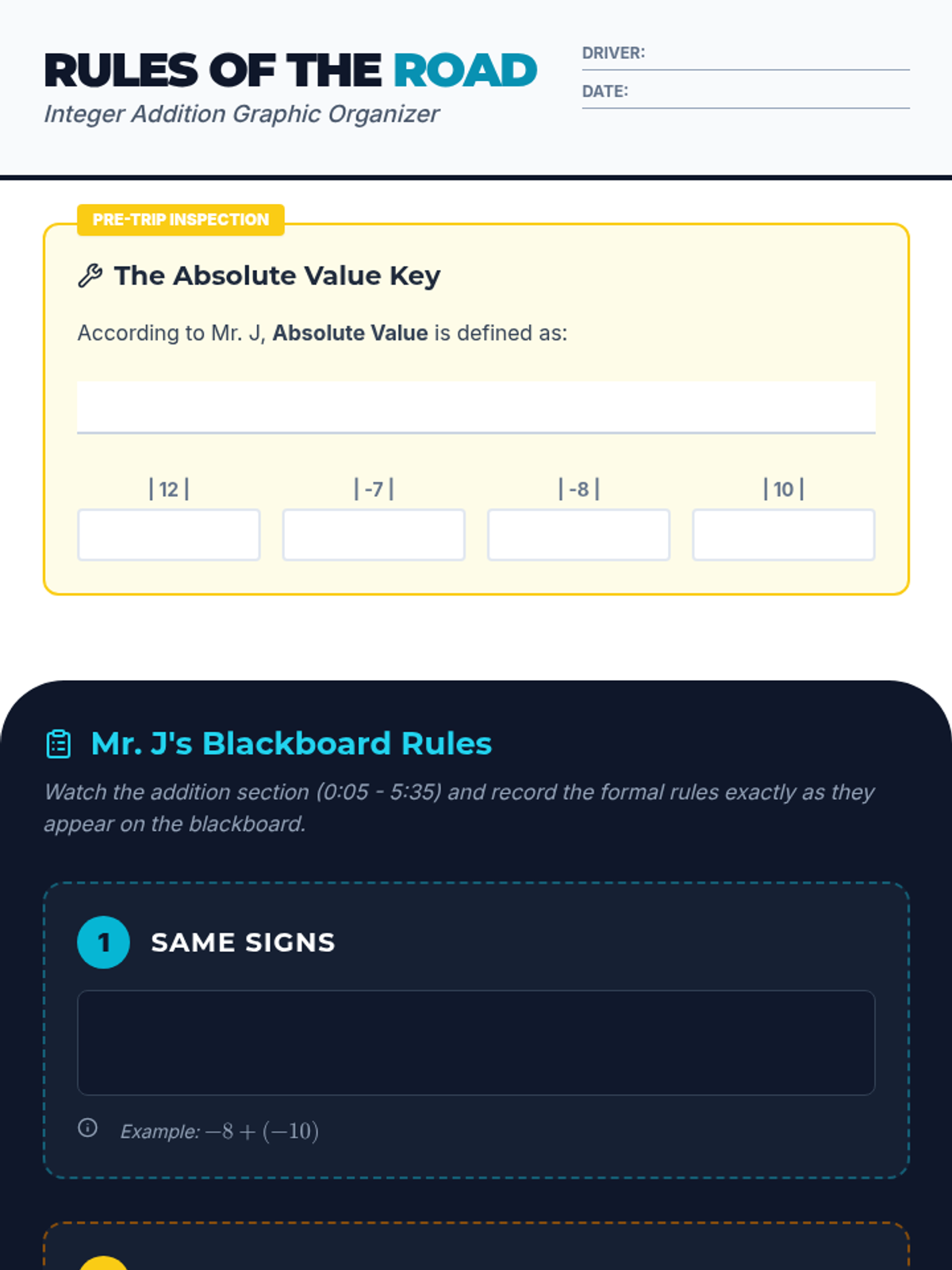 Students will master adding integers by applying formal absolute value rules. They will use a video-guided graphic organizer and a predictive activity to build conceptual understanding of why sums result in specific signs.
