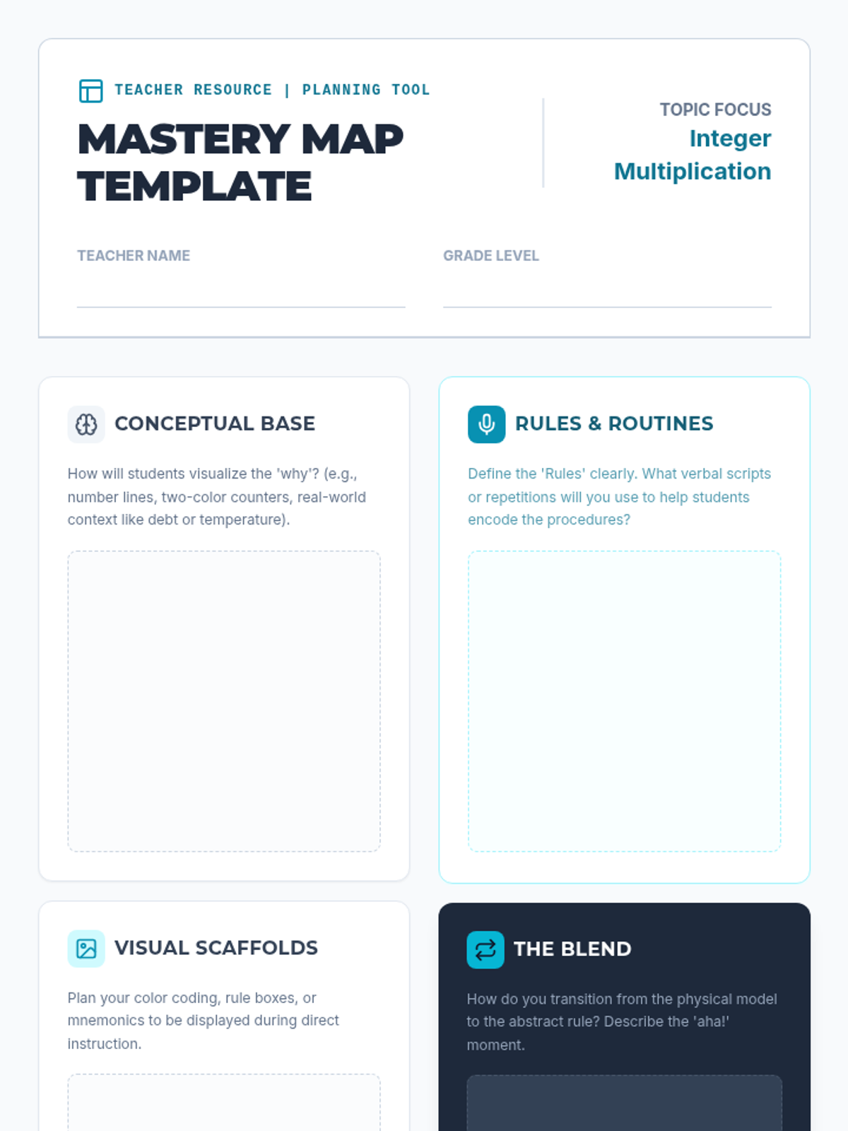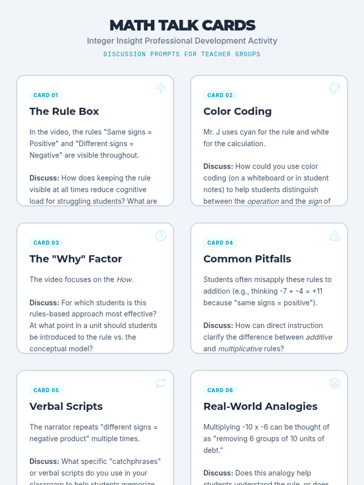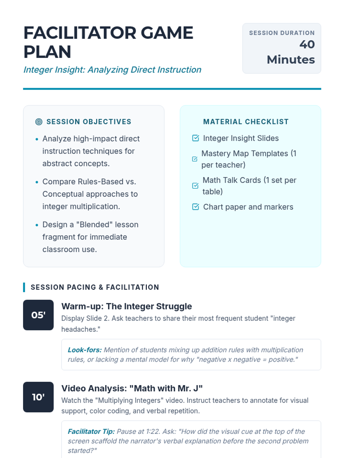 A professional development session for teachers to analyze direct instruction techniques for multiplying integers, comparing rules-based and conceptual approaches.