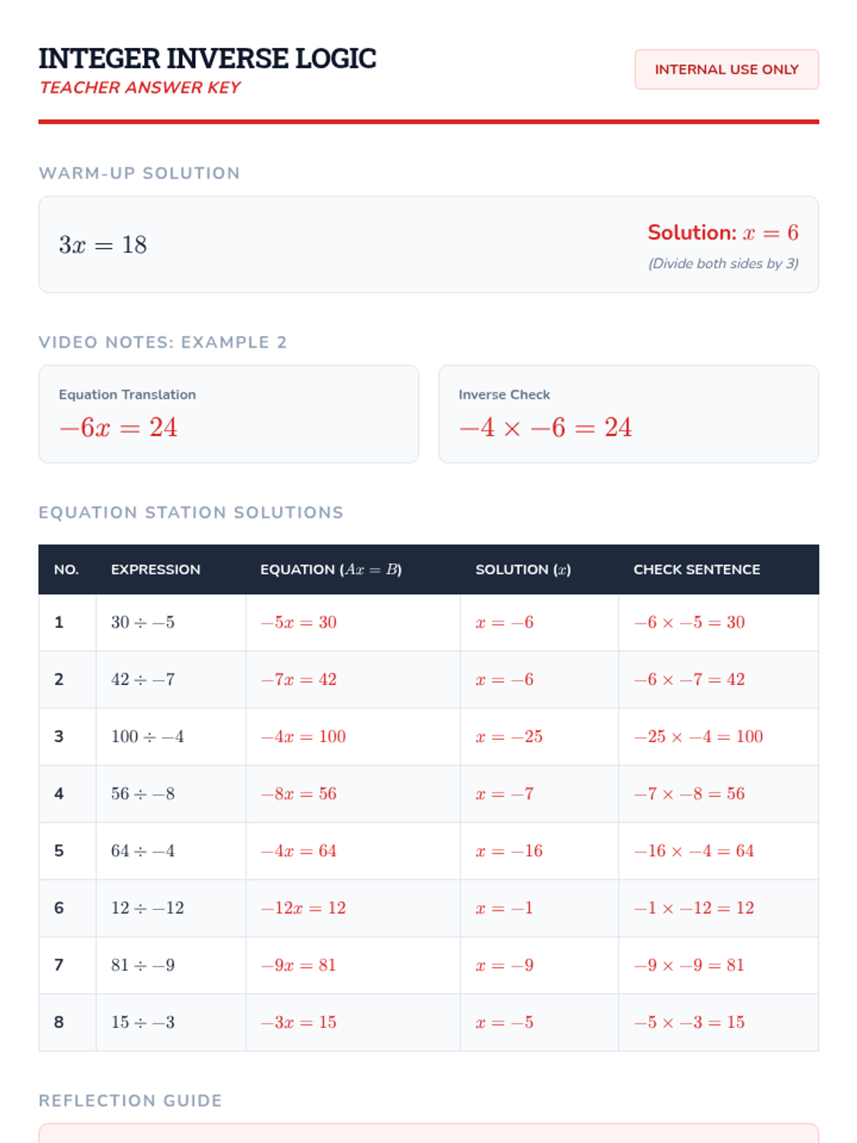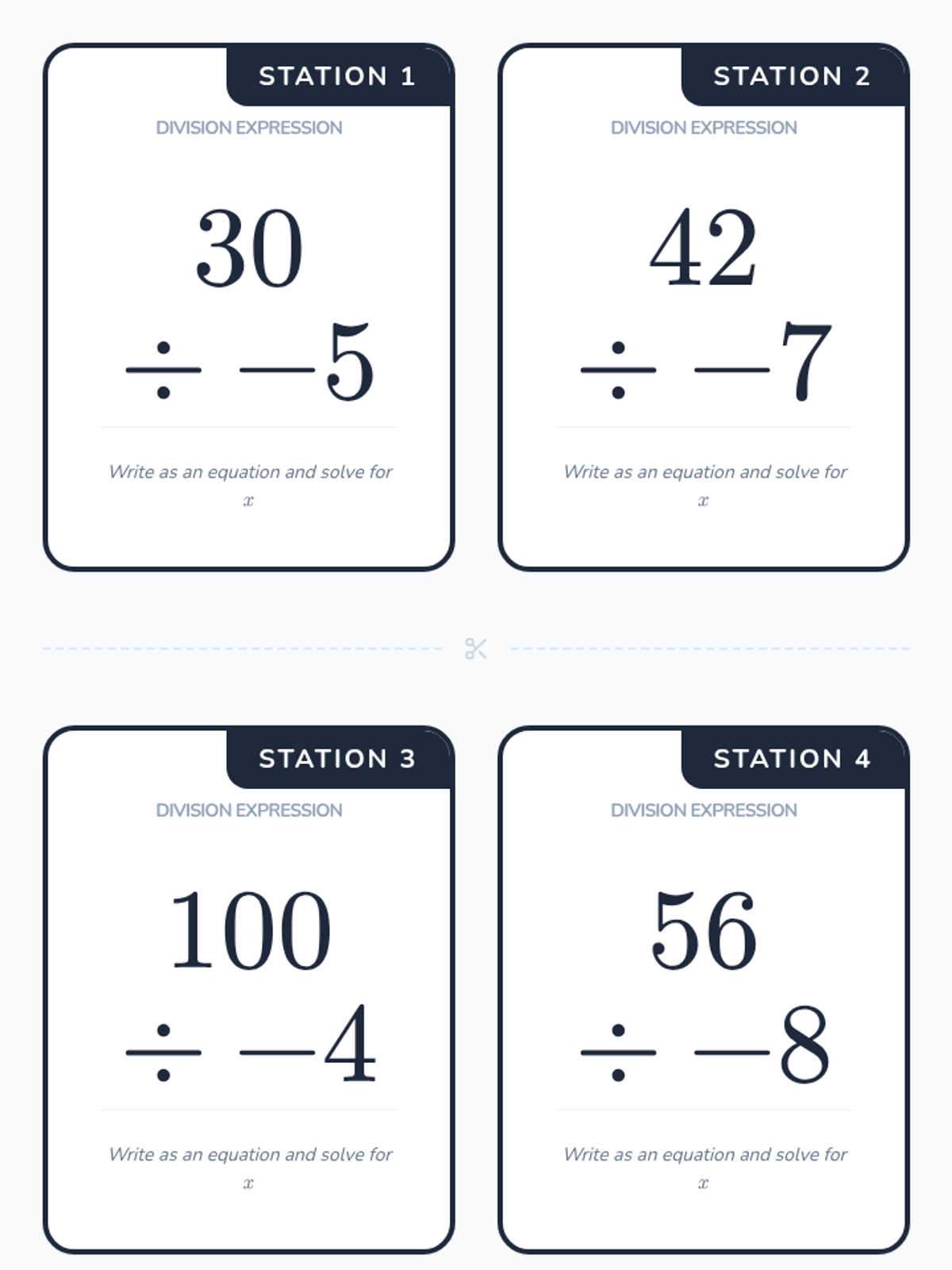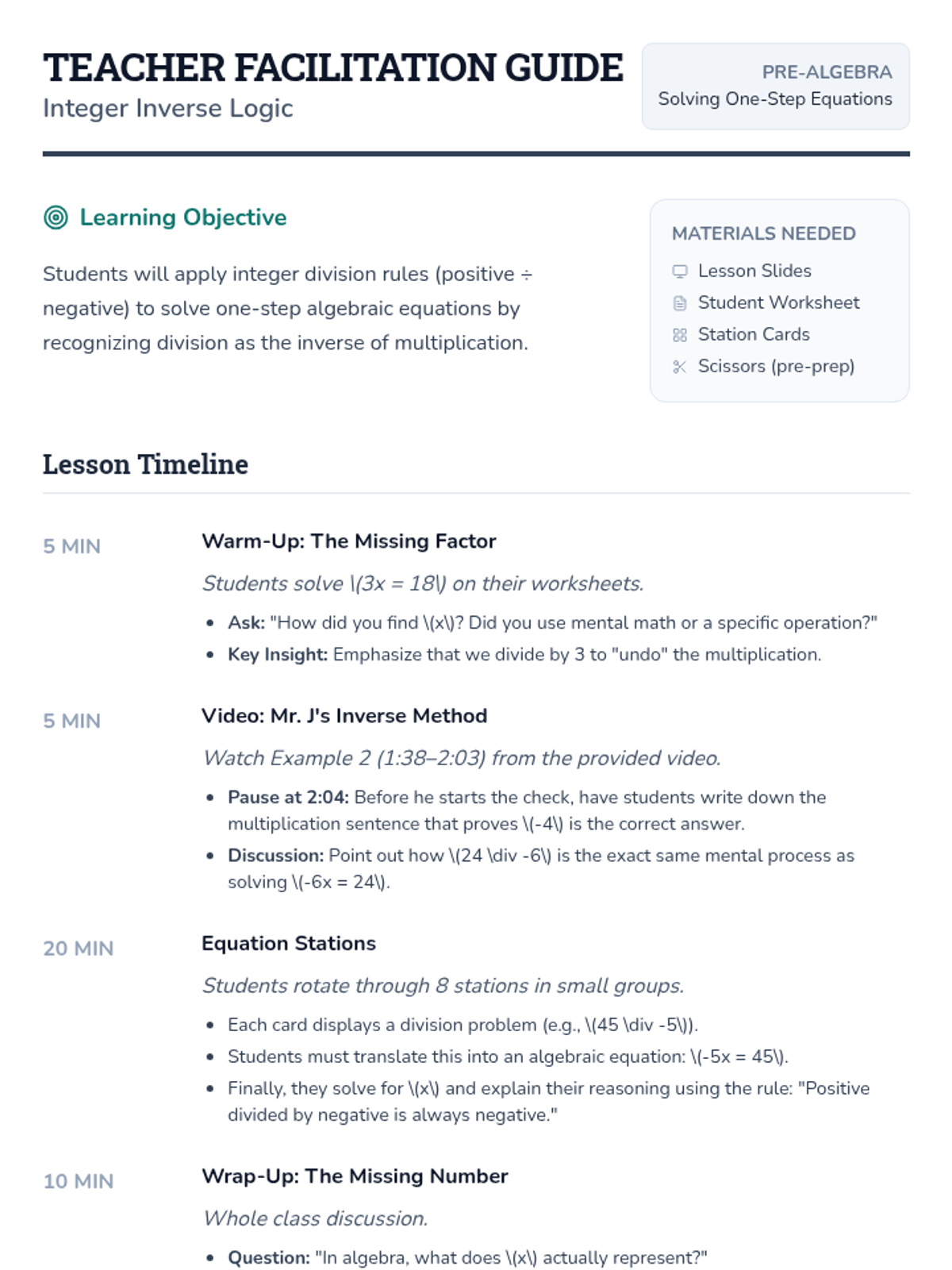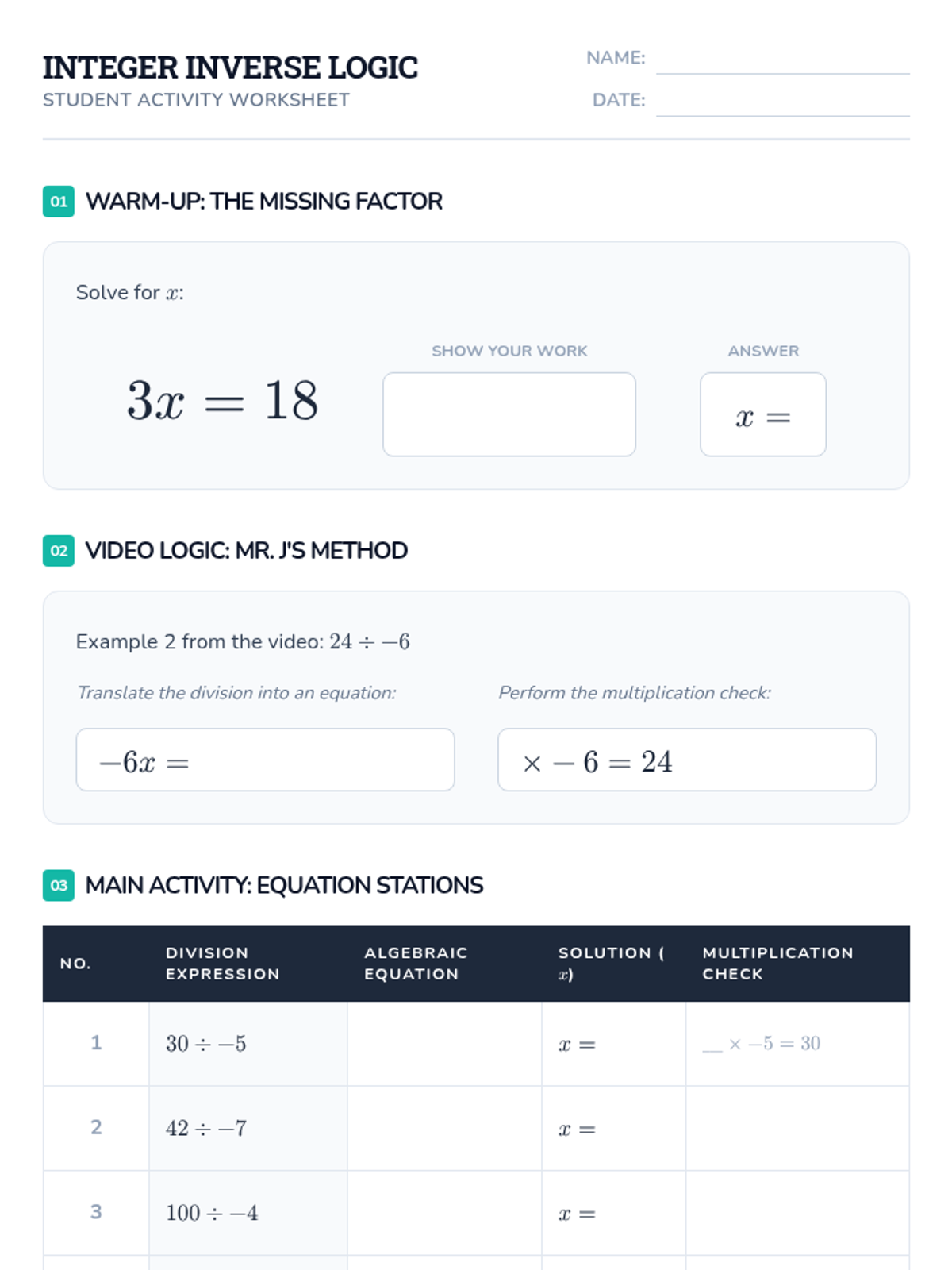A Pre-Algebra lesson focused on the relationship between integer division and one-step algebraic equations, featuring a 'Math with Mr. J' video and an 'Equation Stations' activity.