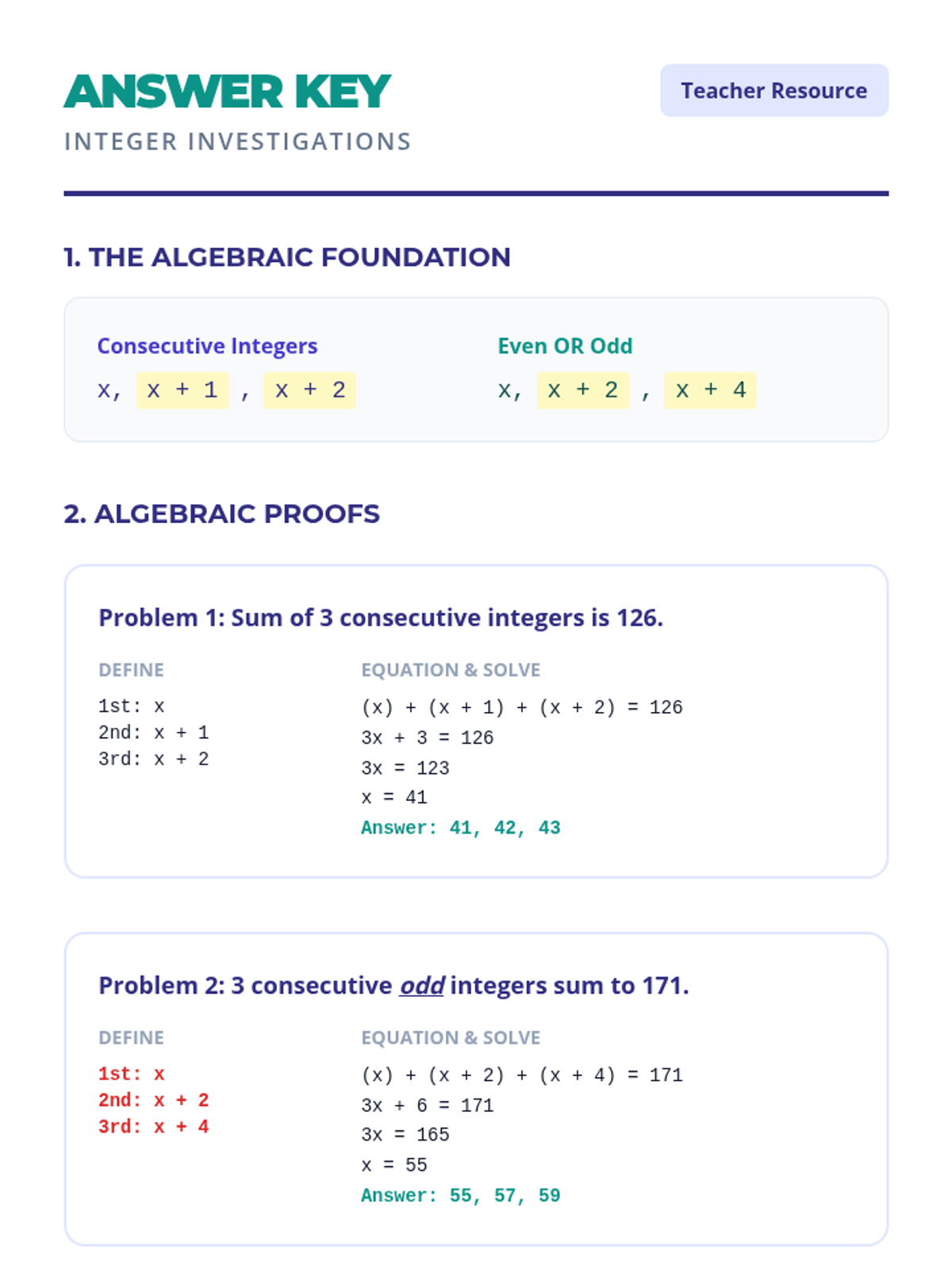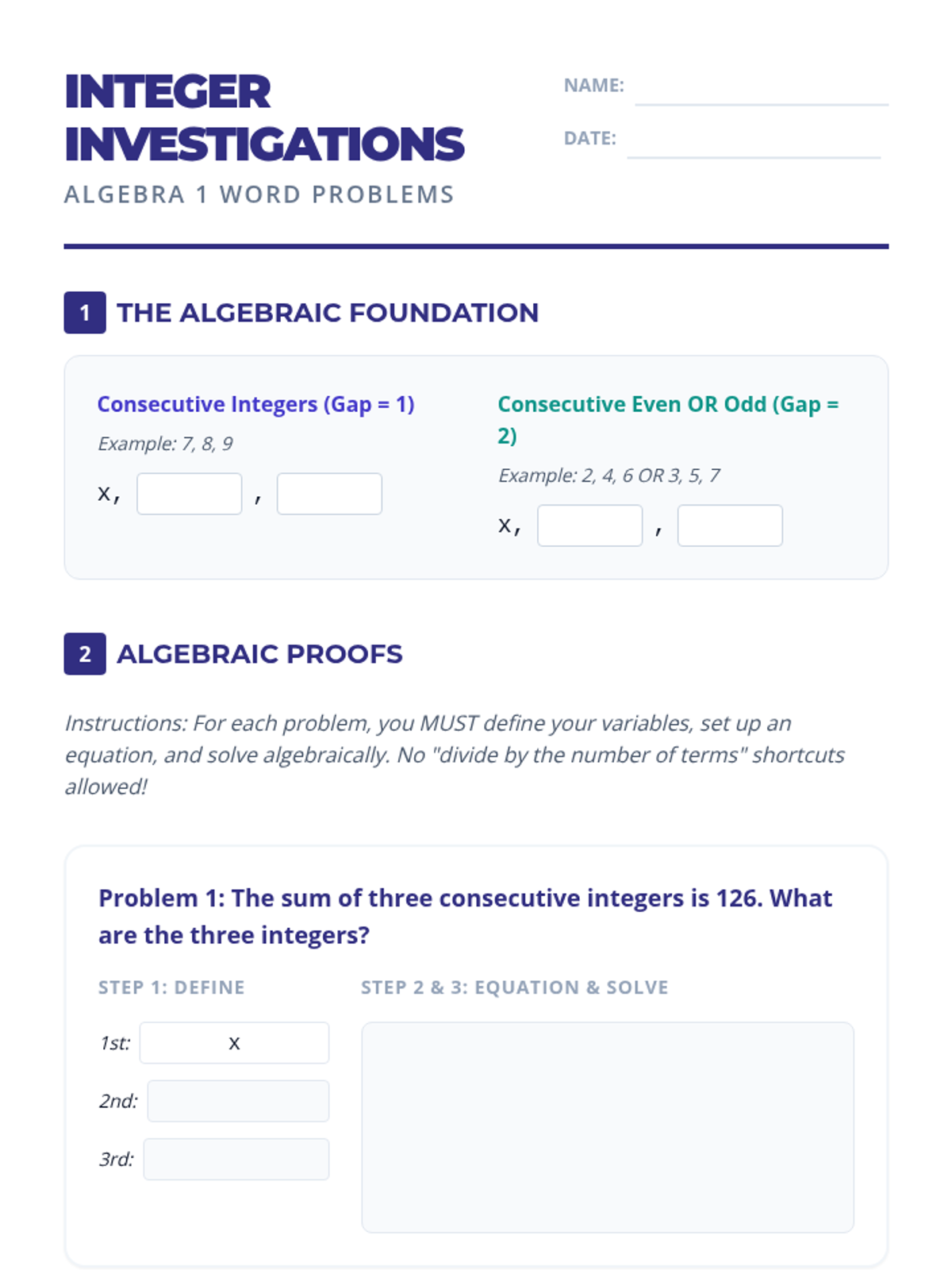 A comprehensive lesson for 8th Grade Algebra 1 students focused on setting up and solving linear equations for consecutive integer word problems, emphasizing algebraic methods over arithmetic shortcuts.