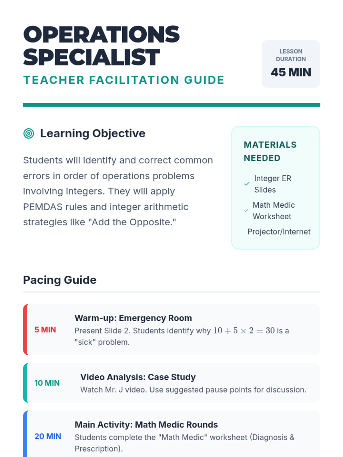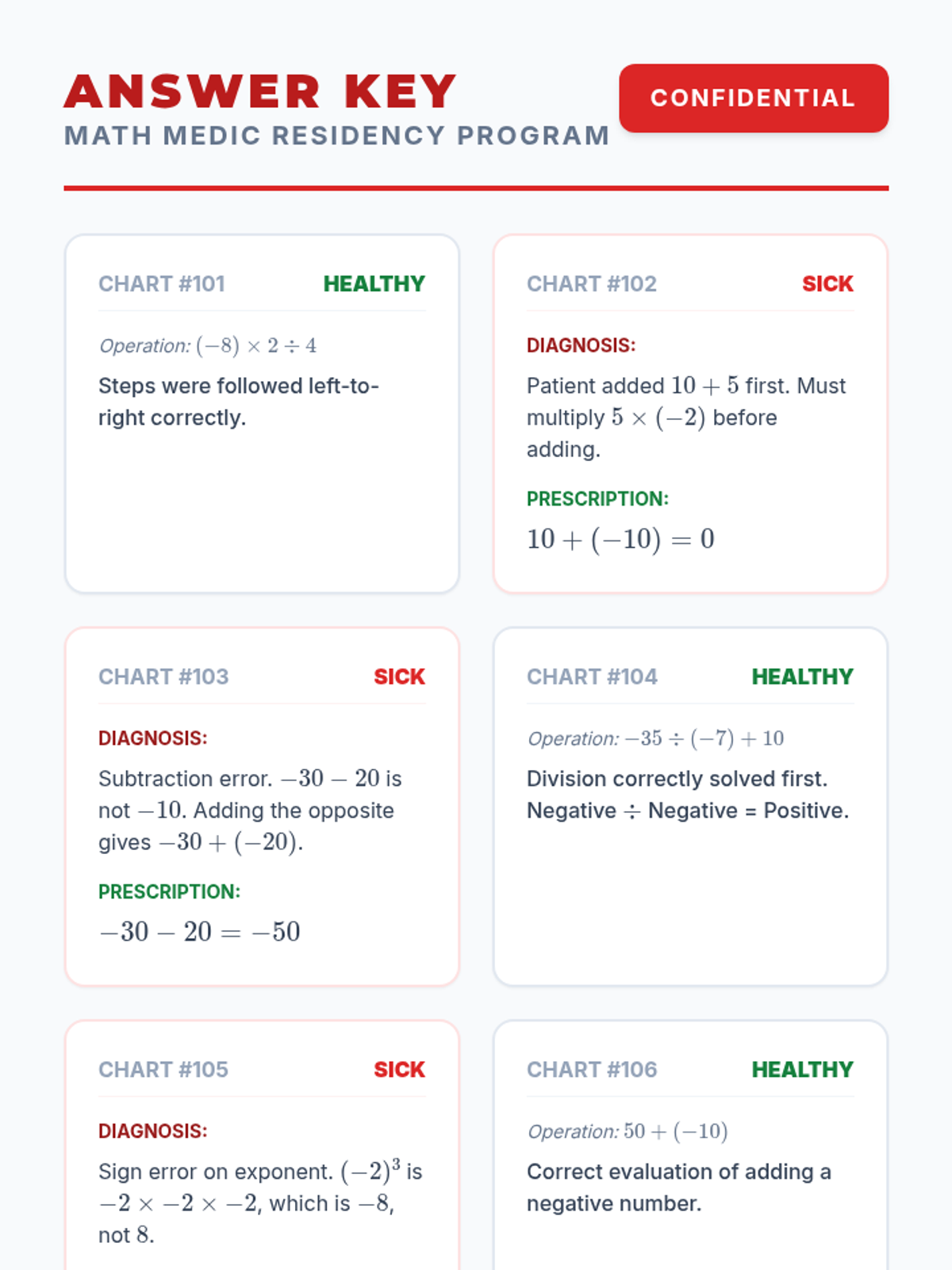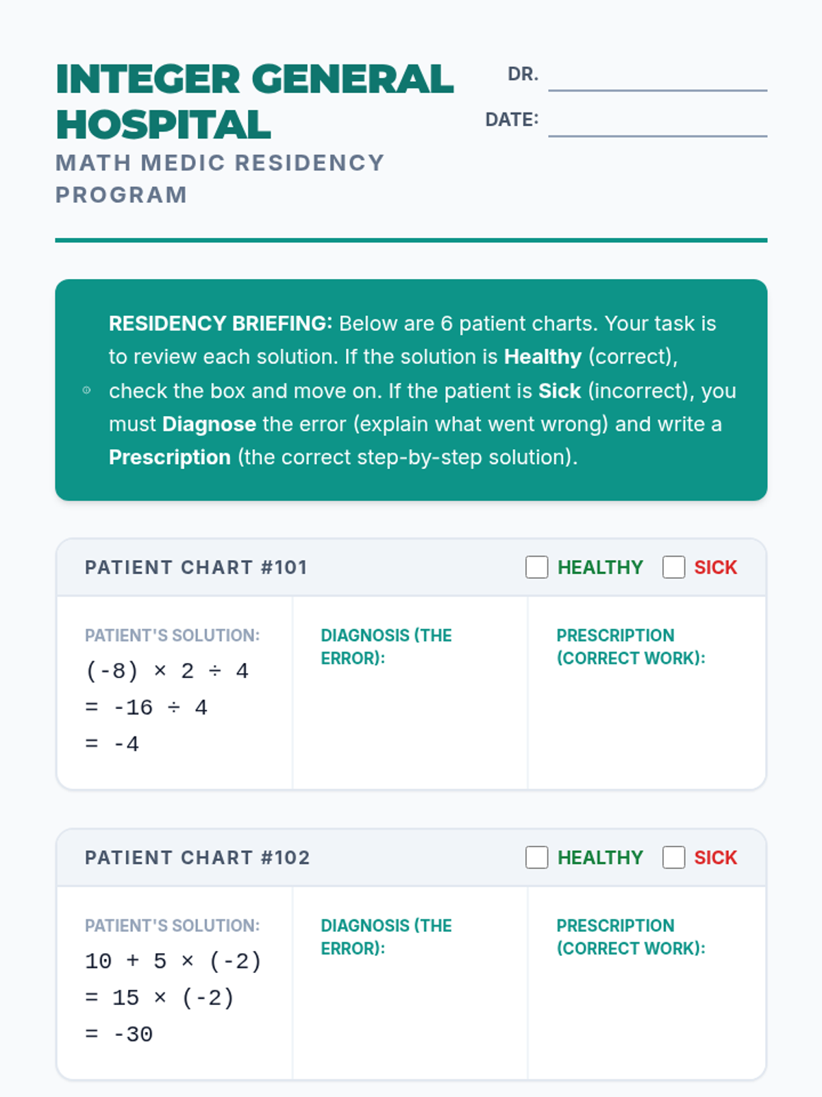 Students will learn to identify and correct common errors in order of operations problems involving integers through a 'medical diagnosis' themed activity and video analysis.