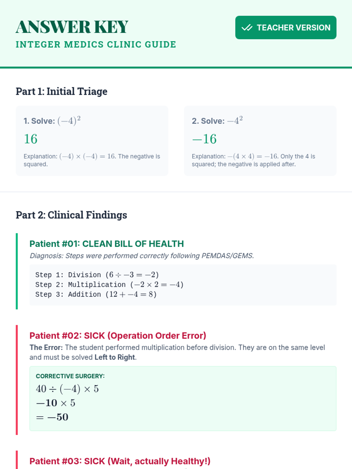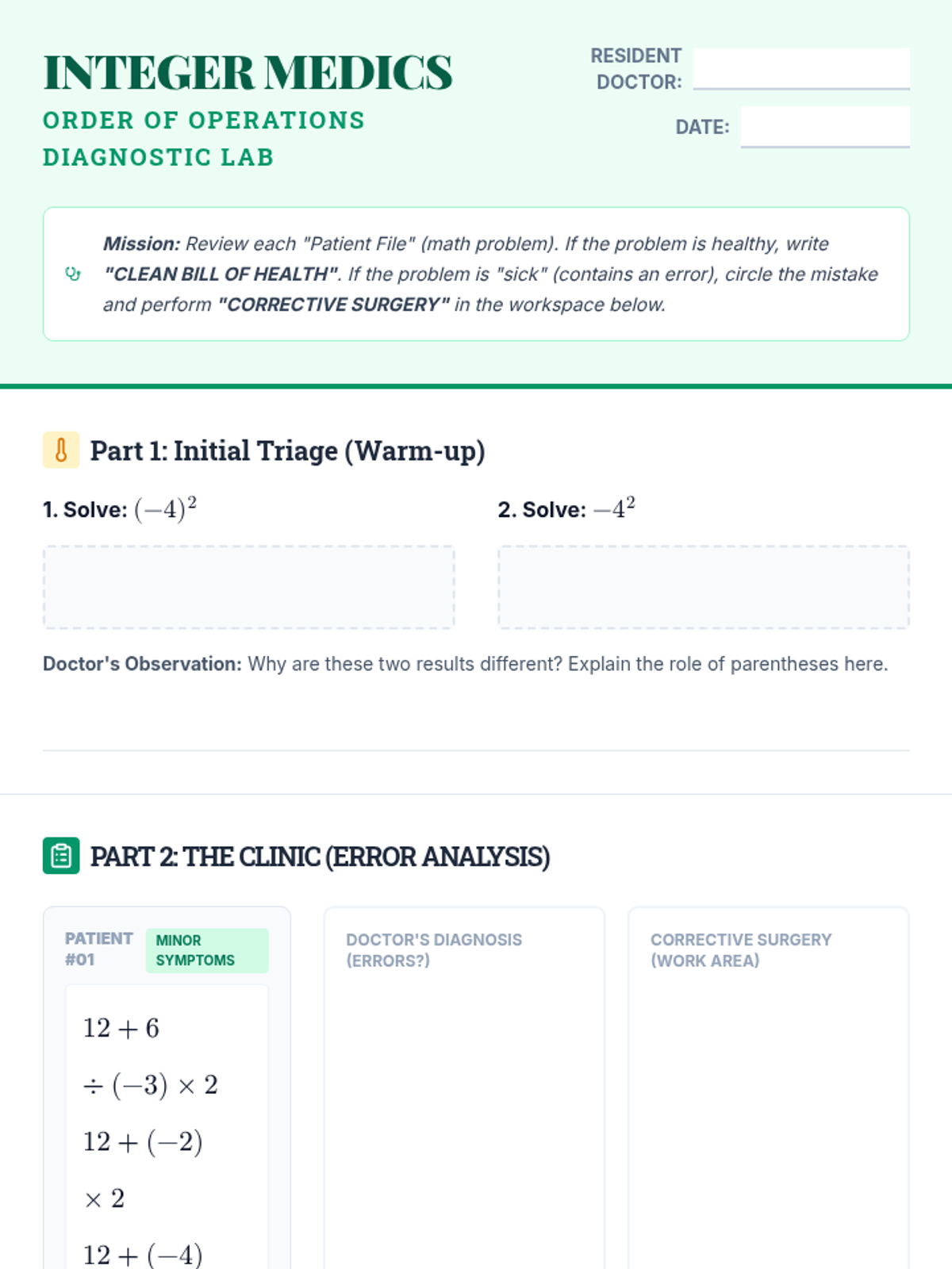 A lesson focused on identifying and correcting common misconceptions in order of operations involving negative numbers, featuring an 'Error Analysis Doctor' activity.