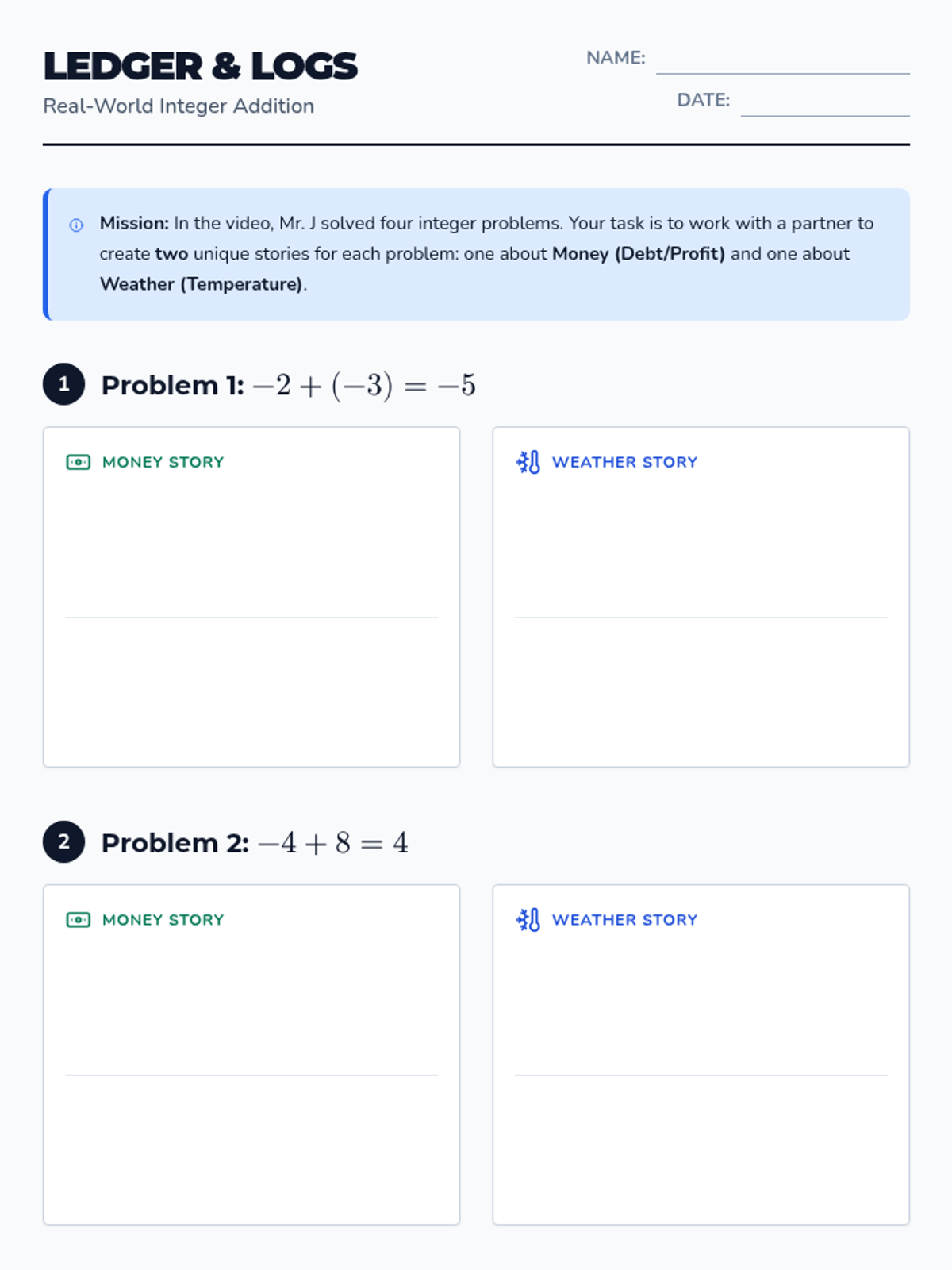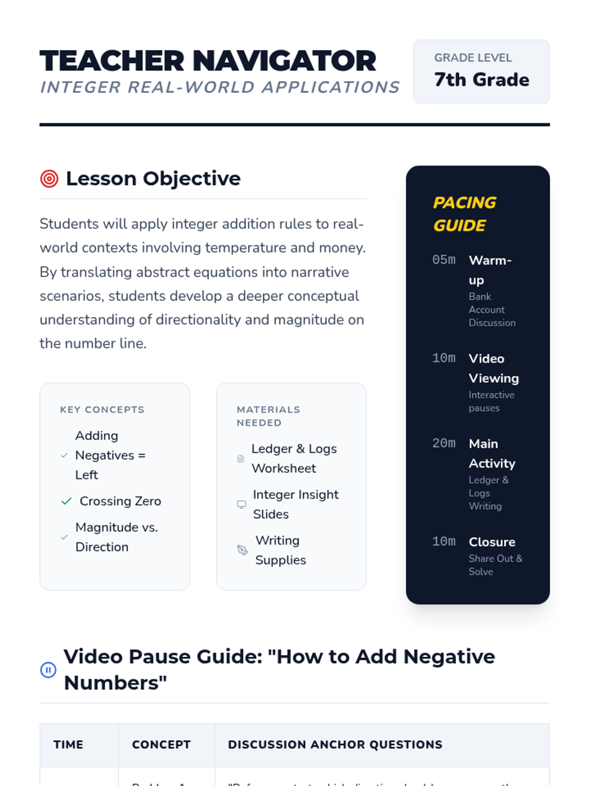 A 7th-grade lesson focusing on adding integers through real-world scenarios like bank balances and temperature changes, featuring a scaffolded video and creative word problem construction.