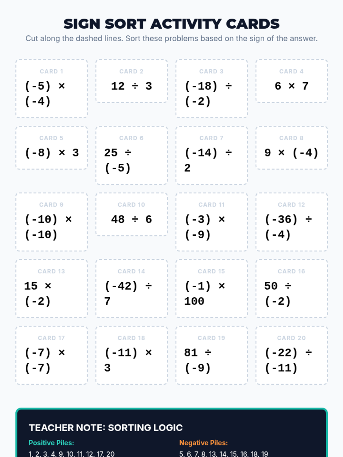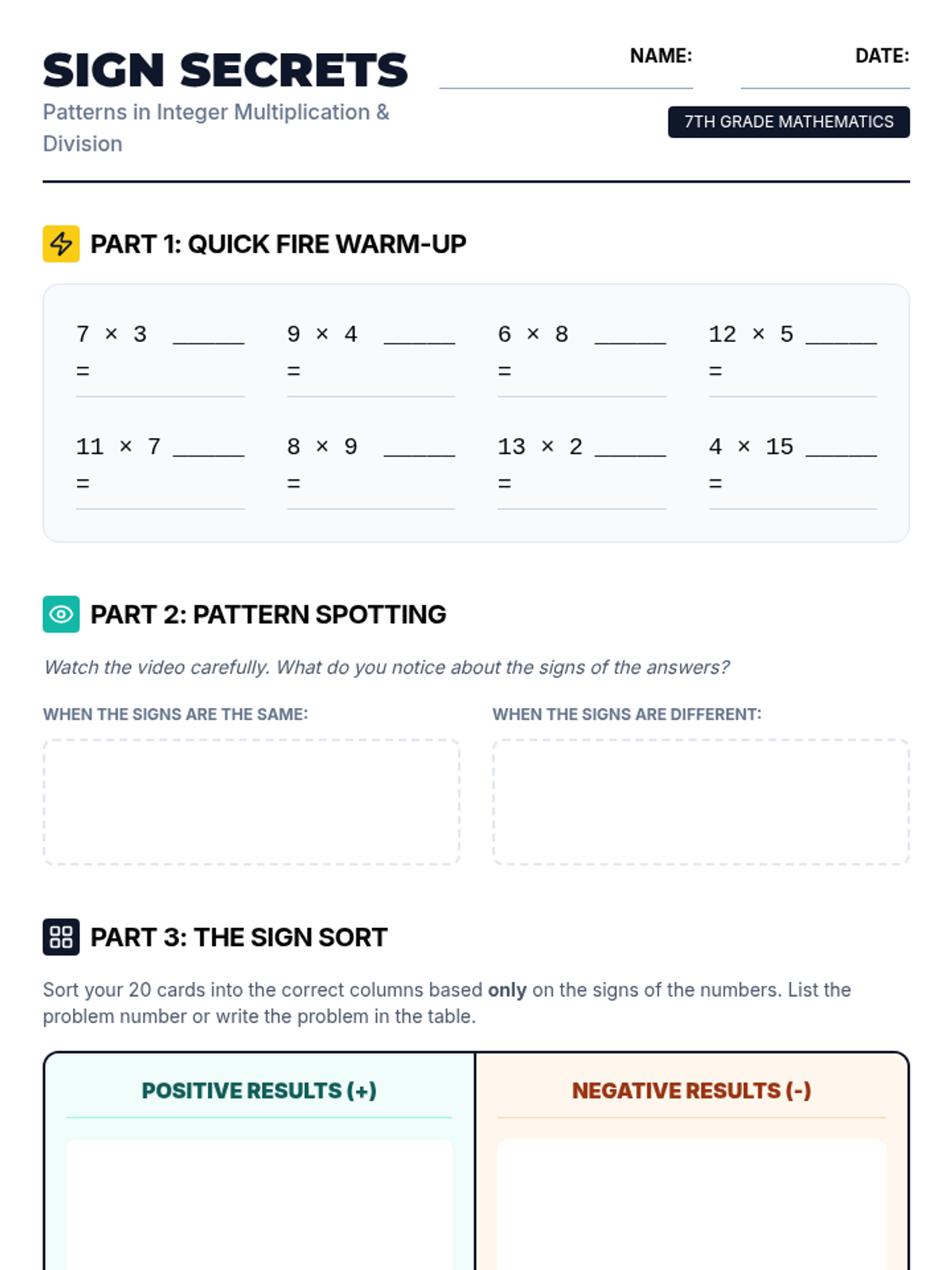 Students will discover and apply the rules for multiplying and dividing integers through pattern observation and a hands-on sorting activity.