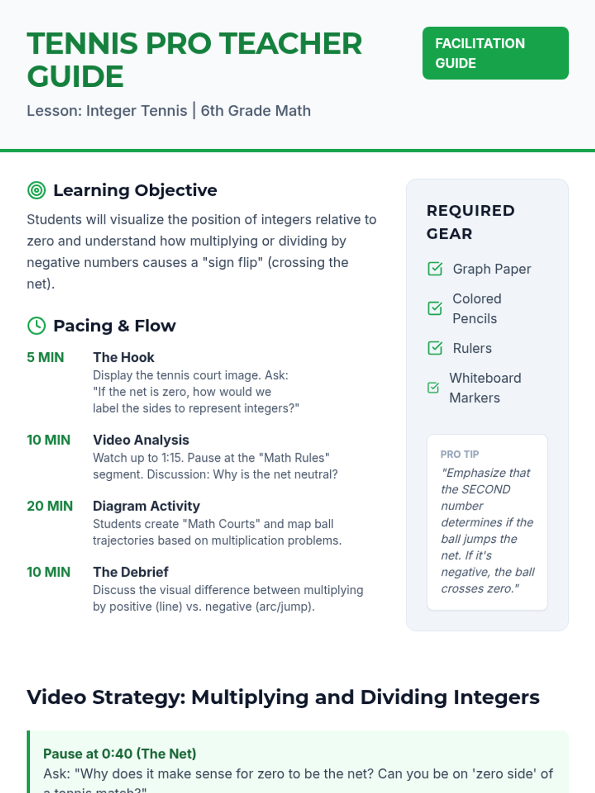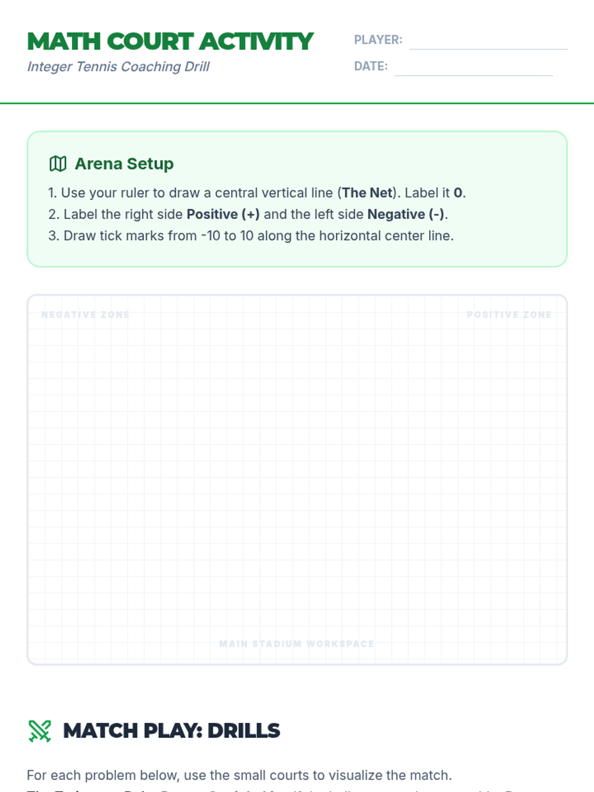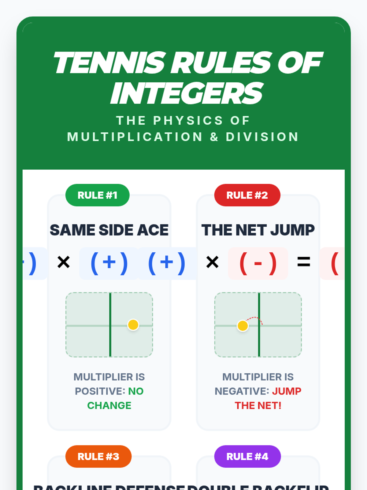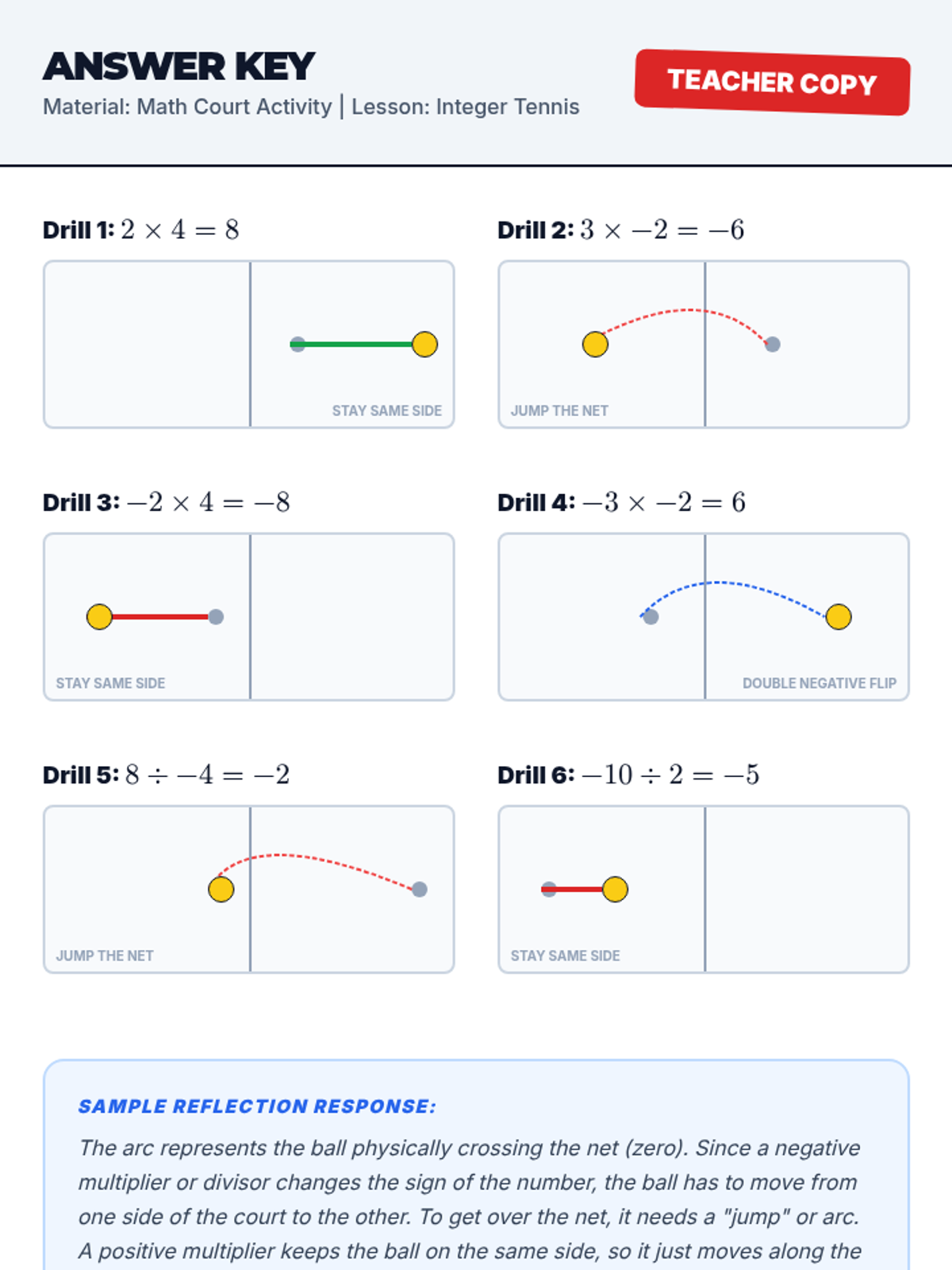 Students use a tennis court metaphor to visualize multiplying and dividing integers, understanding how positive and negative signs affect movement relative to zero.