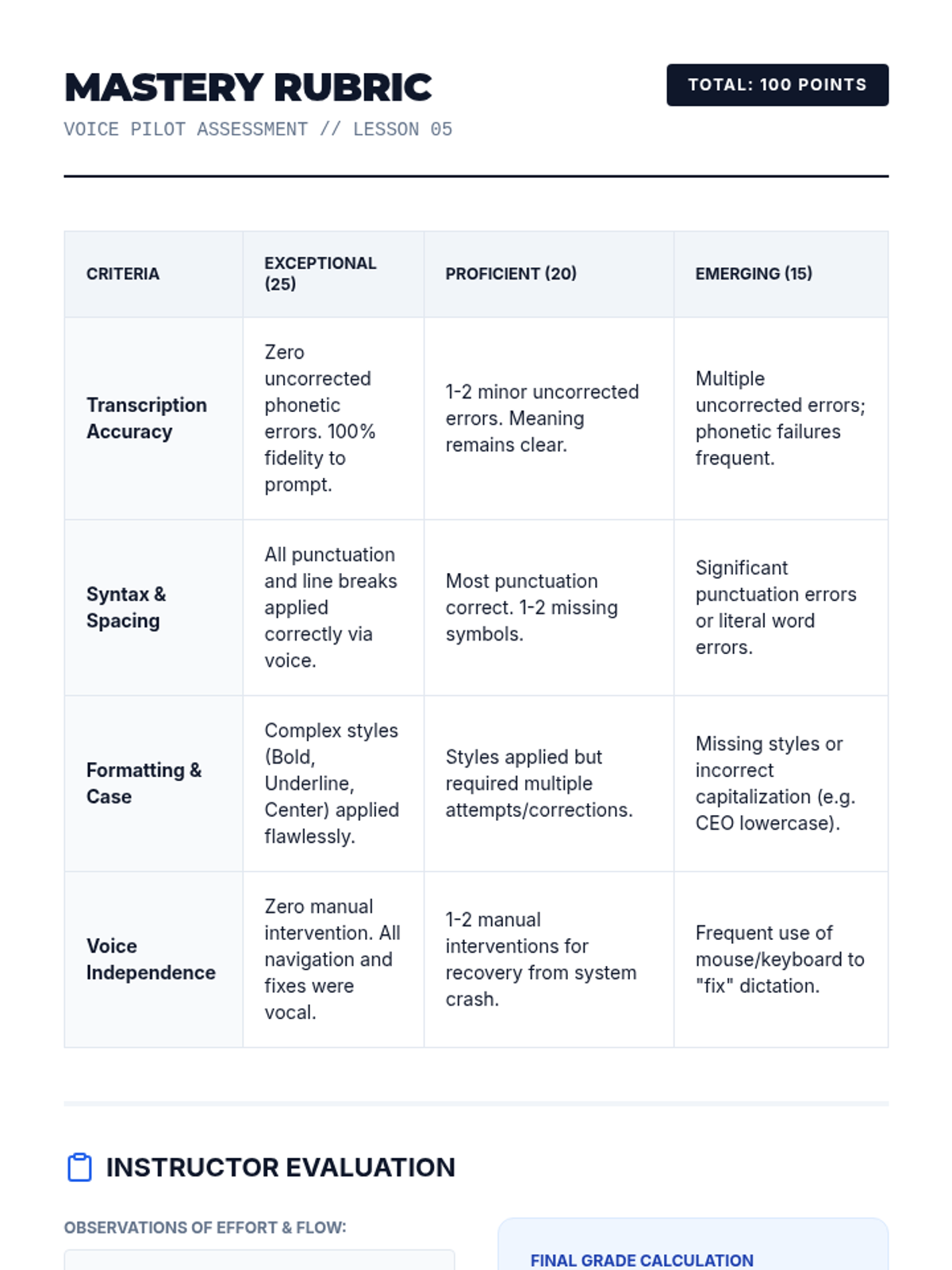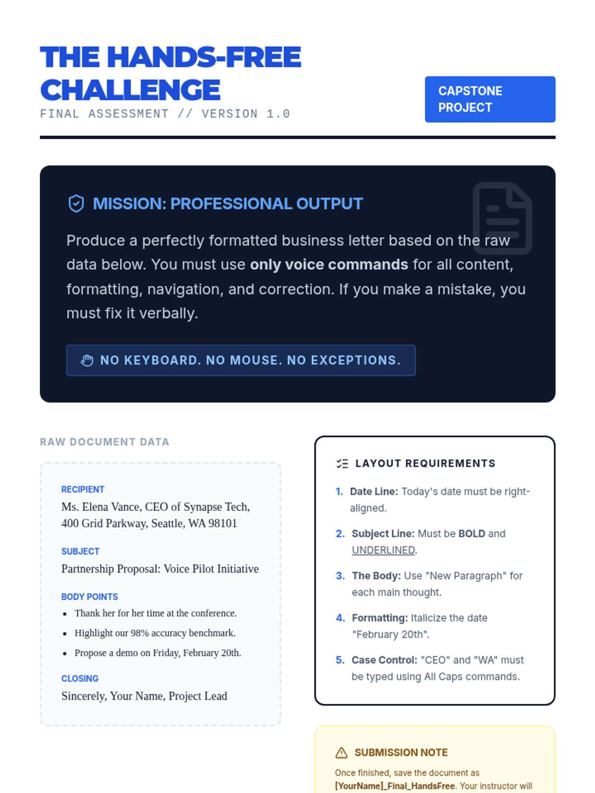 In this culminating lesson, students synthesize all previous skills to dictate a fully formatted business letter from a prompt. The focus is on maintaining flow while managing punctuation, layout, and corrections in real-time.