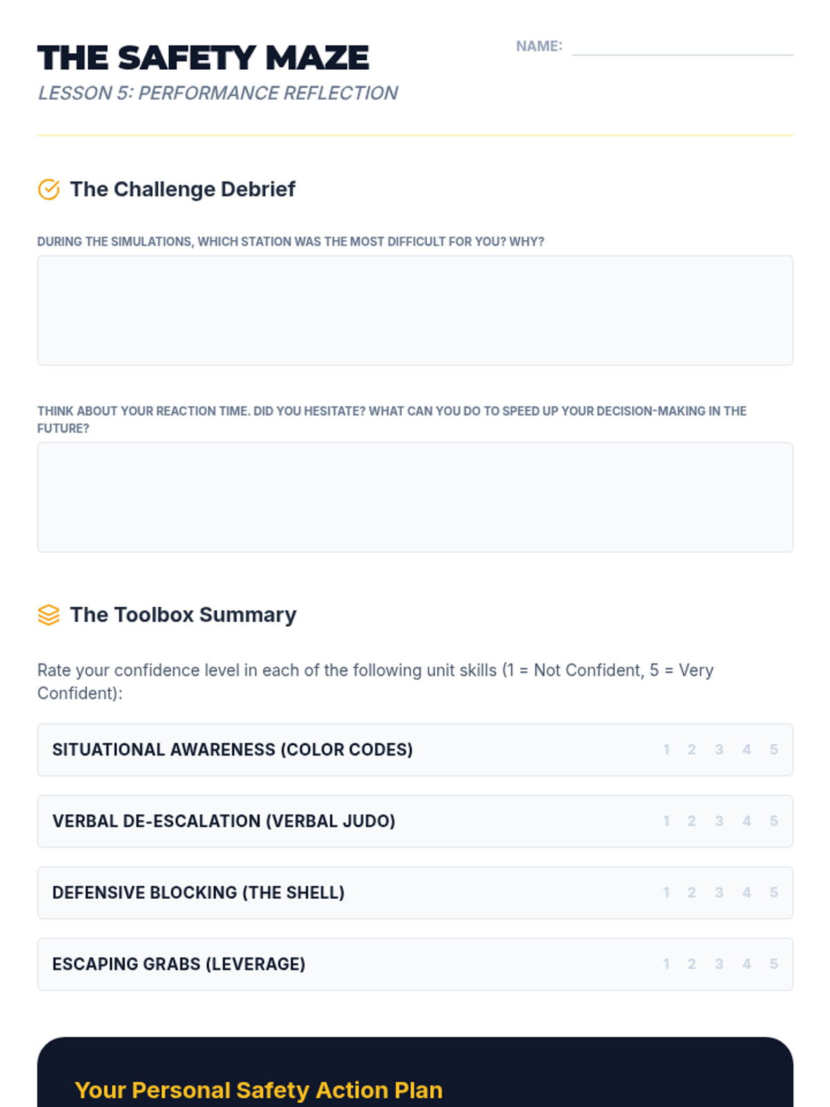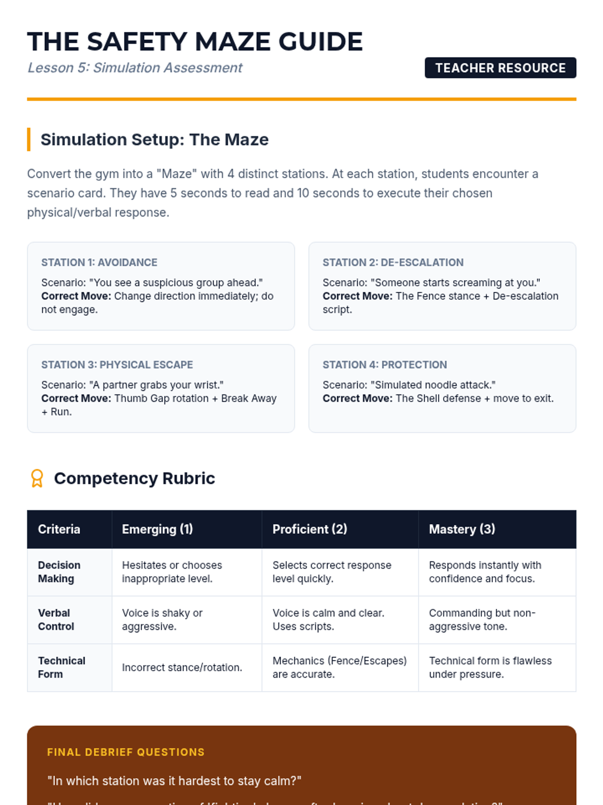 The culminating assessment where students apply the full range of skills in controlled simulations, making split-second decisions to avoid, de-escalate, or defend.