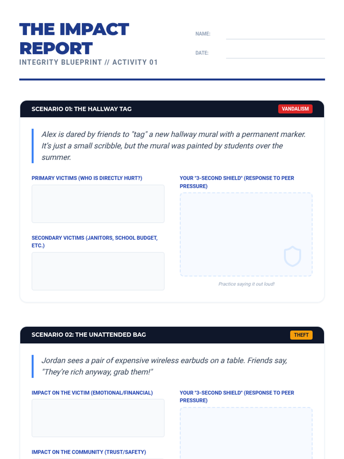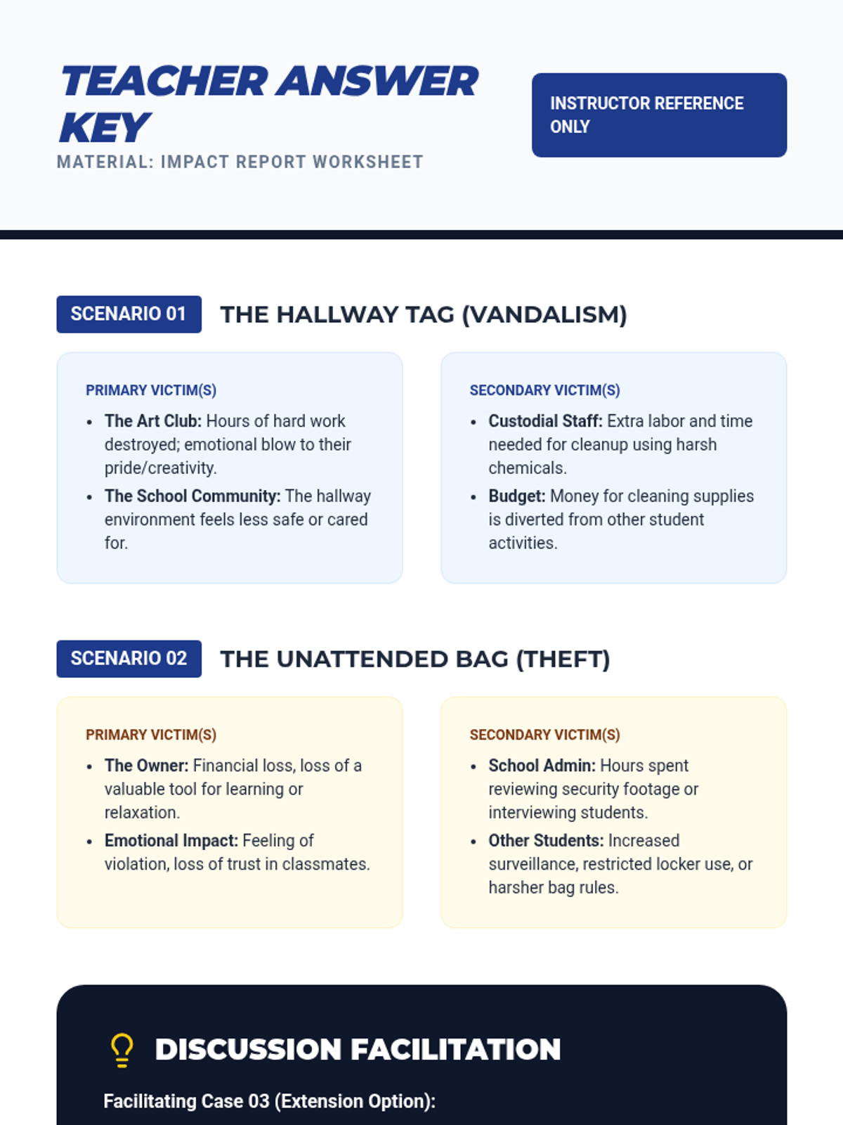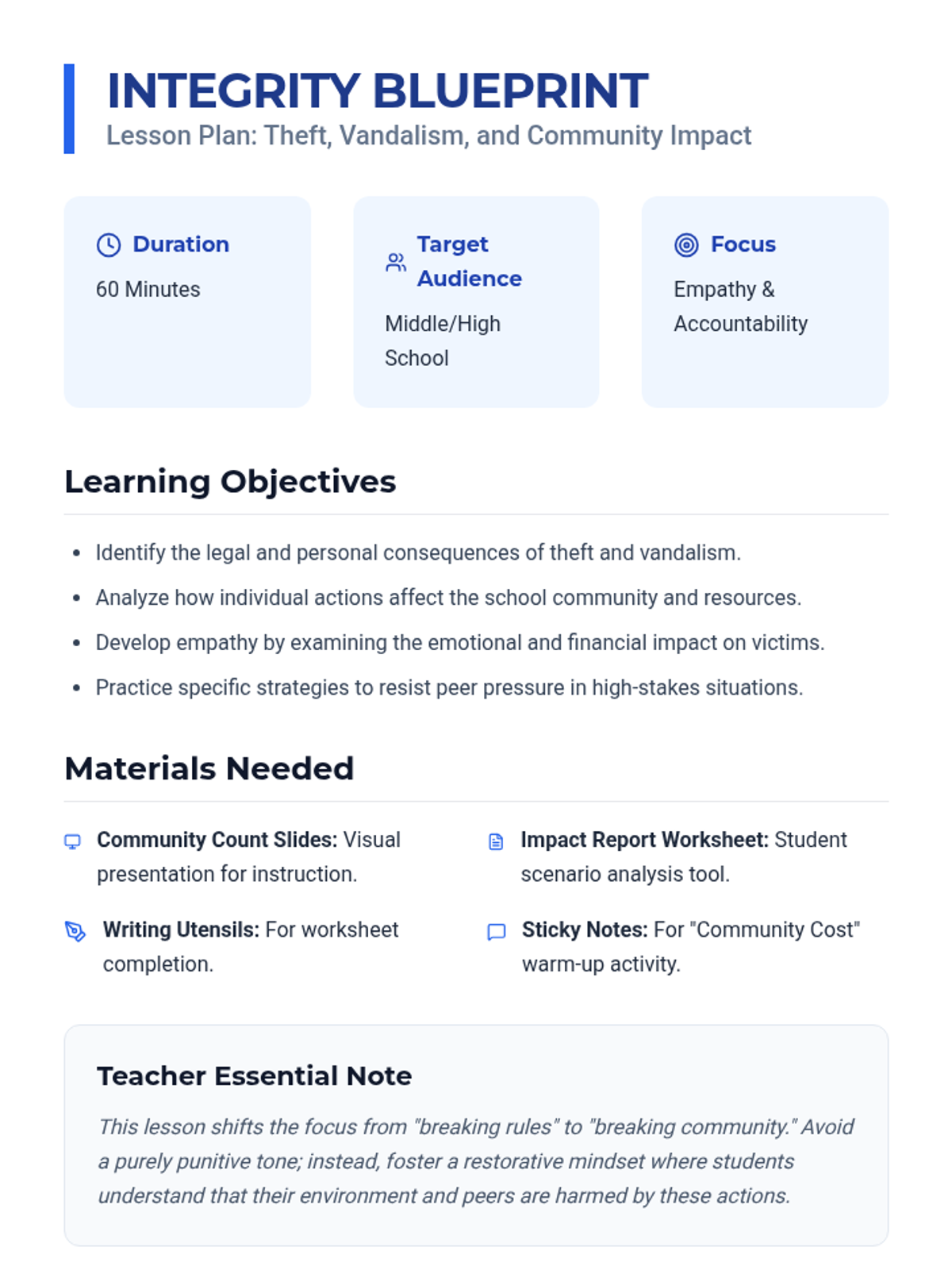 A comprehensive lesson on the personal, legal, and community consequences of theft and vandalism, focusing on empathy and resisting peer pressure.