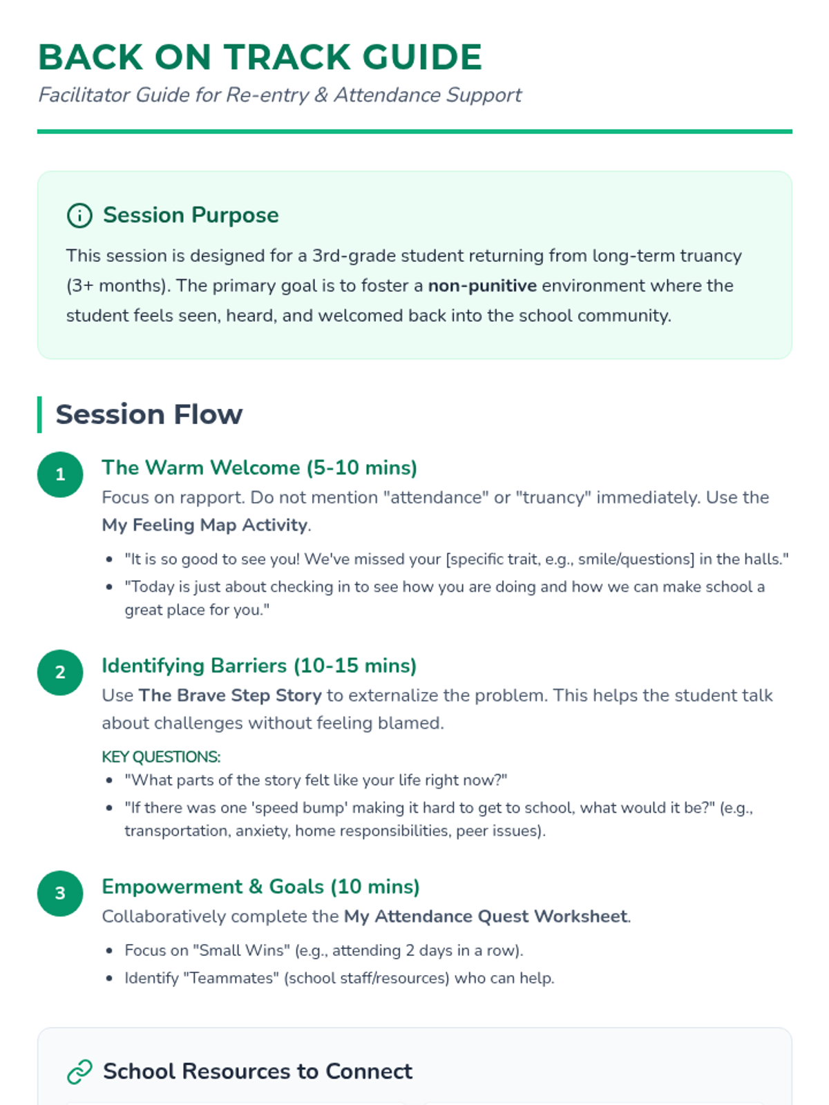 A supportive one-on-one counseling session designed to welcome a student back after long-term truancy, focusing on rapport-building, identifying barriers, and collaborative goal-setting.