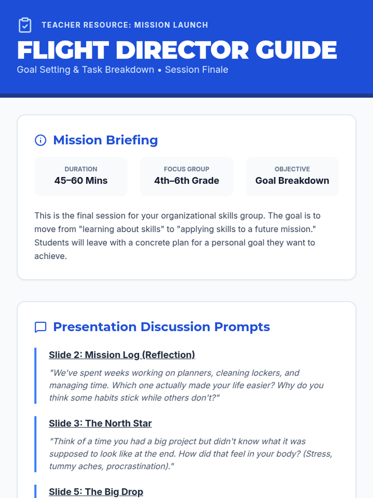The final session for a group of 4th-6th graders focused on setting SMART goals and breaking down complex tasks into manageable steps using a Mission Control theme.