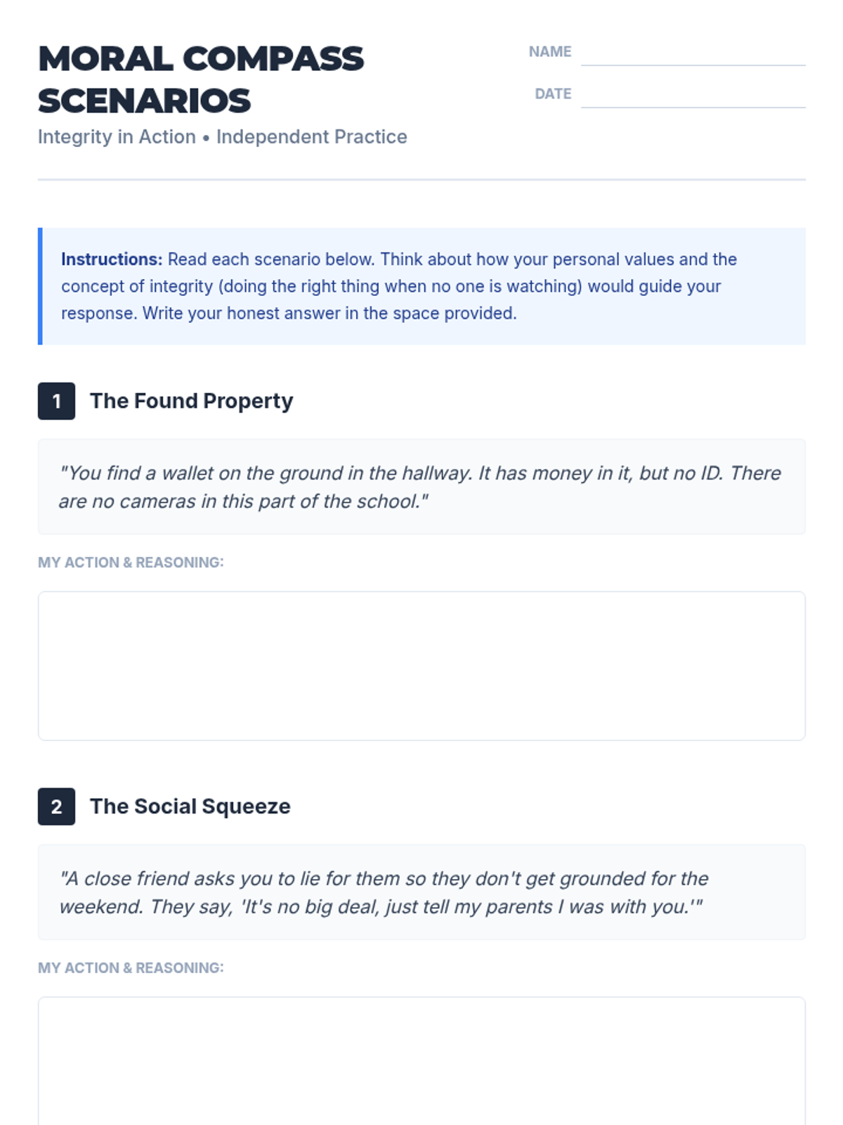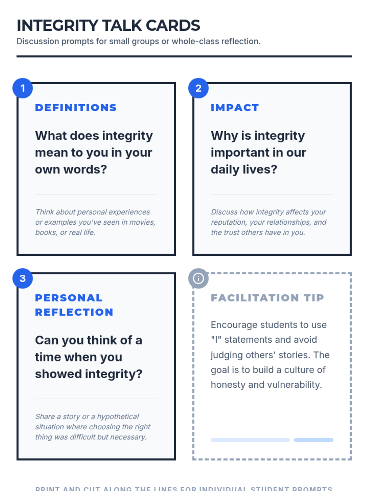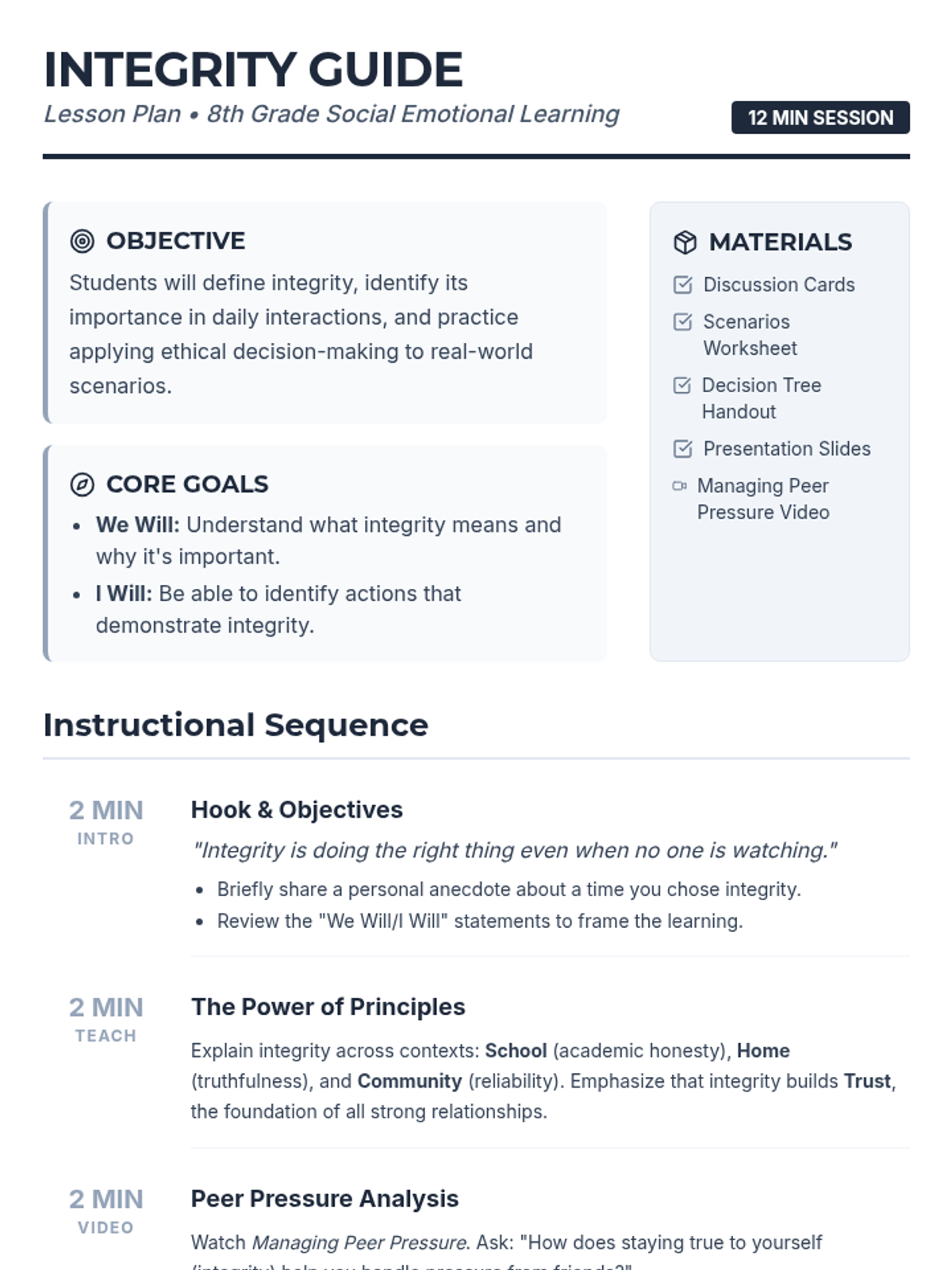 This lesson introduces 8th-grade students to the concept of integrity, emphasizing its importance in everyday life. Through engaging activities, students will learn to identify and practice integrity in various scenarios, helping them develop strong moral principles and ethical behavior.